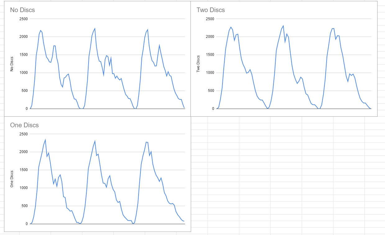 At one point, I wanted to see if there was a way to automatically detect how many discs were in the conveyor. I ran some tests to see if I could detect a difference in the power draw from the slider depending on how many discs it's pushing.