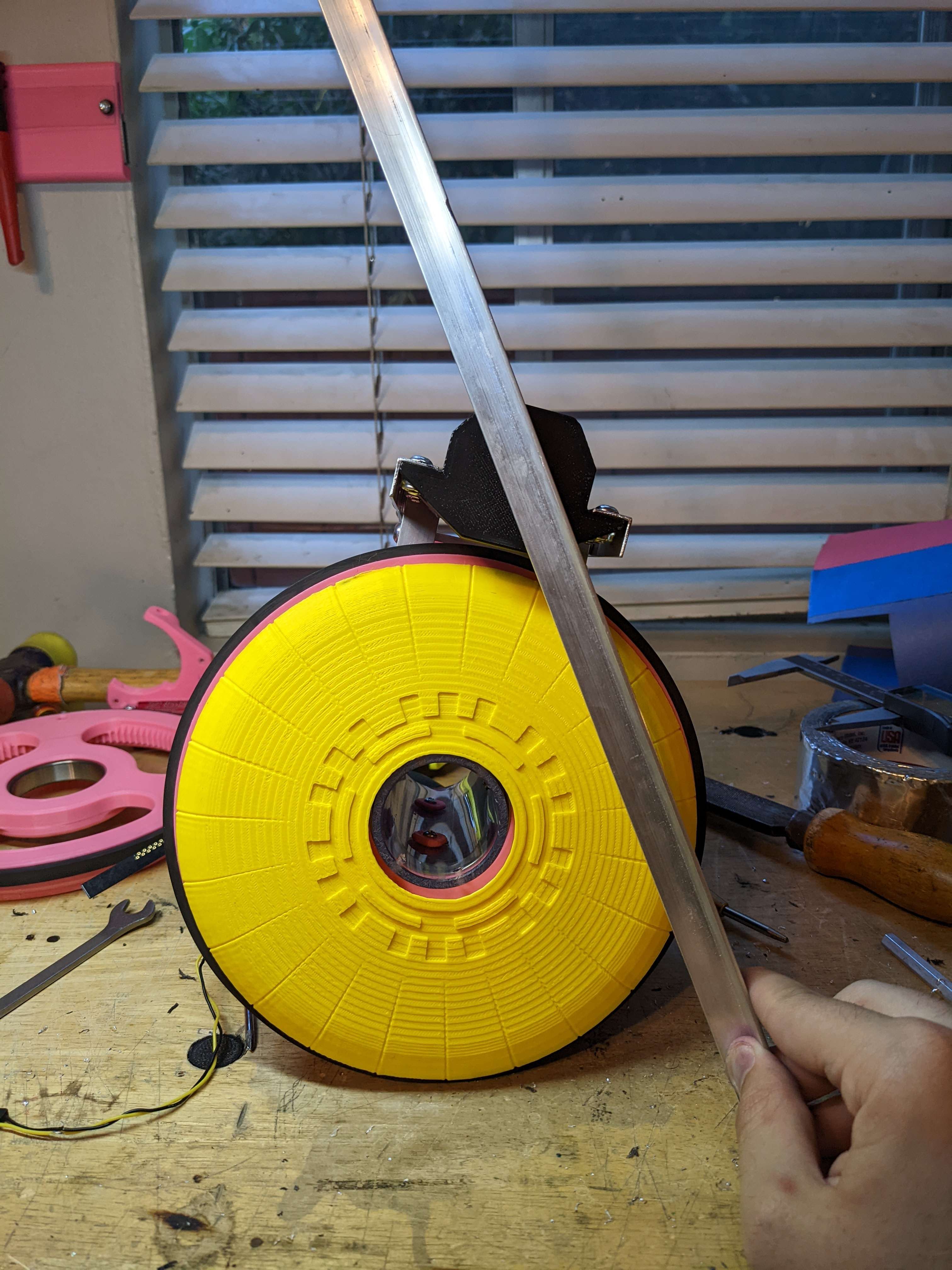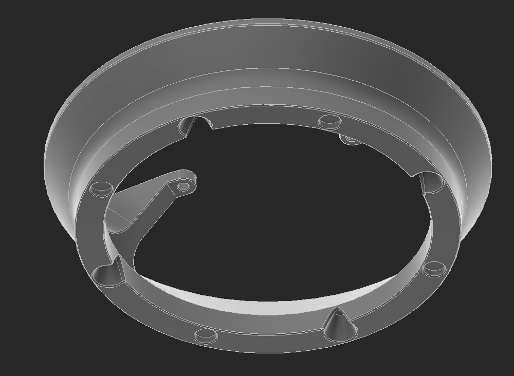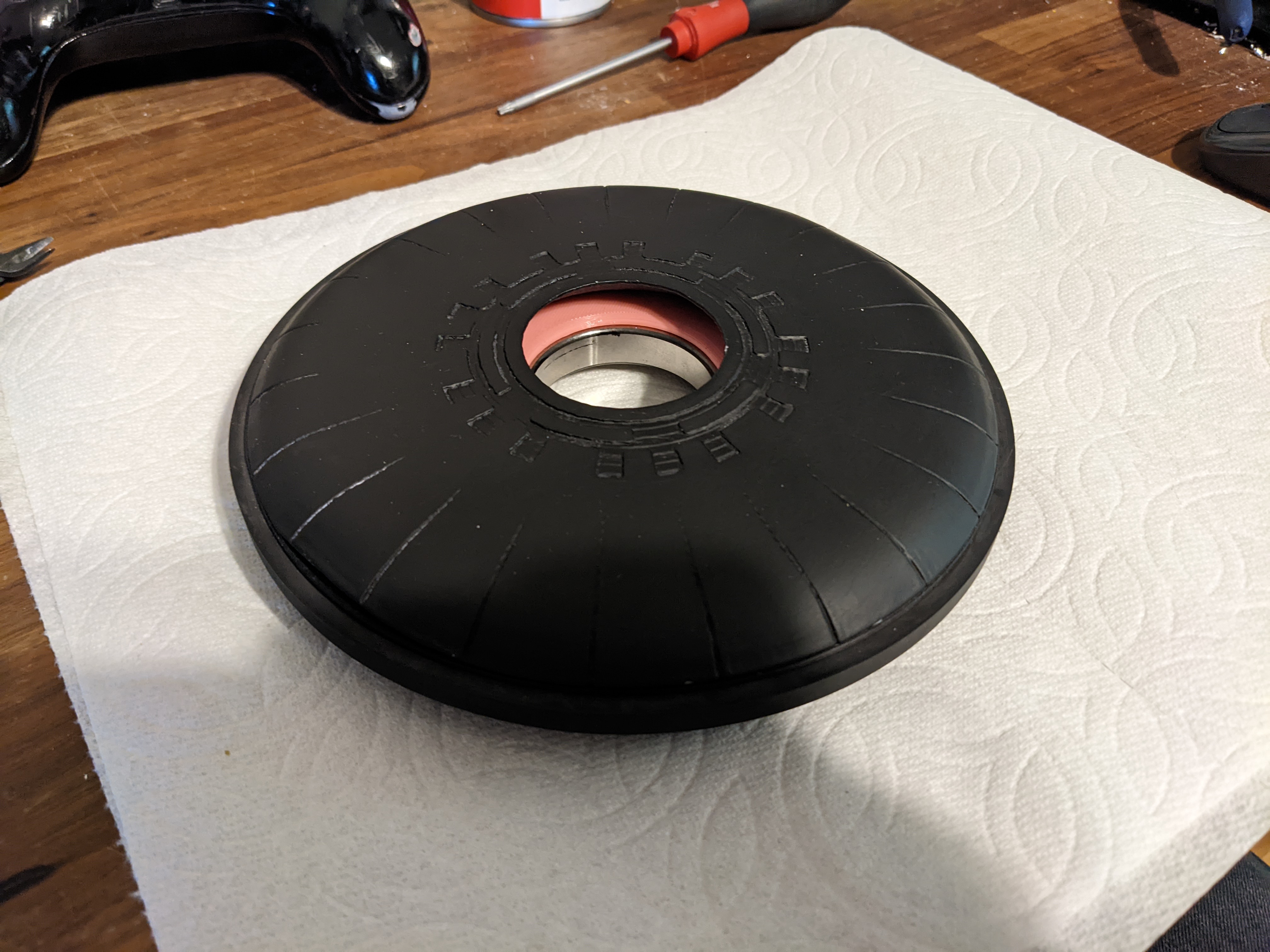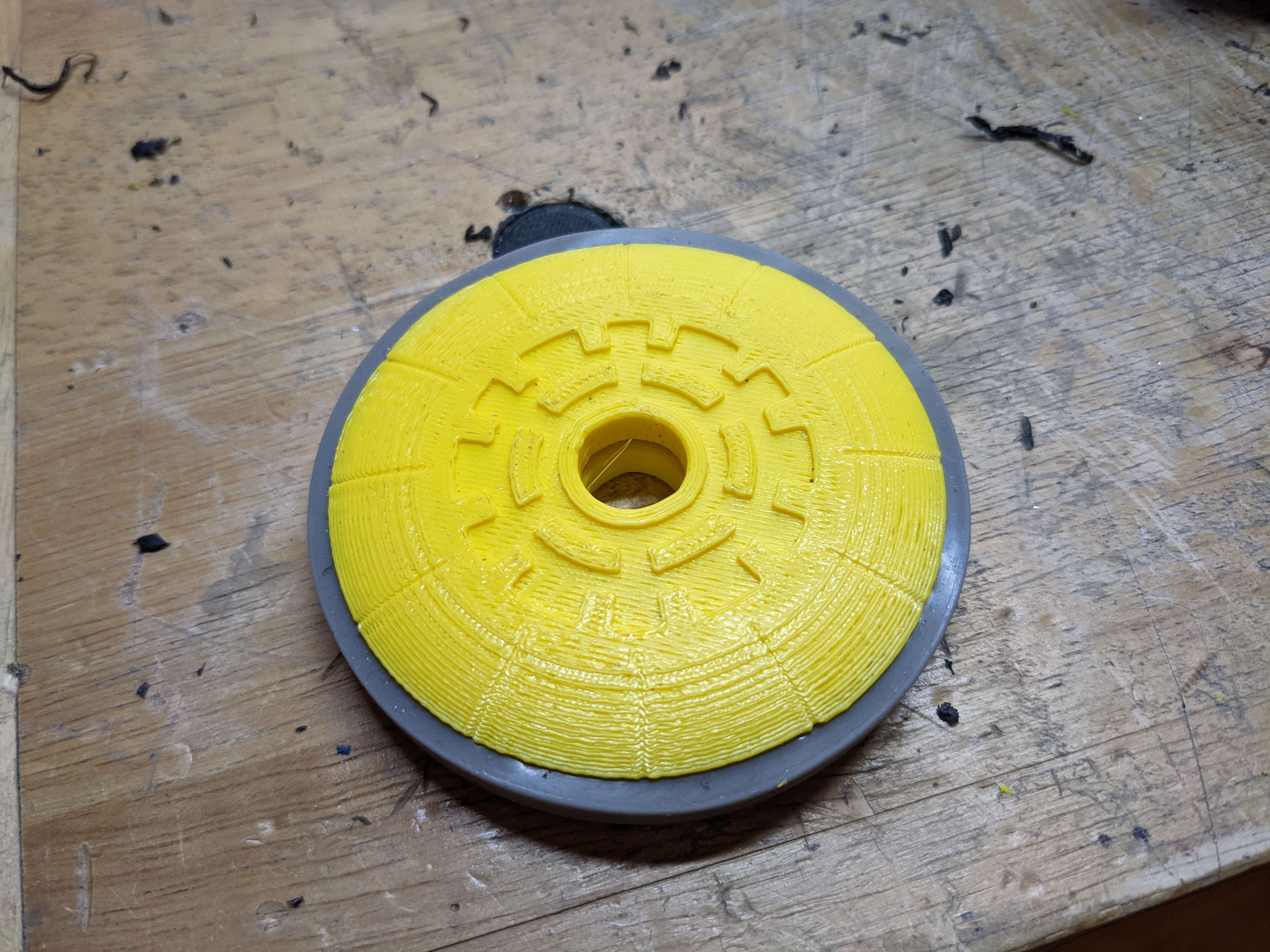 Through this, I also realized that any decorative cover that goes over the wheel is affected by this. There is a limit to the thickness of it based on the leg mount shown above because there is a slight overhang on the leg mount to the wheel. I made a test wheel cap to make sure clearance is all good.