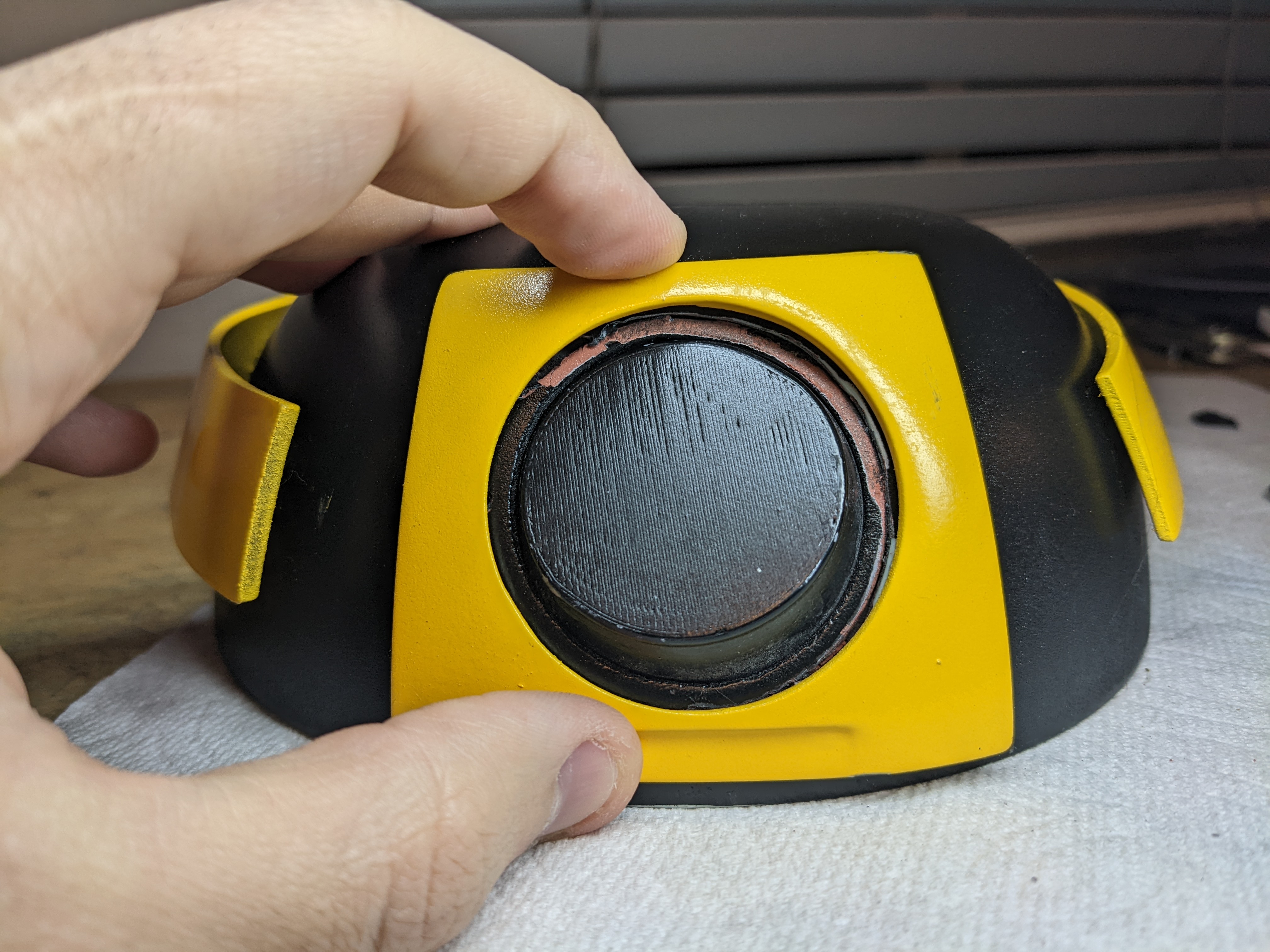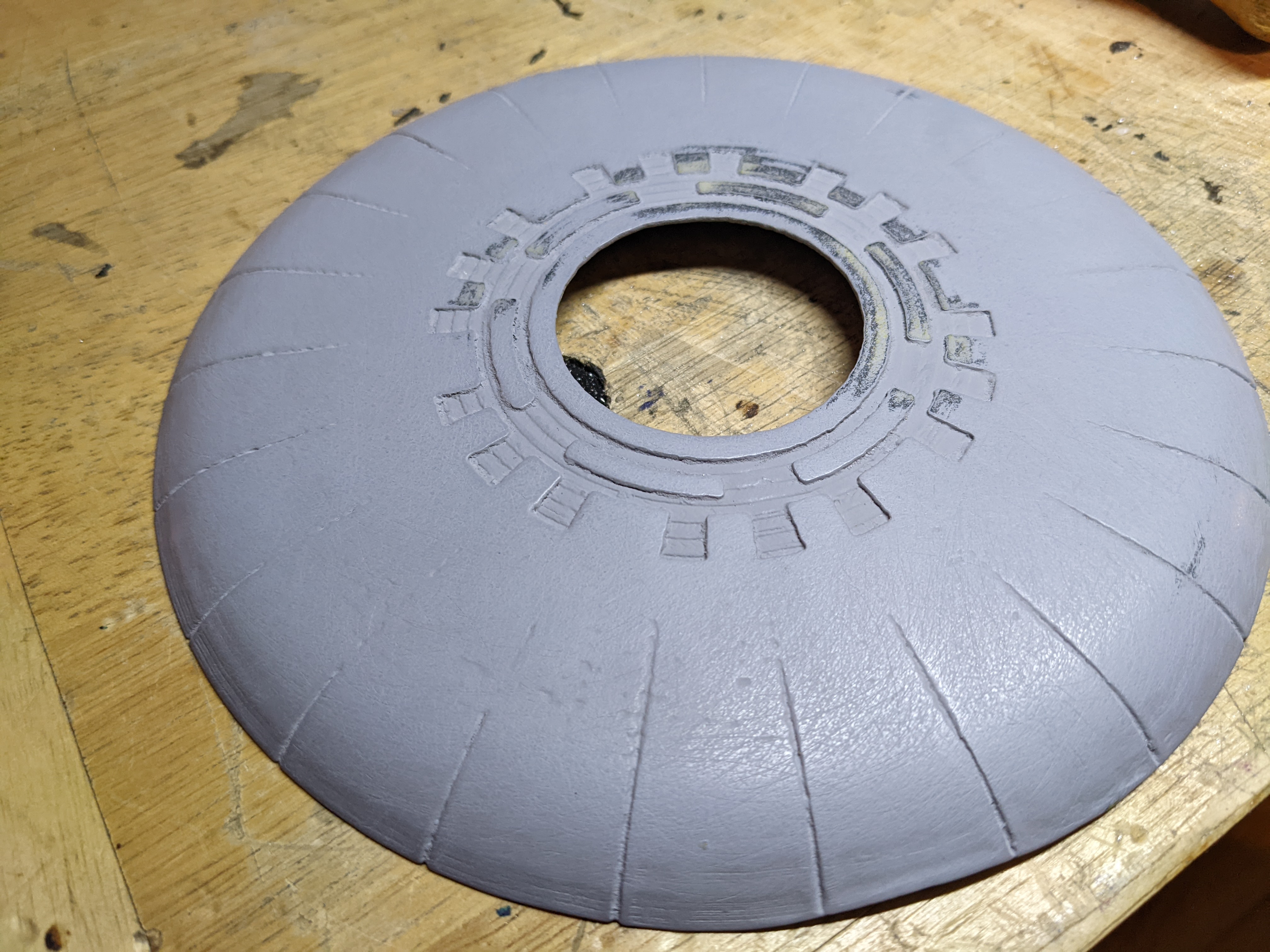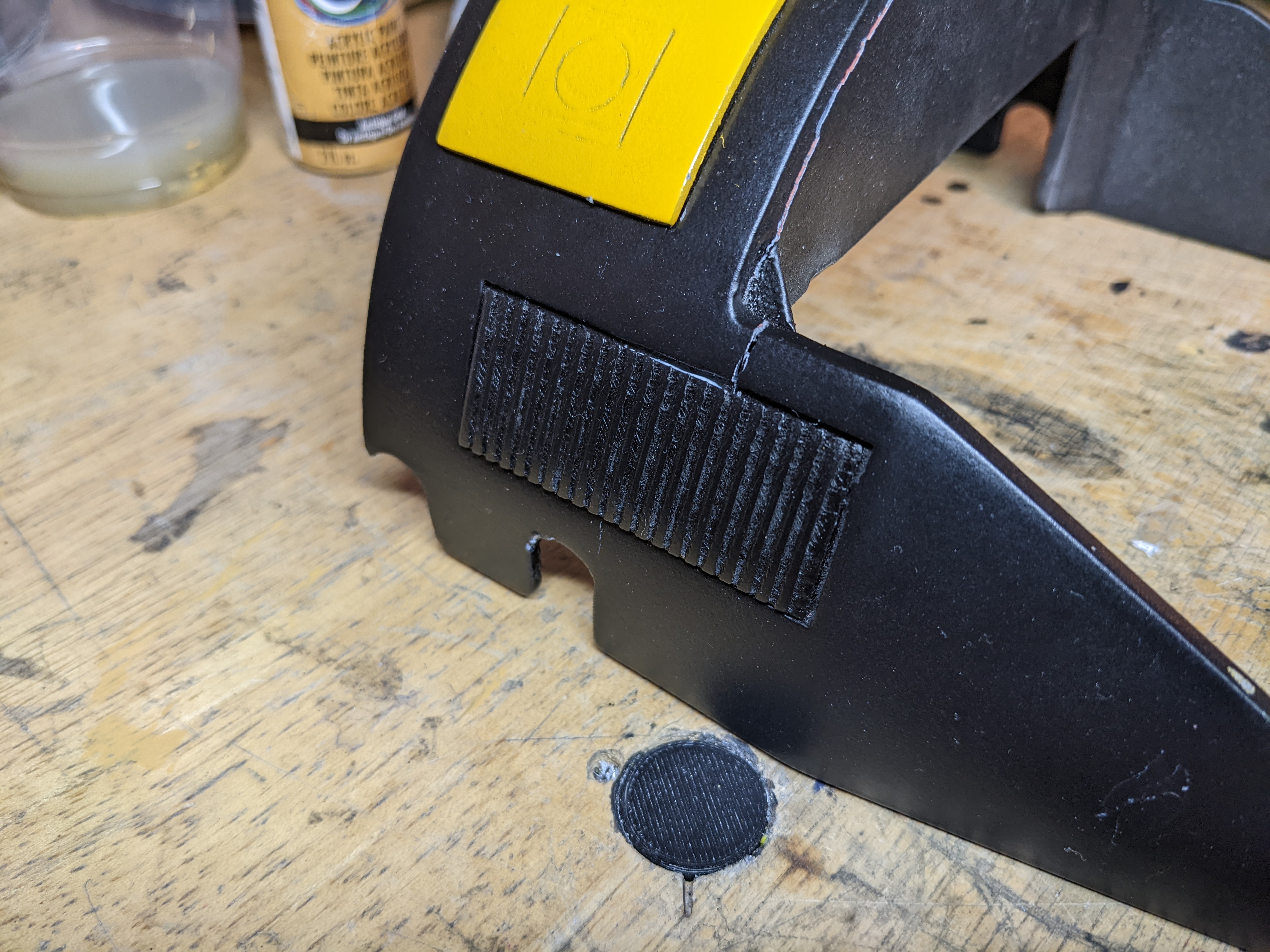 Through this, I also realized that any decorative cover that goes over the wheel is affected by this. There is a limit to the thickness of it based on the leg mount shown above because there is a slight overhang on the leg mount to the wheel. I made a test wheel cap to make sure clearance is all good.