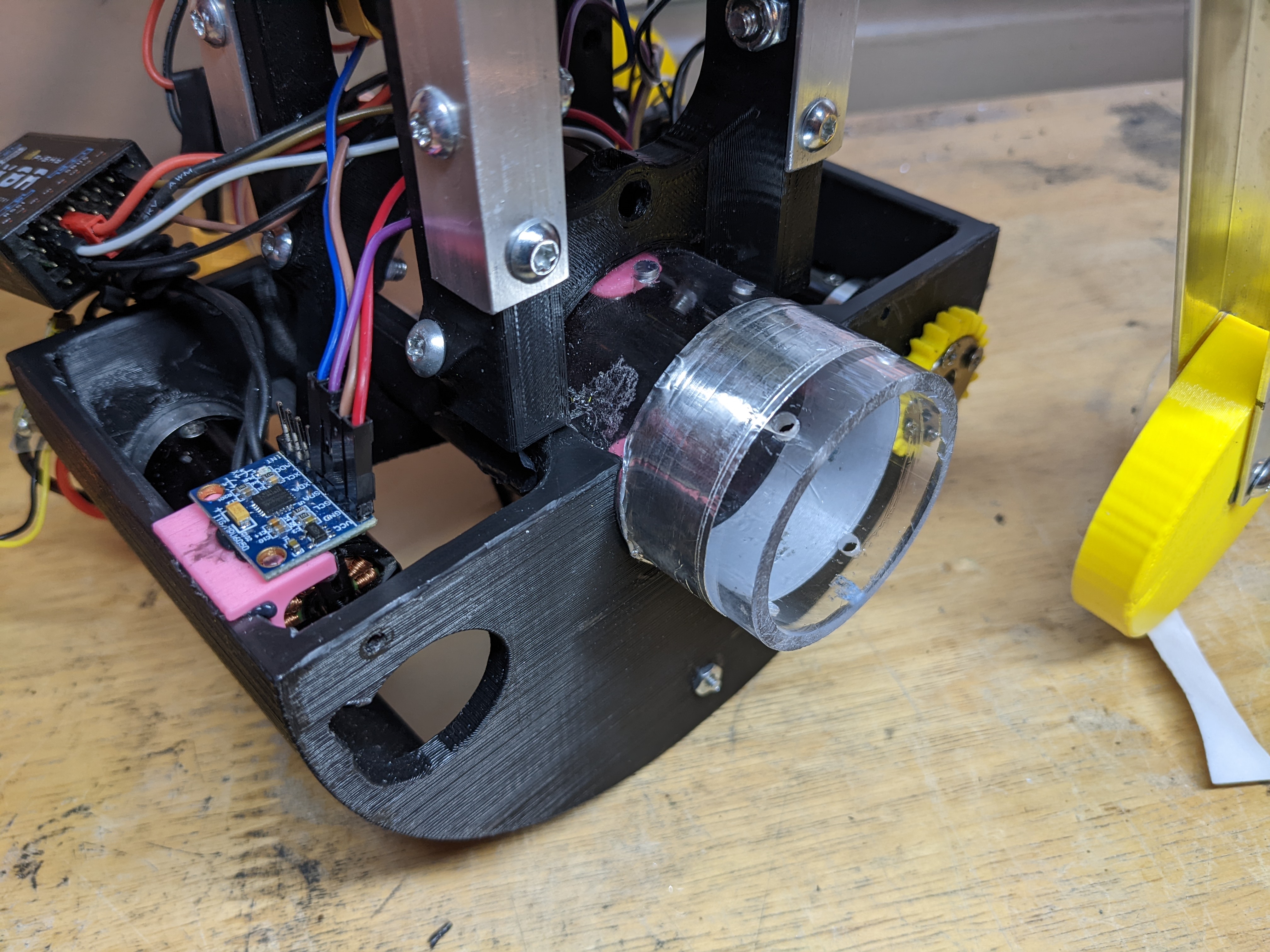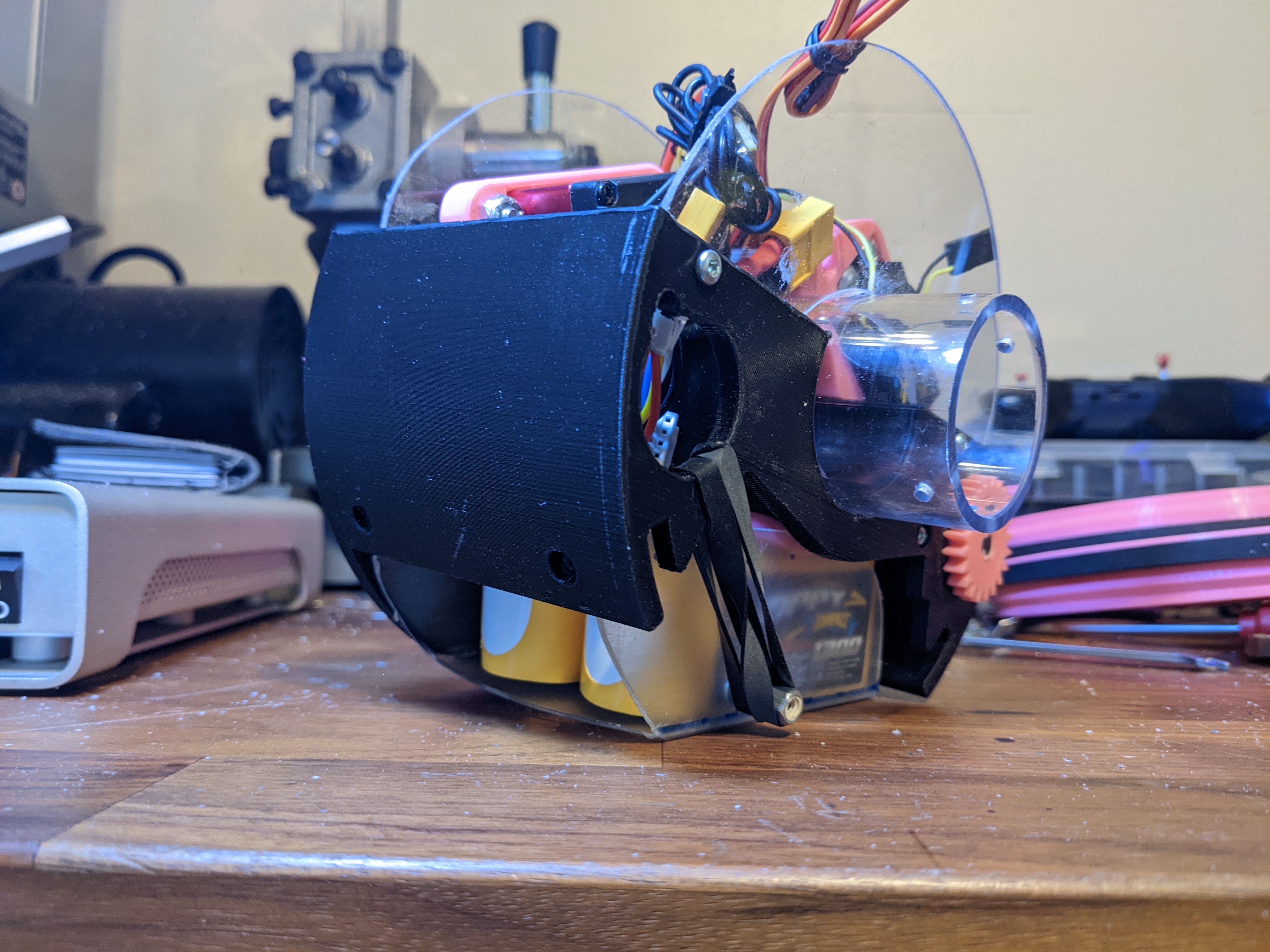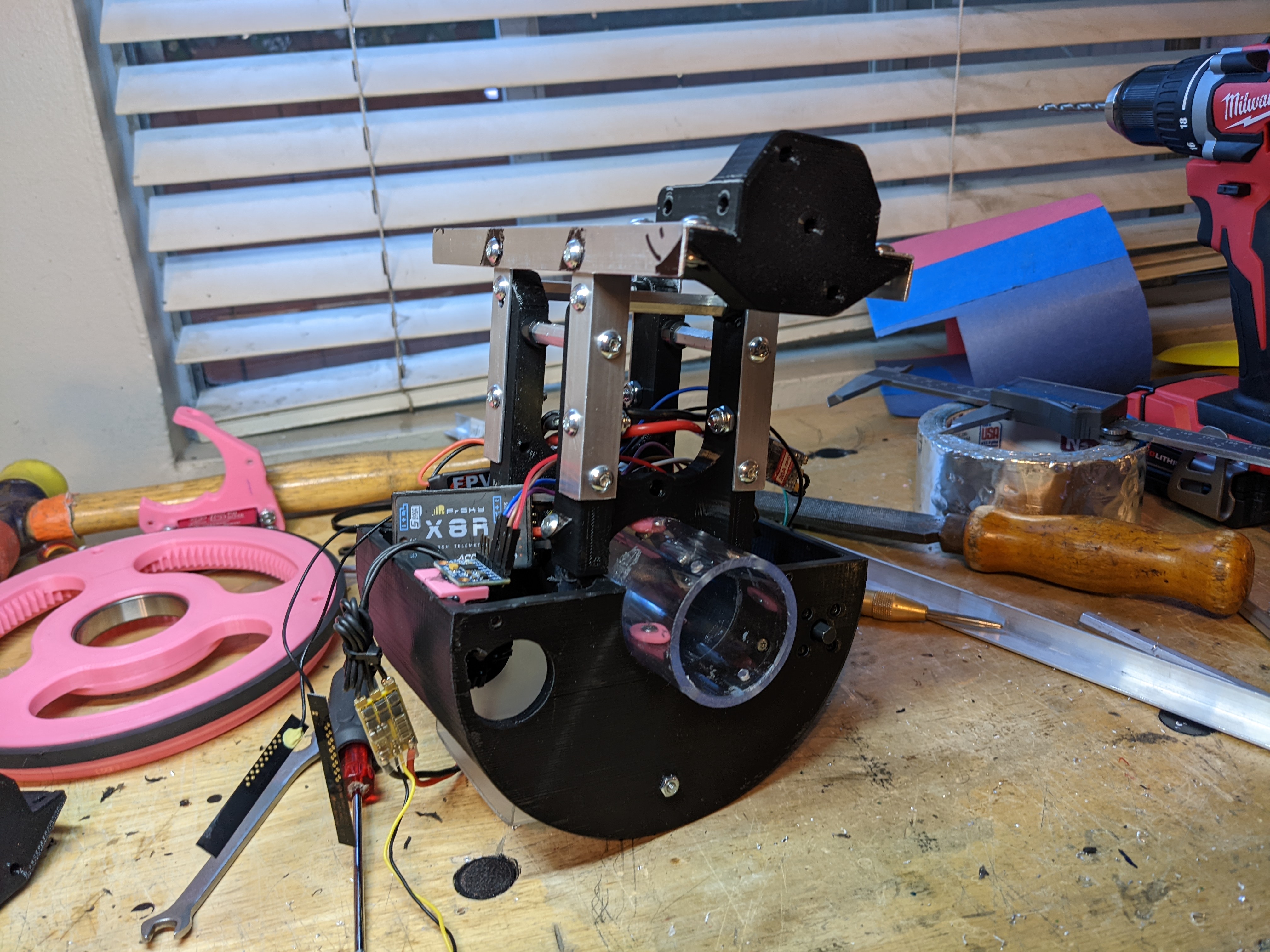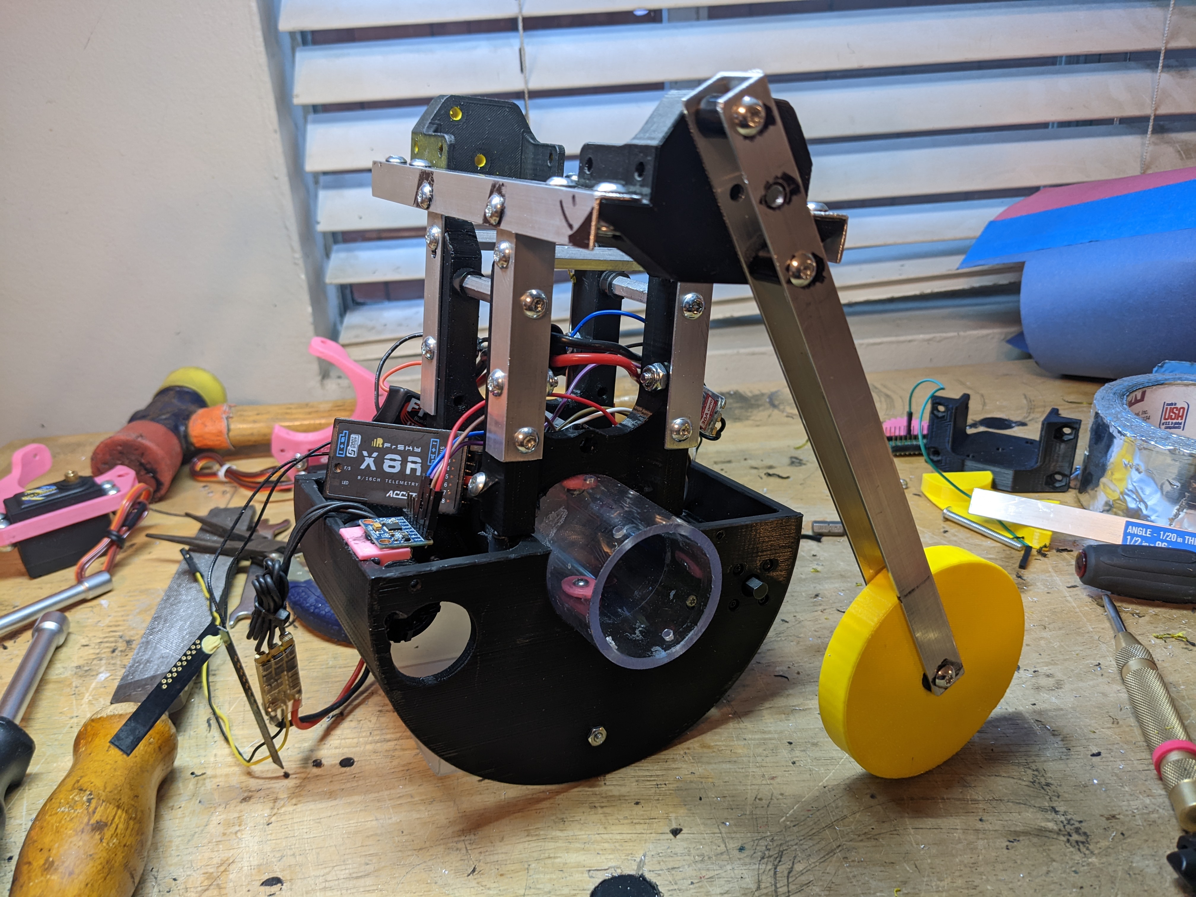 The chassis is built around a 3D printed half circle, with aluminum angle coming up for everything non-wheel related to get mounted to.