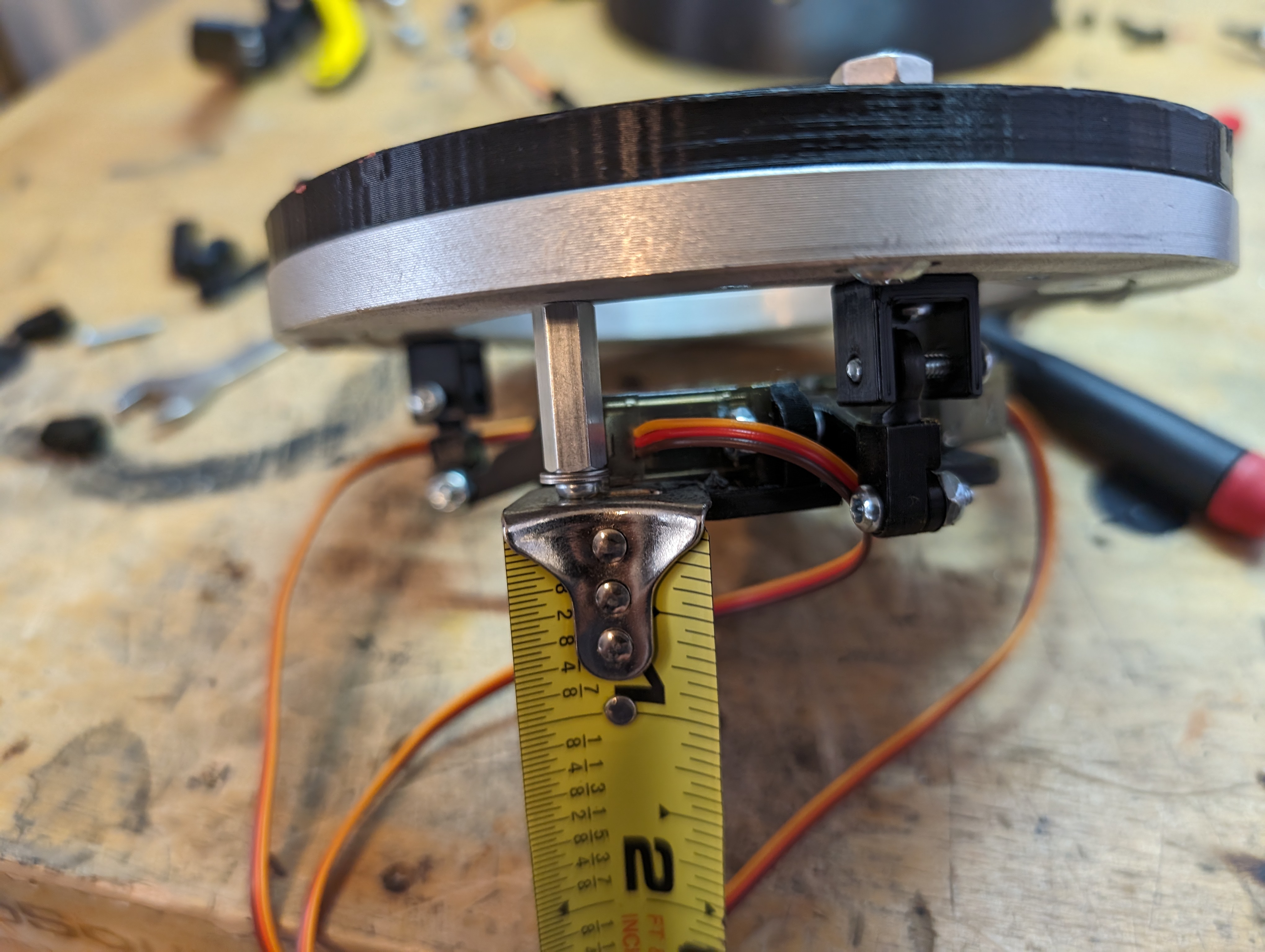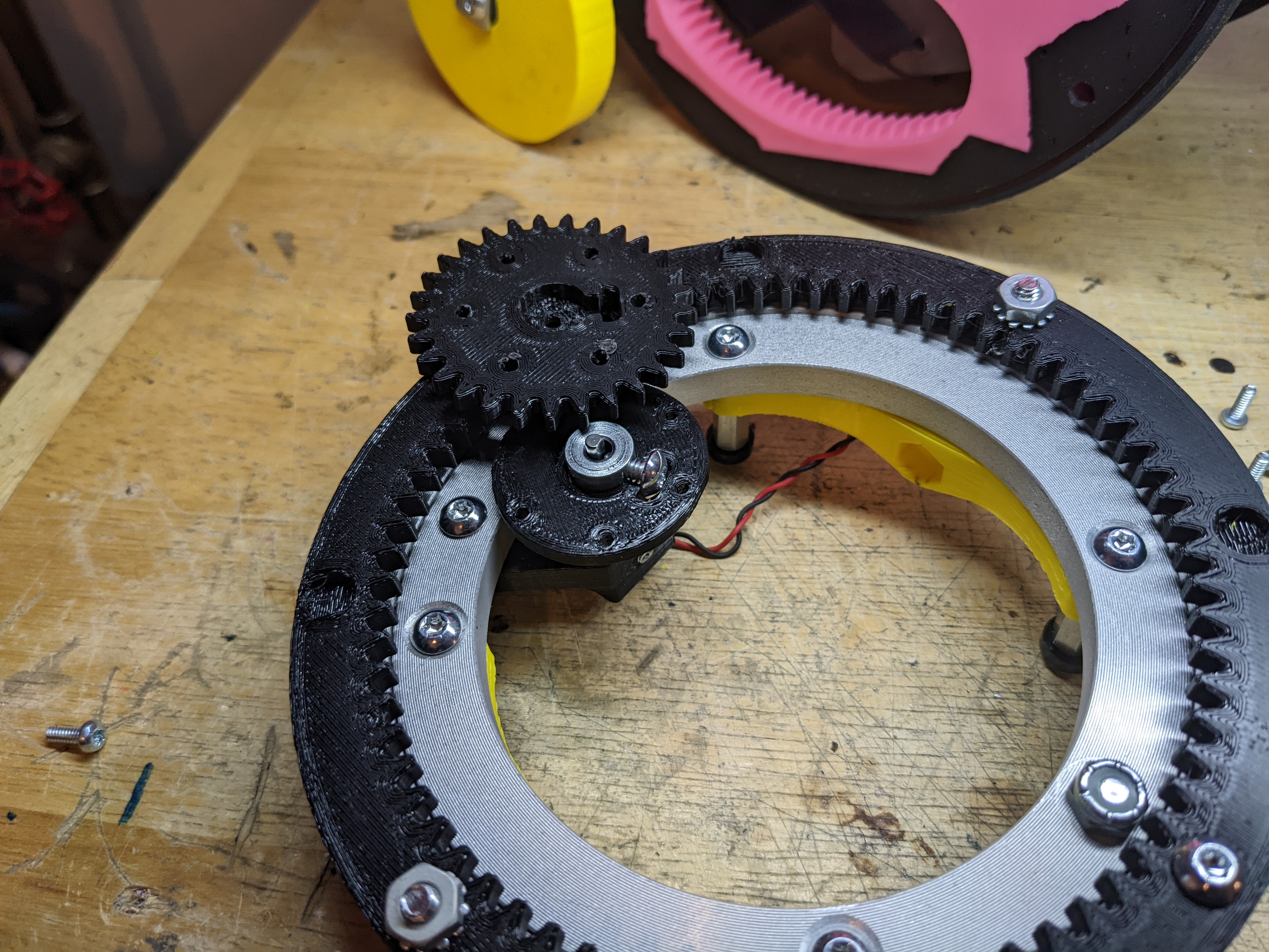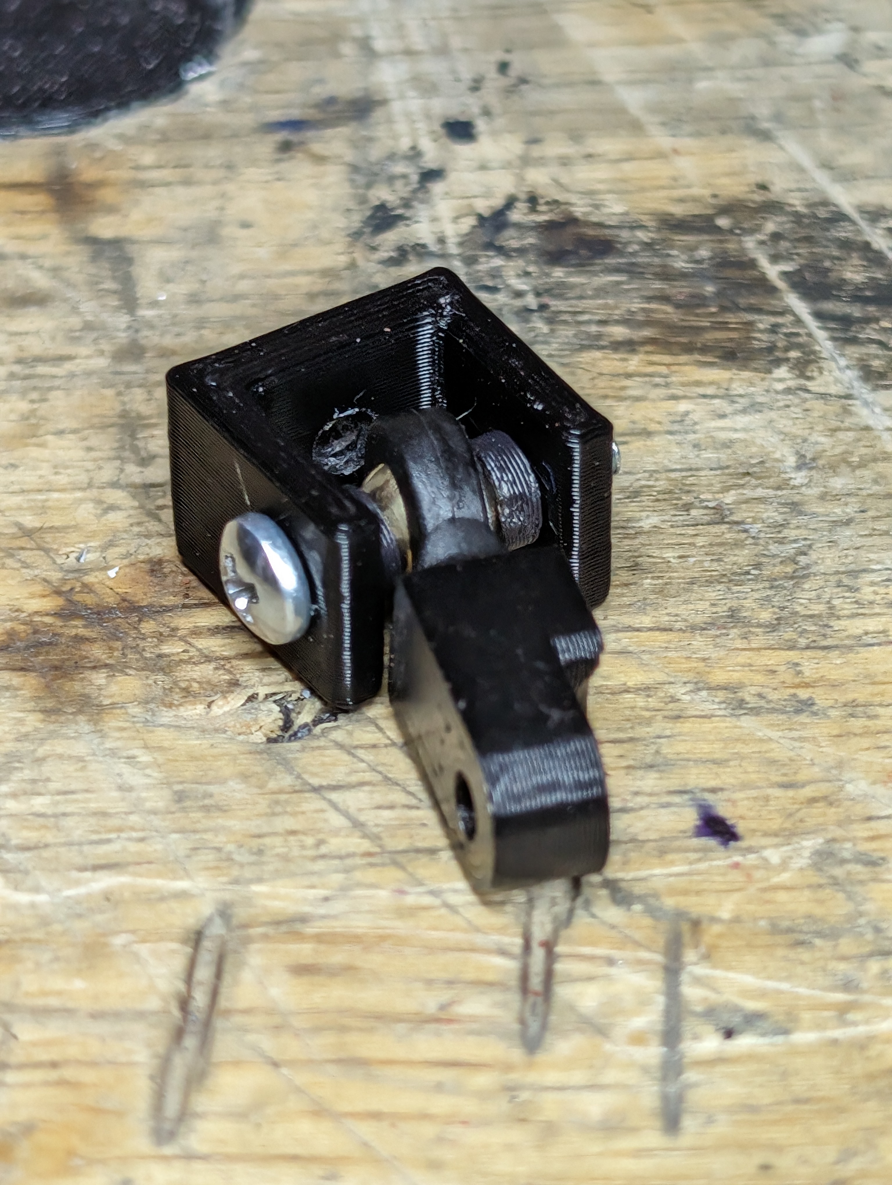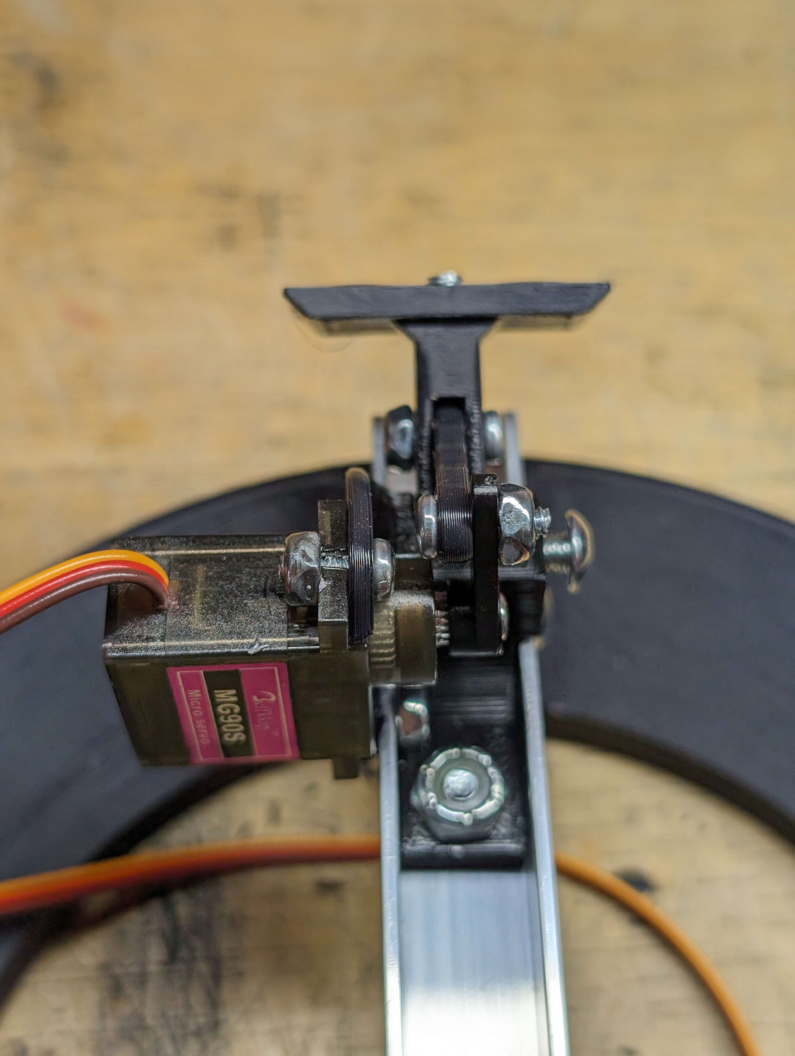 I printed mounts for the lazy susan with space for bushings, and printed brackets to hold a screw that the entire lazy susan pivots off of.