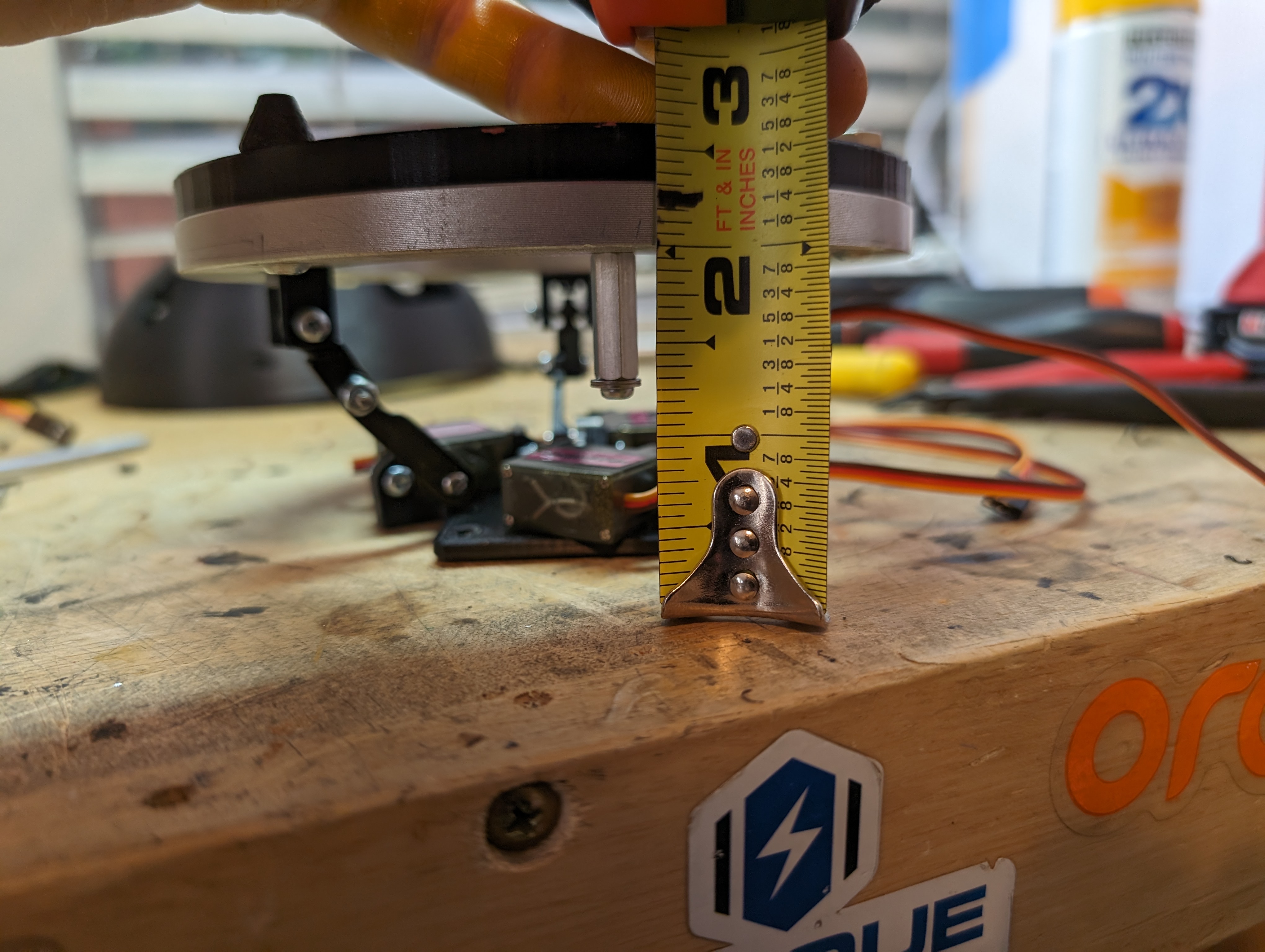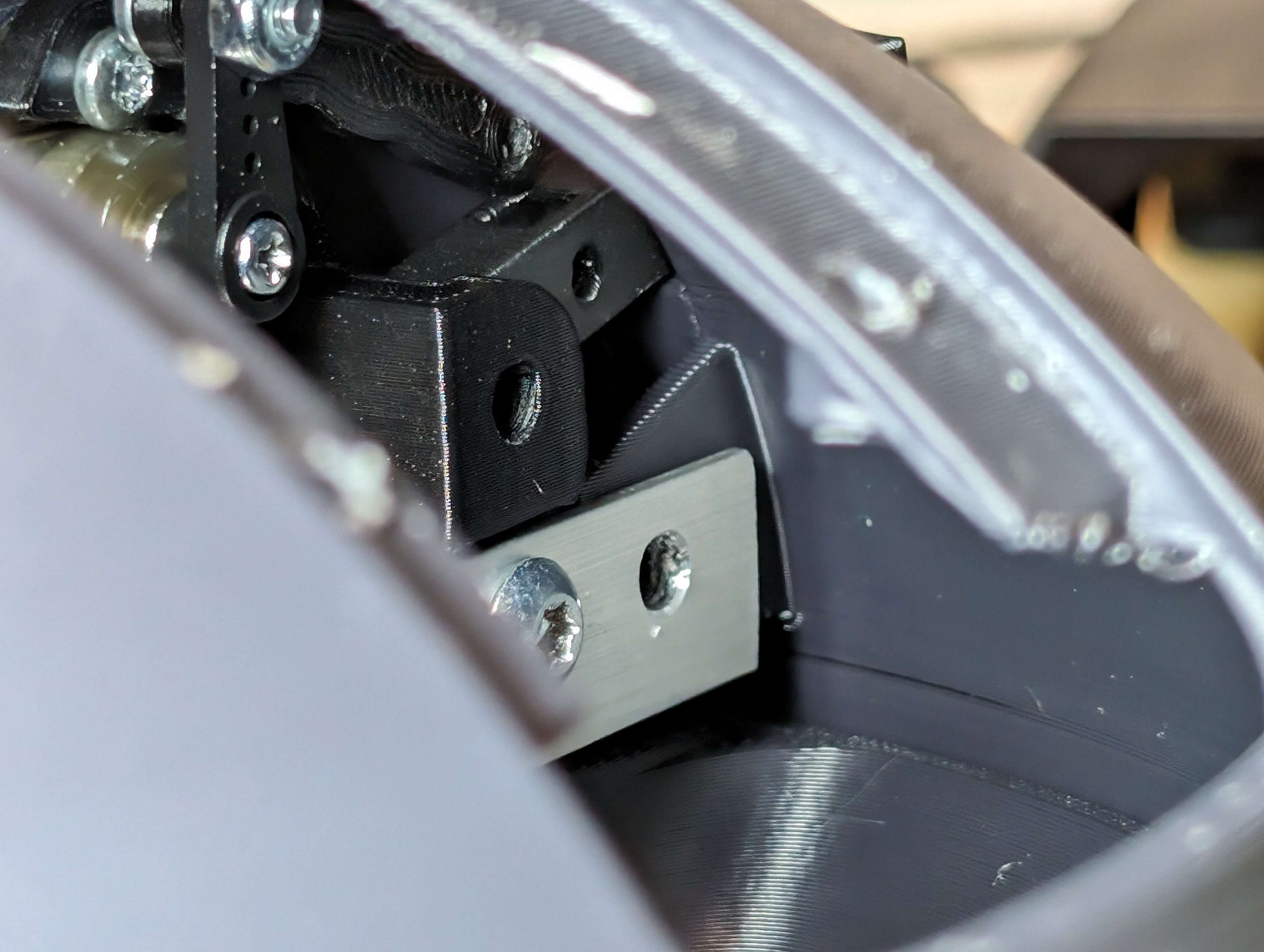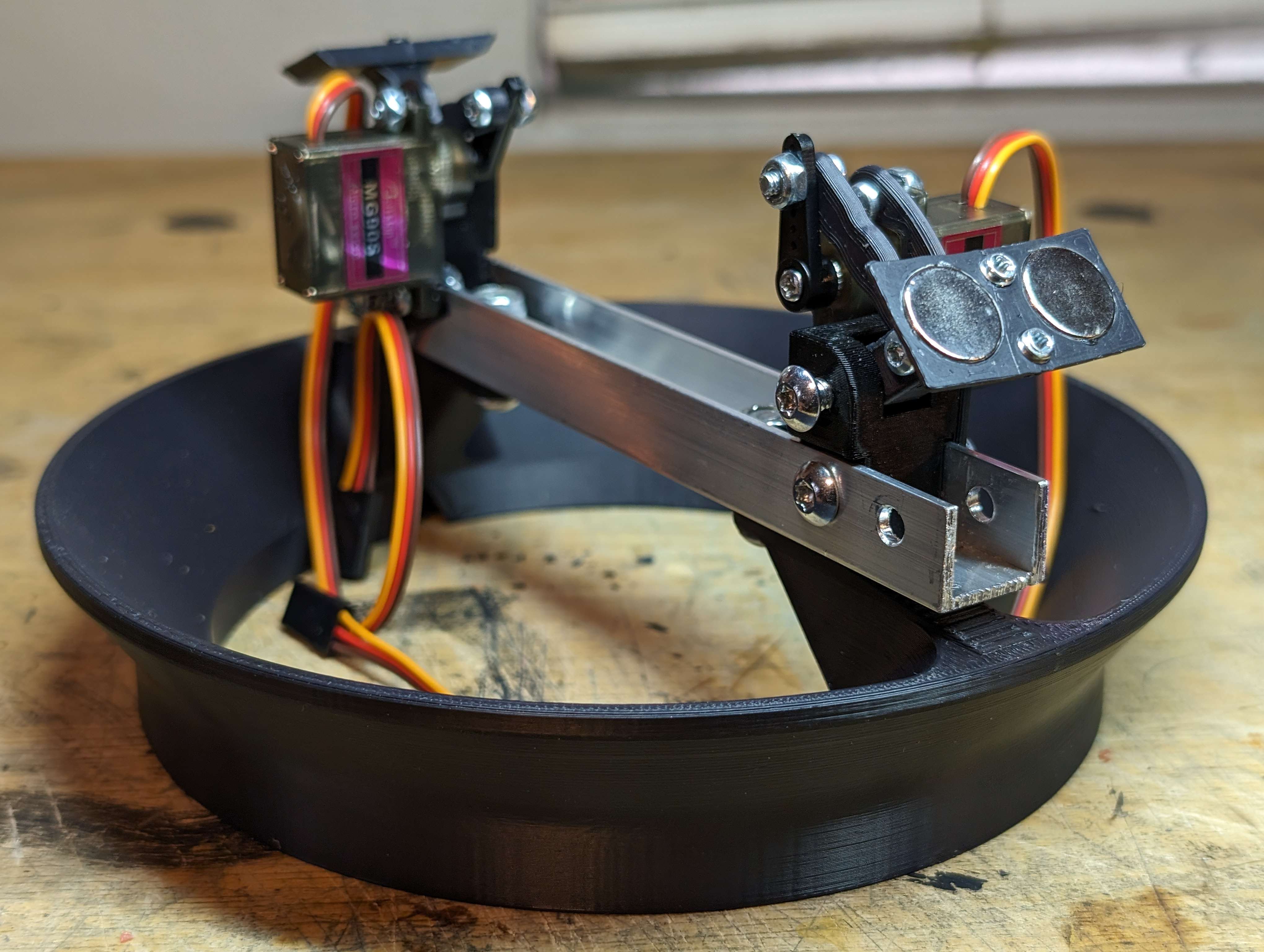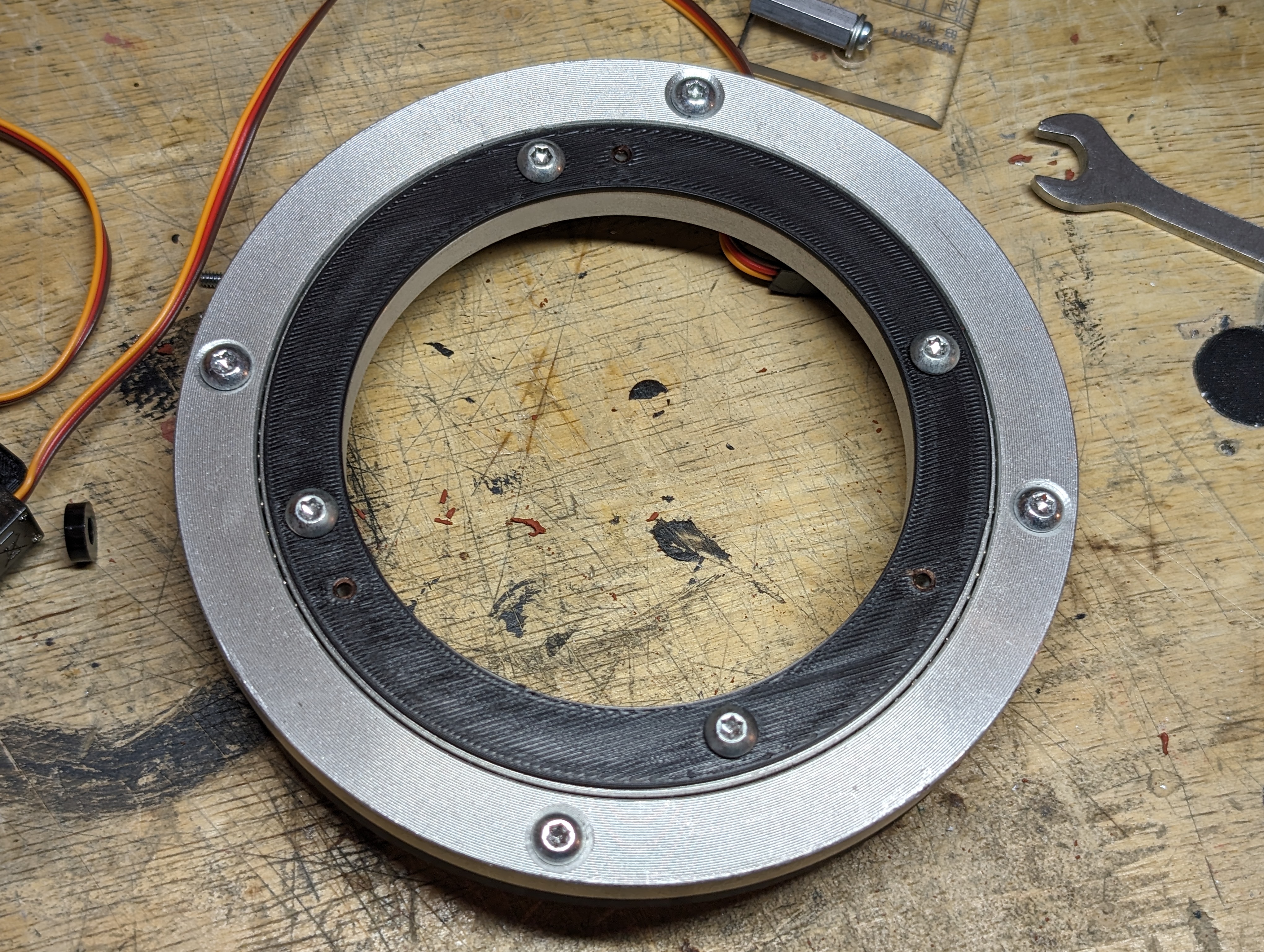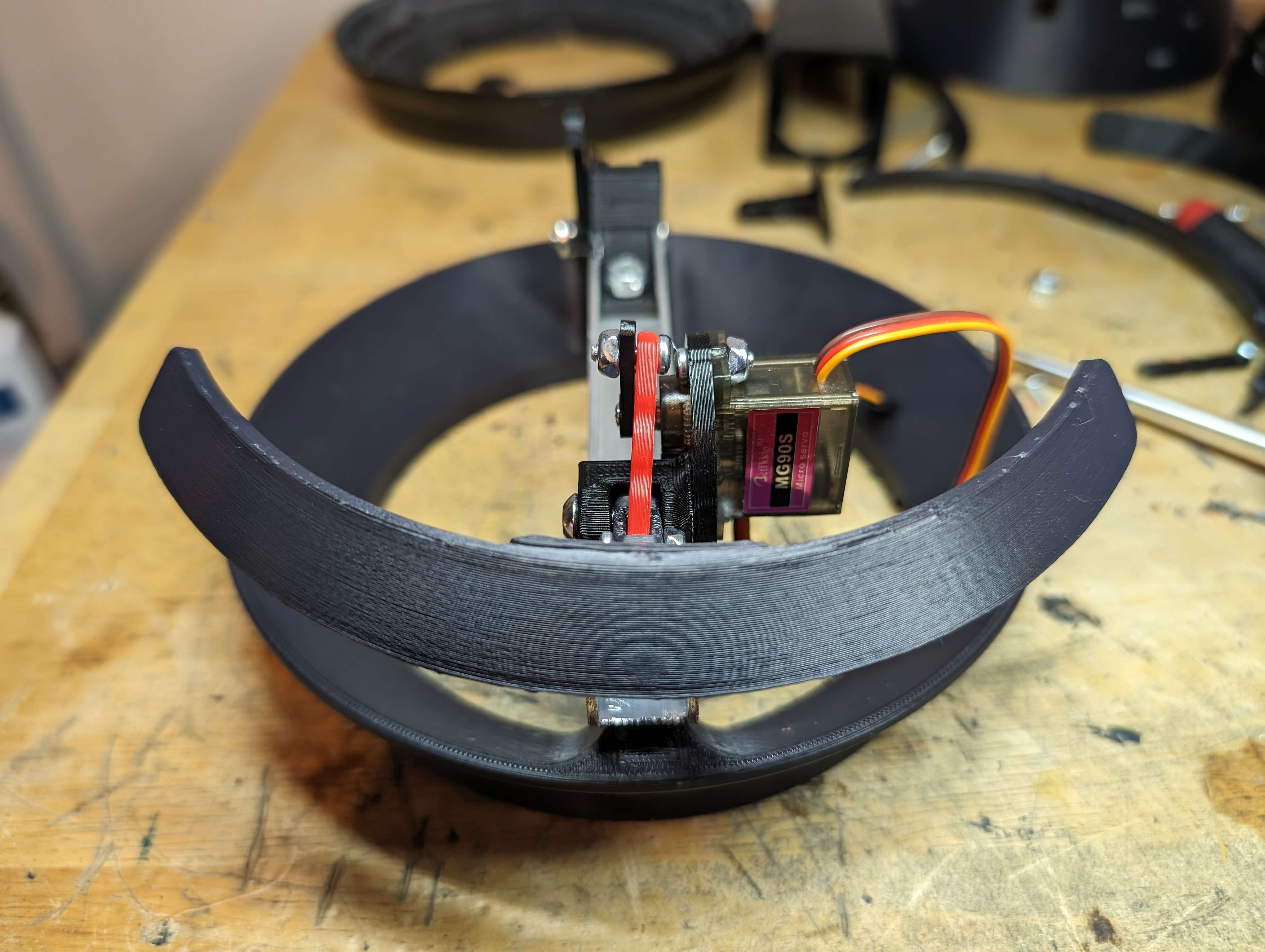 I printed mounts for the lazy susan with space for bushings, and printed brackets to hold a screw that the entire lazy susan pivots off of.