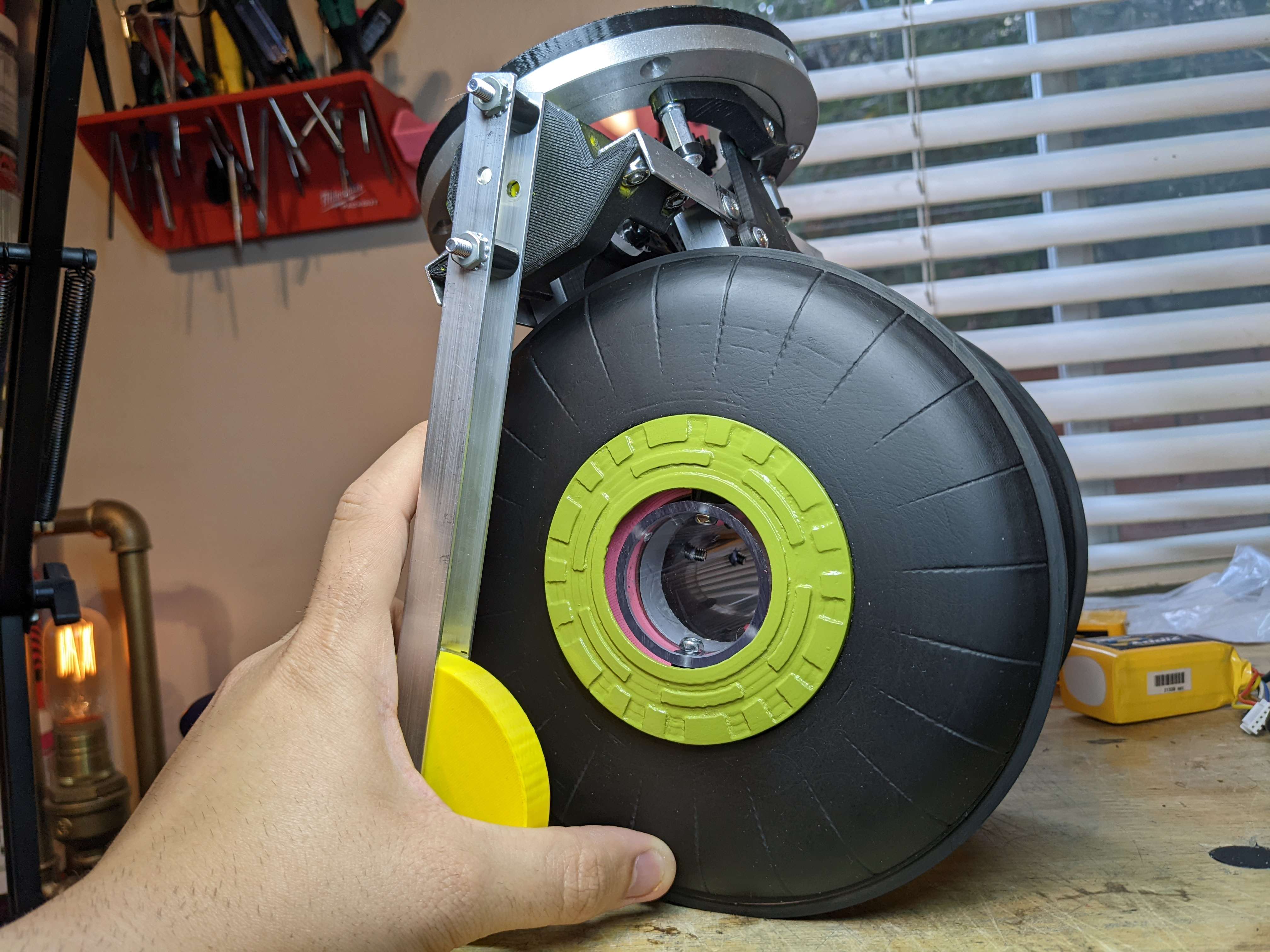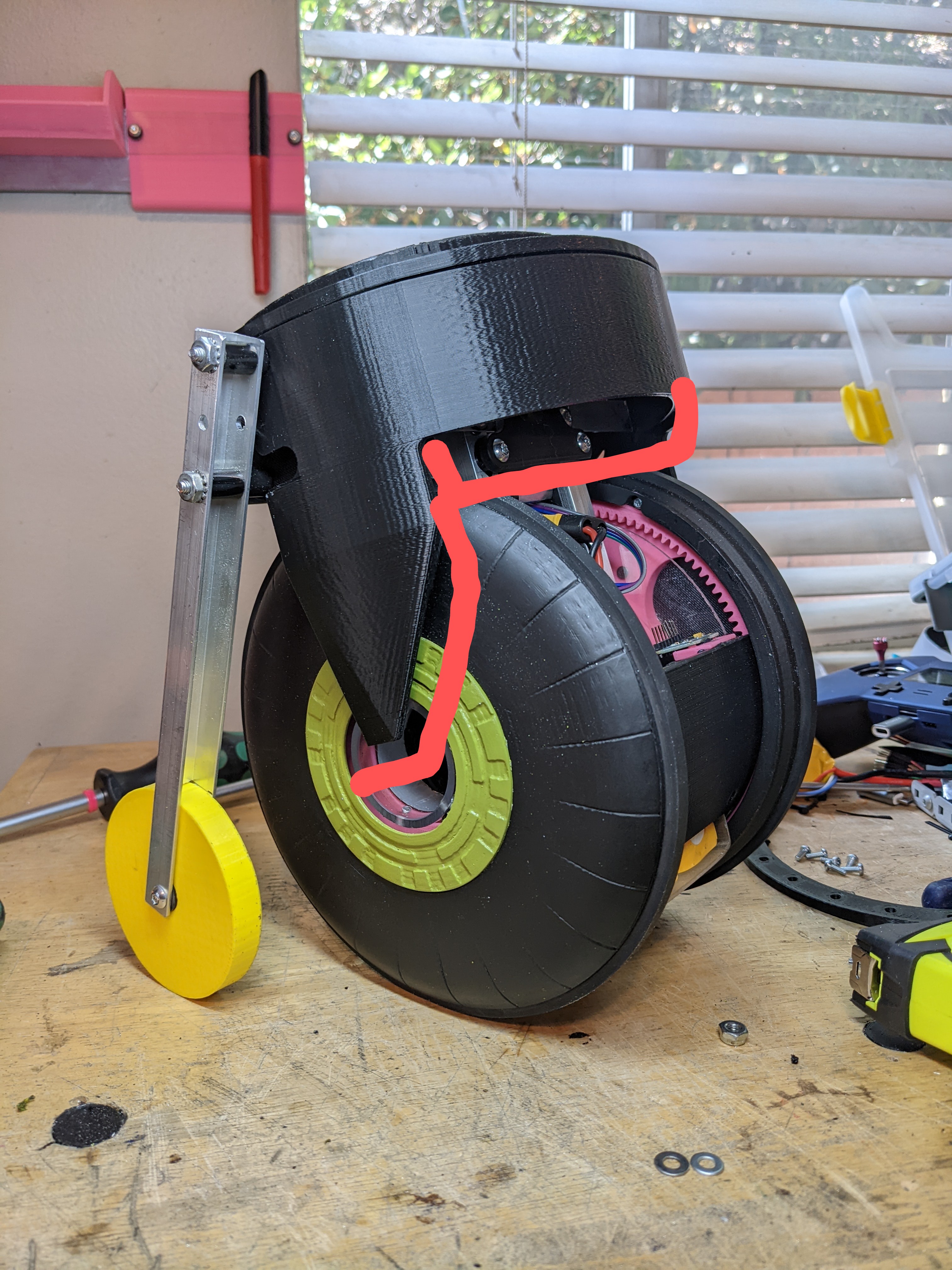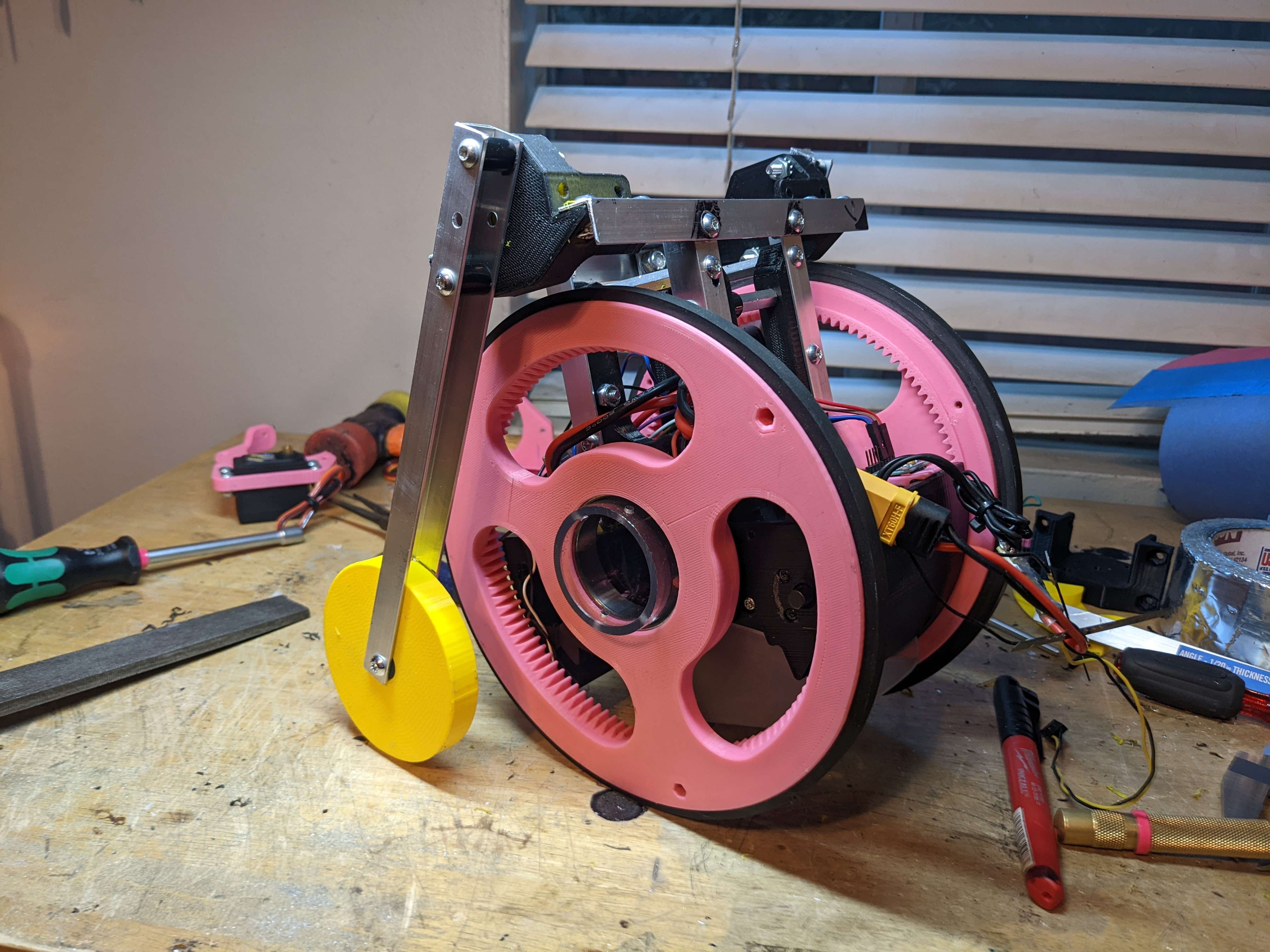 The legs are 1/2" aluminum c-channel that I cut out the center of to have the wheel sit. This wheel is temporary as I come up with a better aesthetically fitting design, but works for testing functionality and stopping this from falling over.