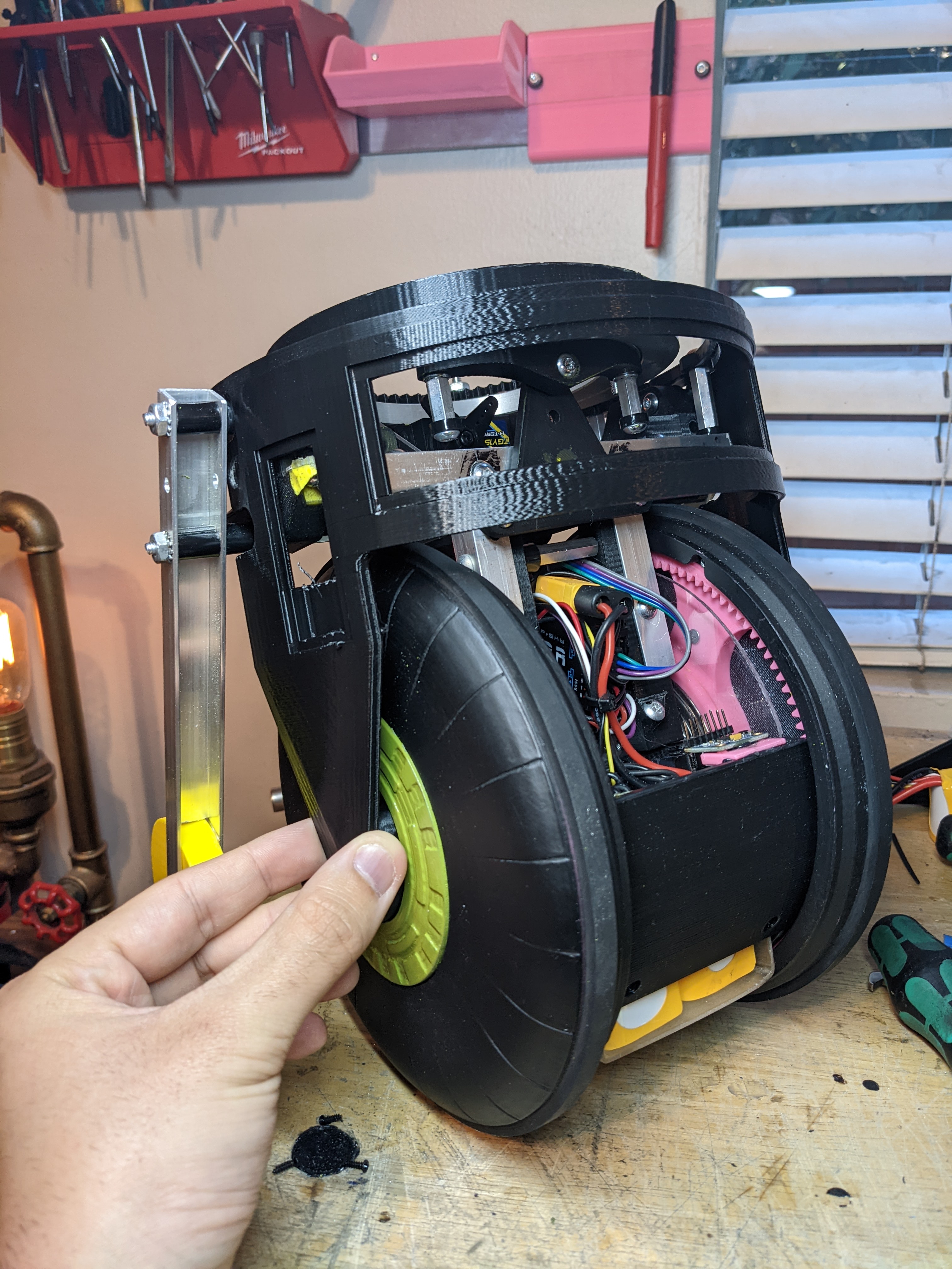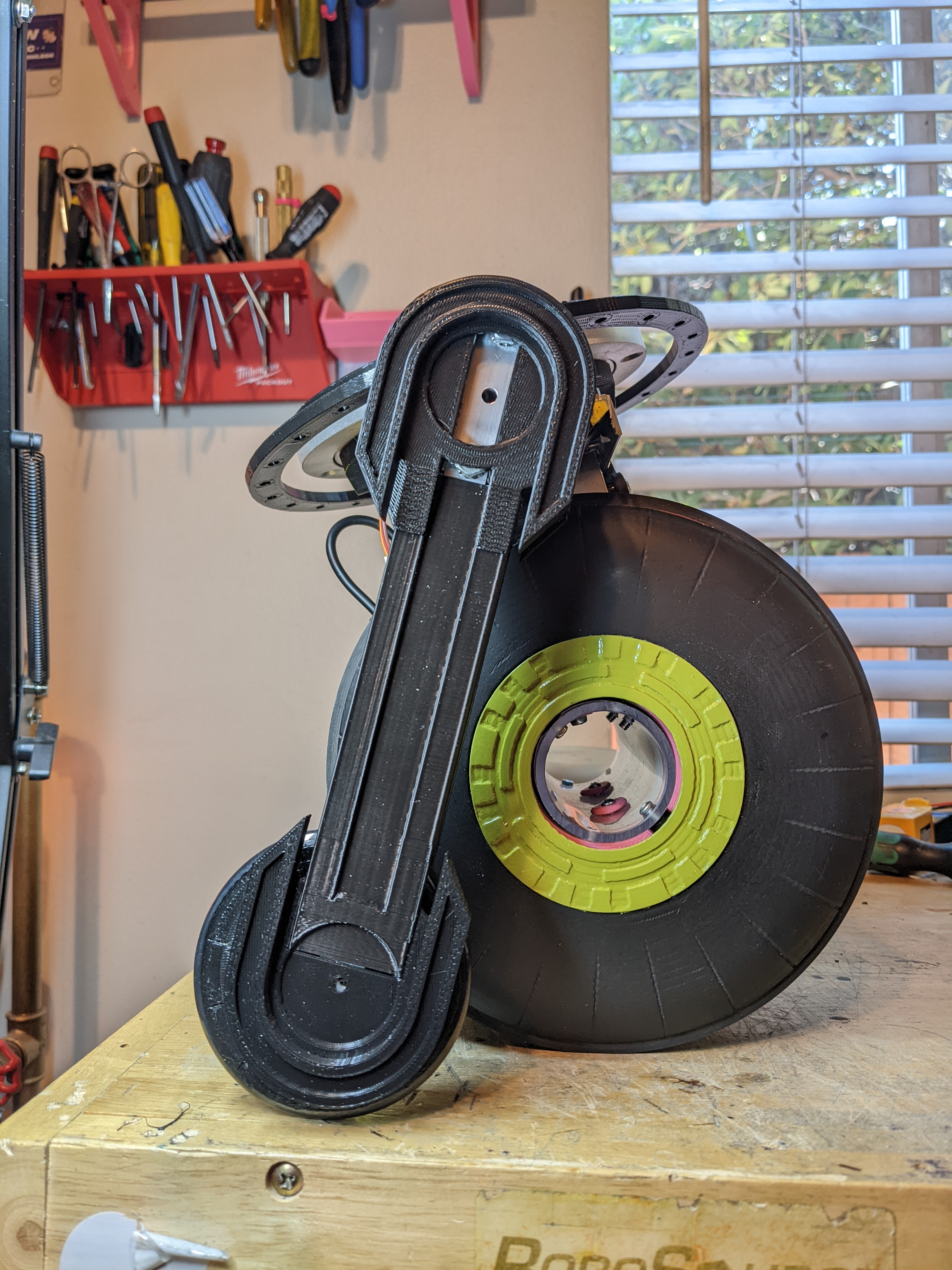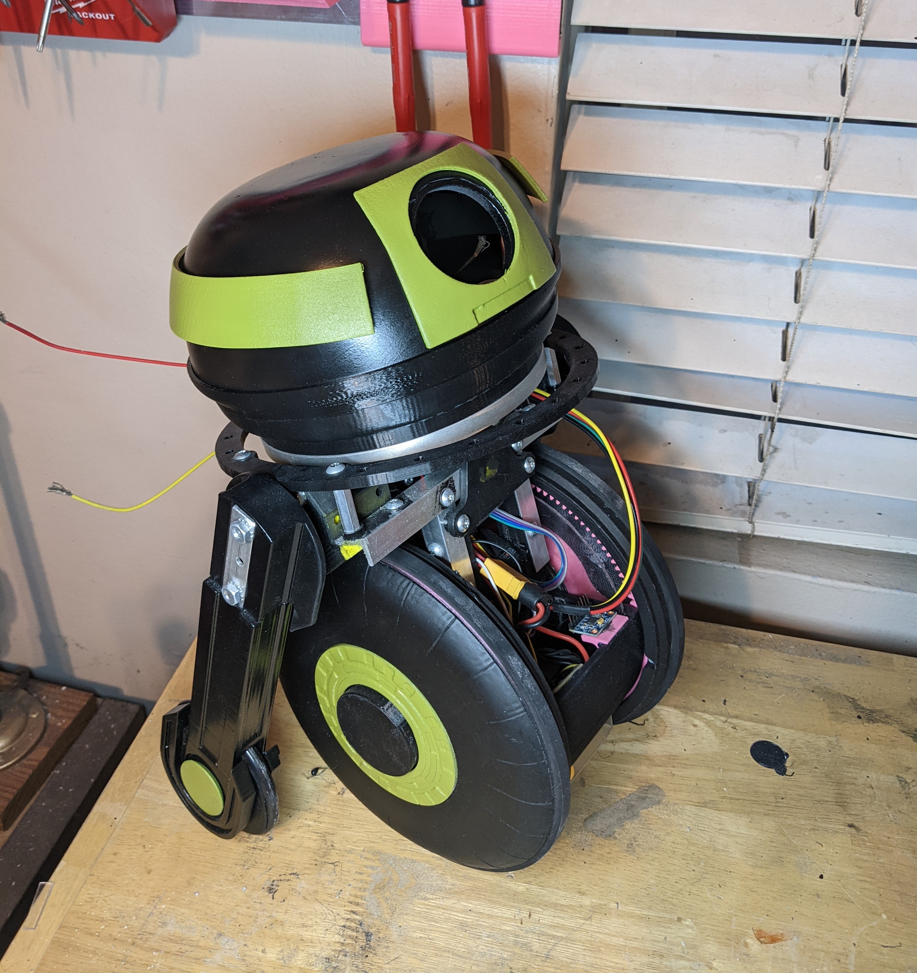 The legs are 1/2" aluminum c-channel that I cut out the center of to have the wheel sit. This wheel is temporary as I come up with a better aesthetically fitting design, but works for testing functionality and stopping this from falling over.