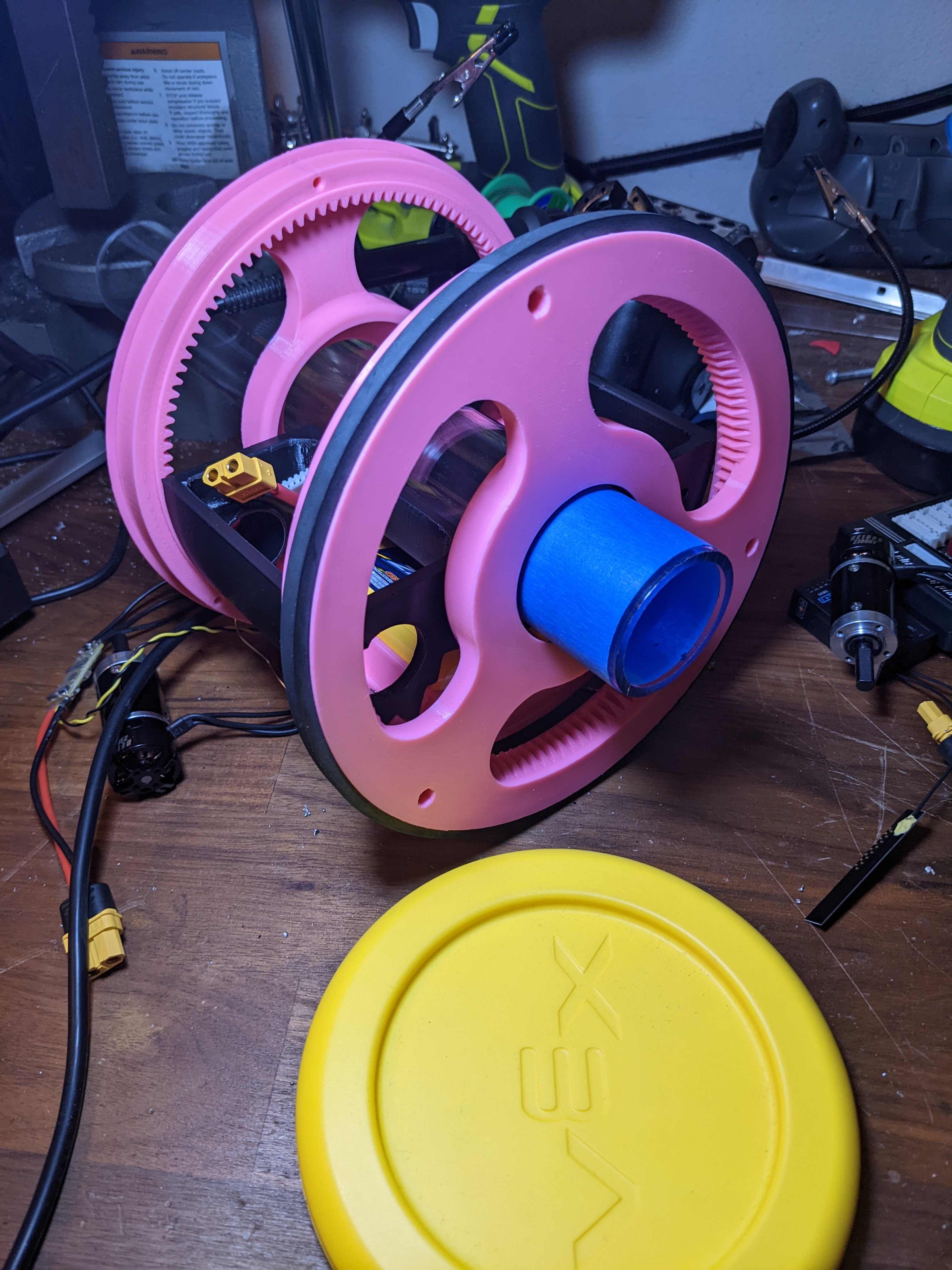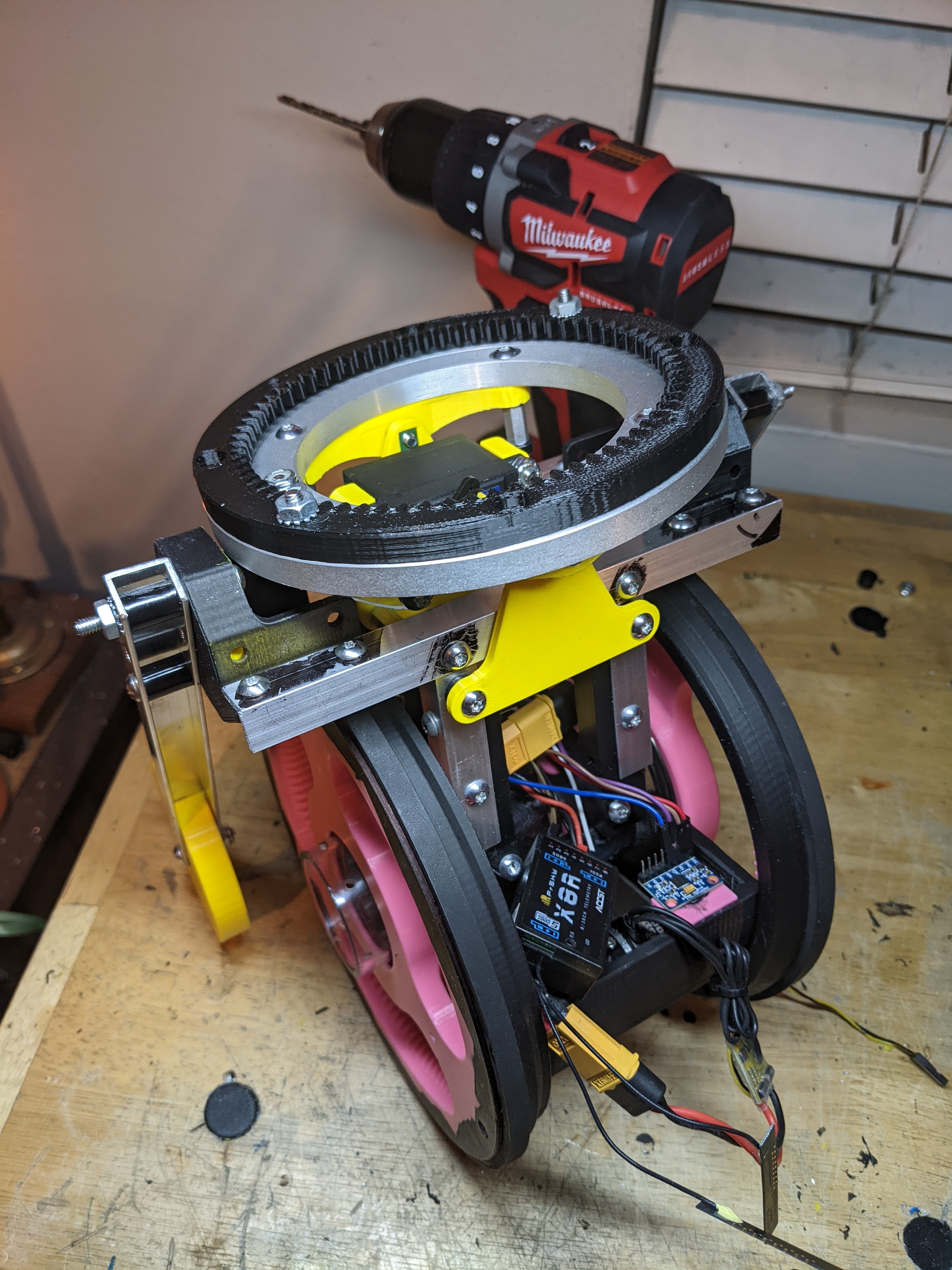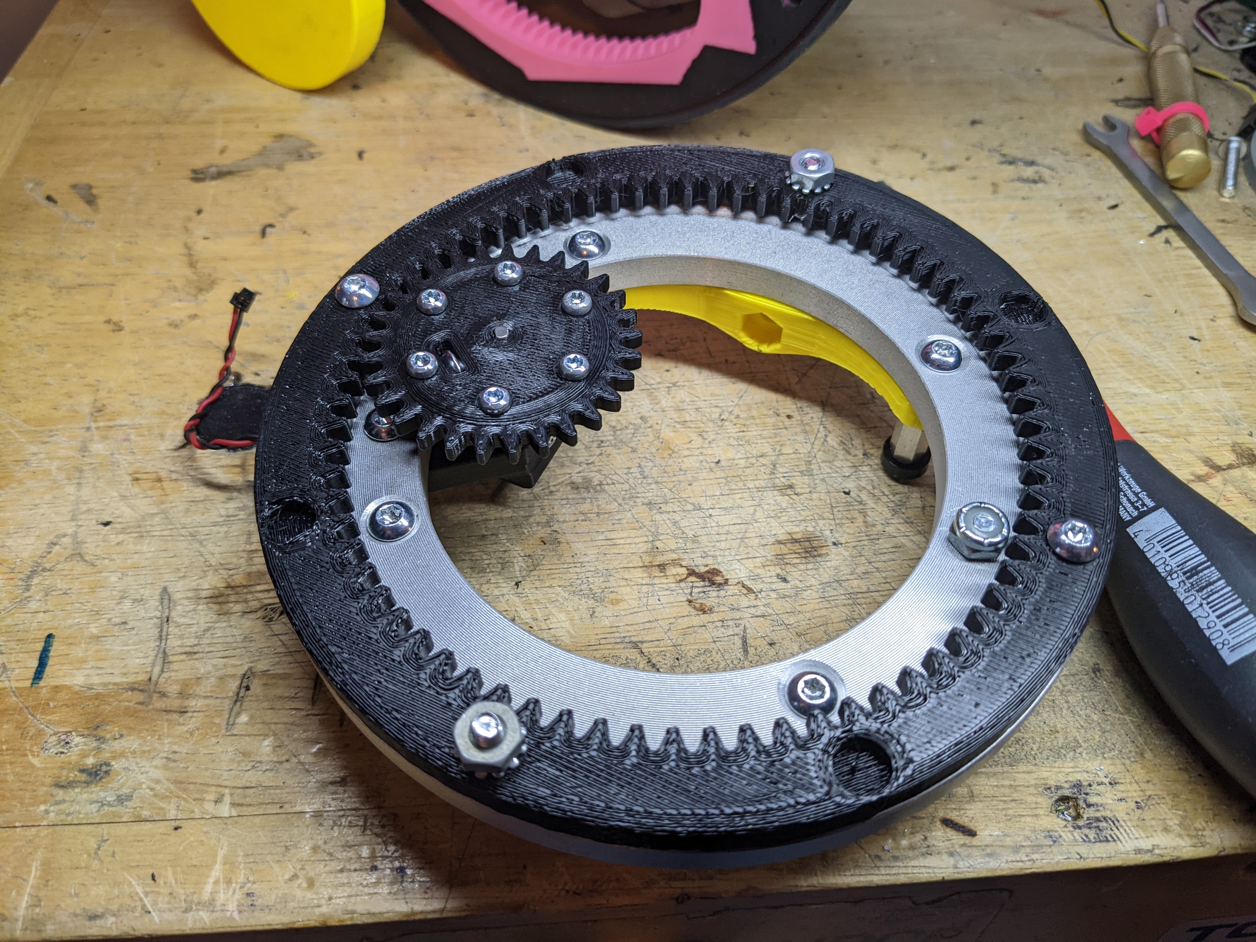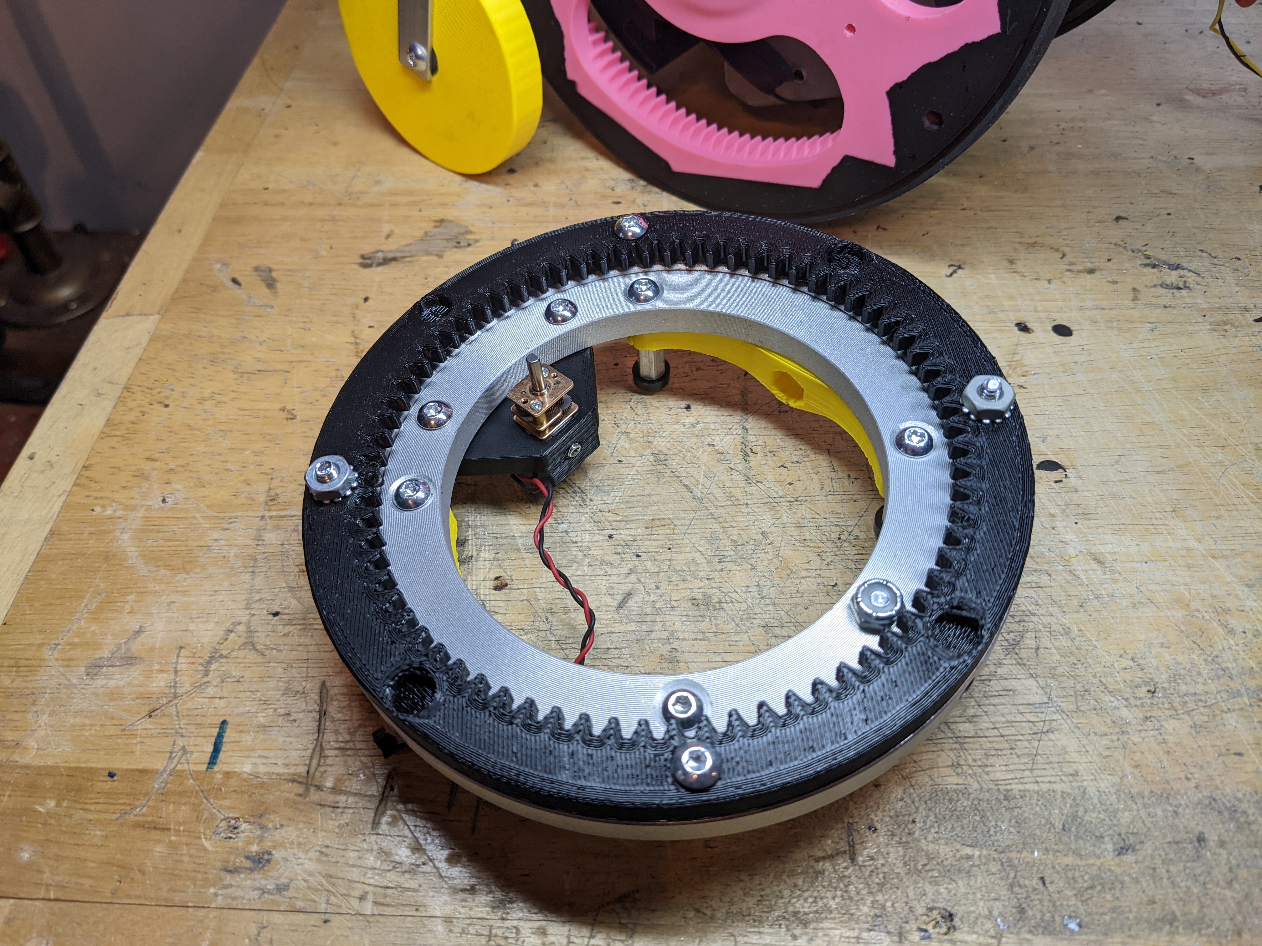 I added a ring gear to the wheel and the placement for the powered gear. This will go 260rpm on a 7" wheel, with 1806 2300kv brushless motor on 4s with a 19:1 gearbox from Robot Matter. I also found a 7" square o-ring that I can use as a tire.