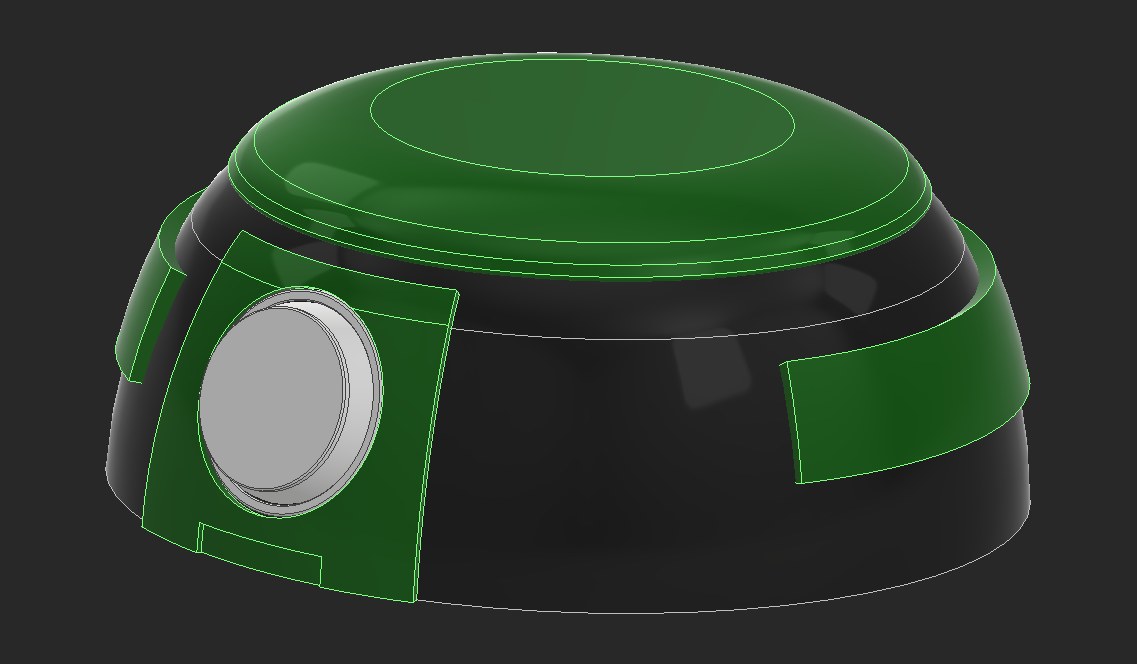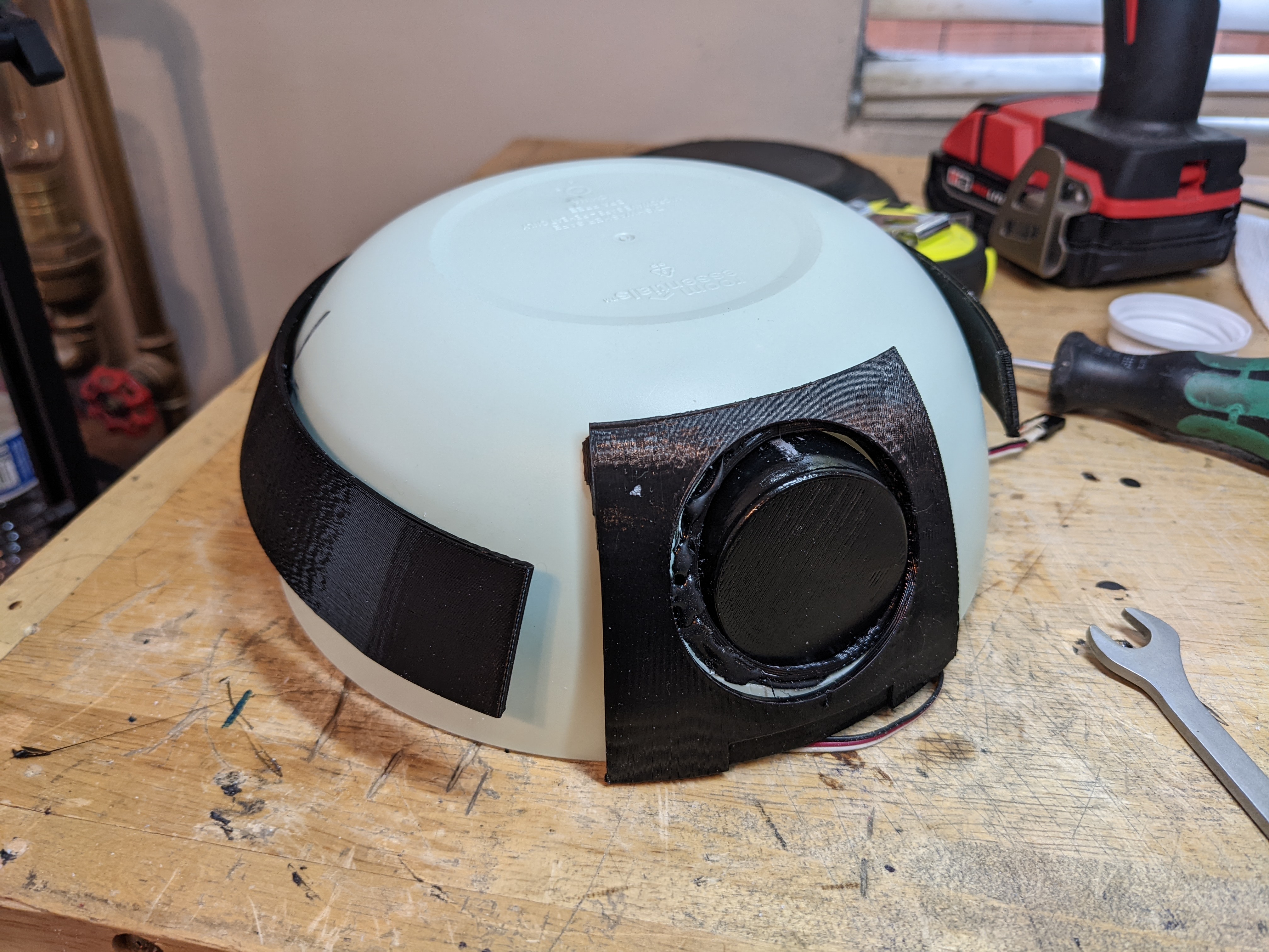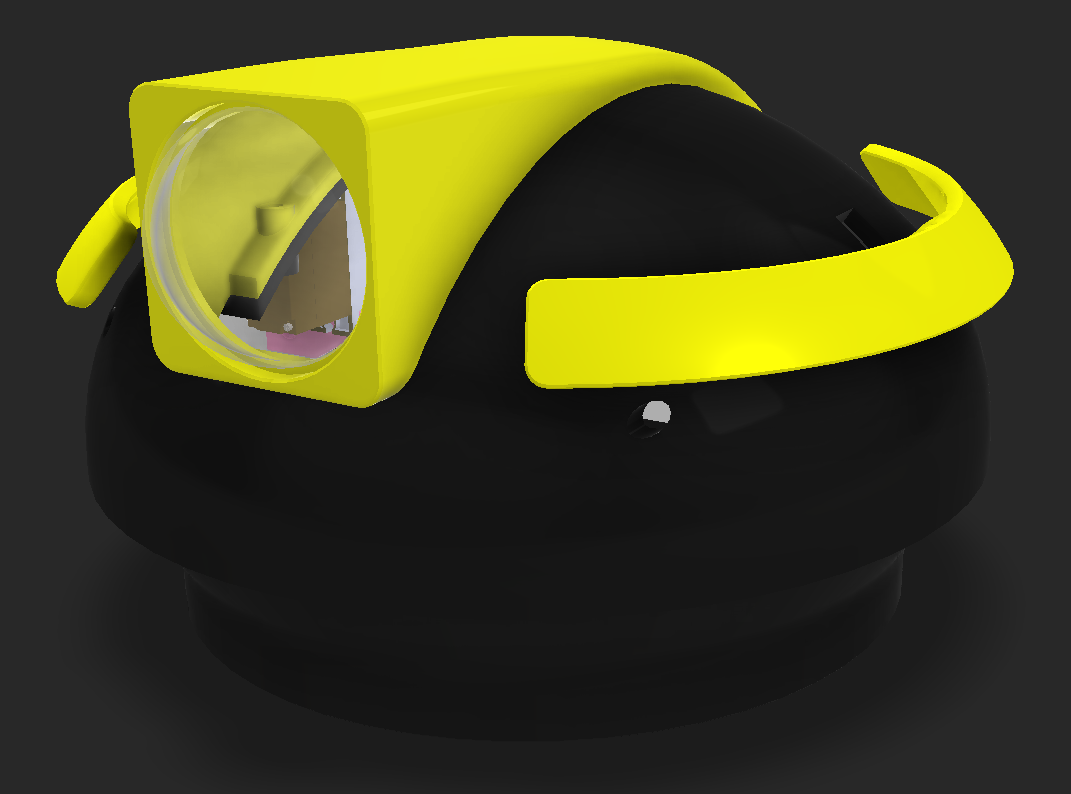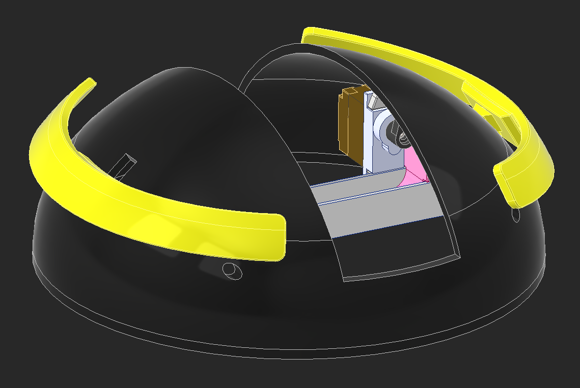 I CADed the bowl and added some decoration around it. I have the eye around a ball joint I'm going to 3D print and a cover around the eye. I also made "eyebrows" that are going to move in and out to give the robot more expression. I tried adding a top part that is colored, but the robot looks like it has a receding hairline, so I won't be going forward with that.