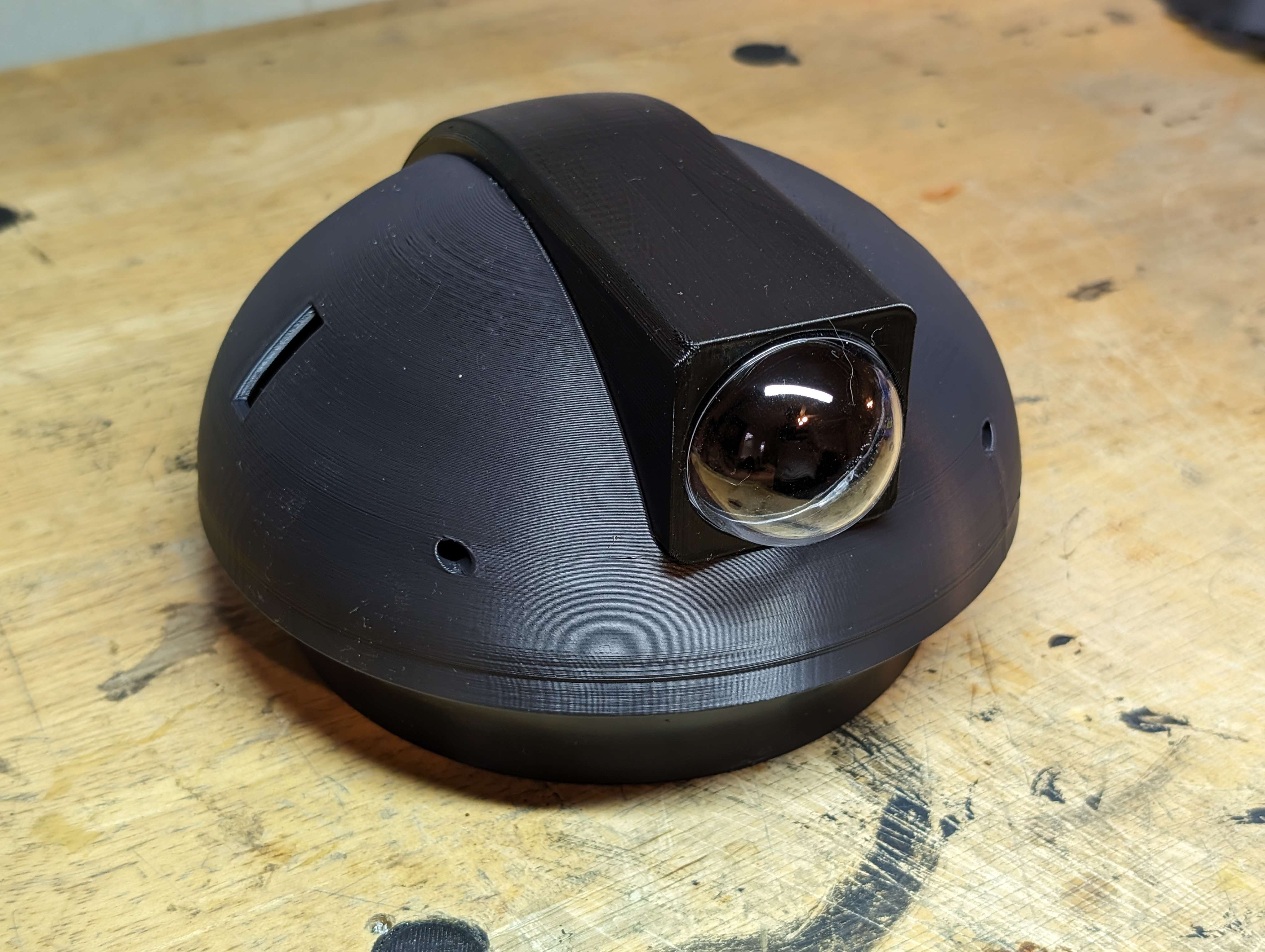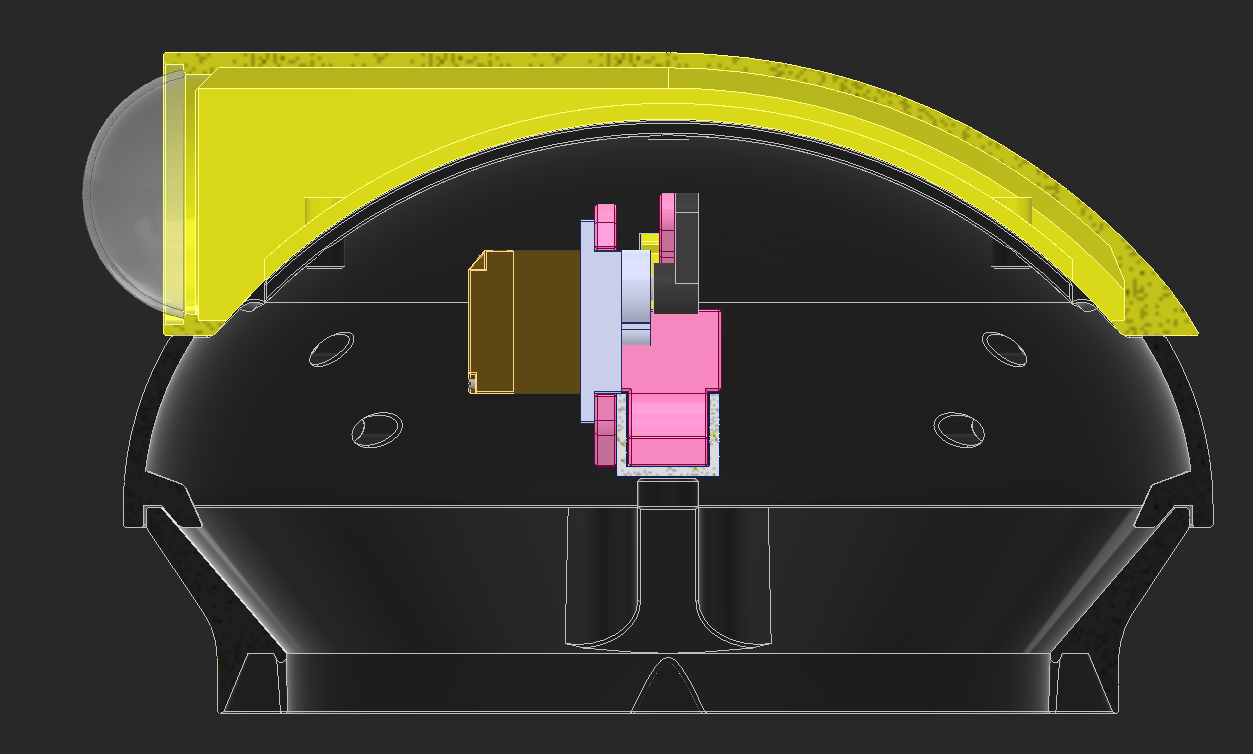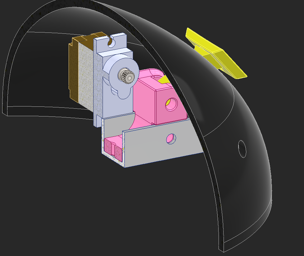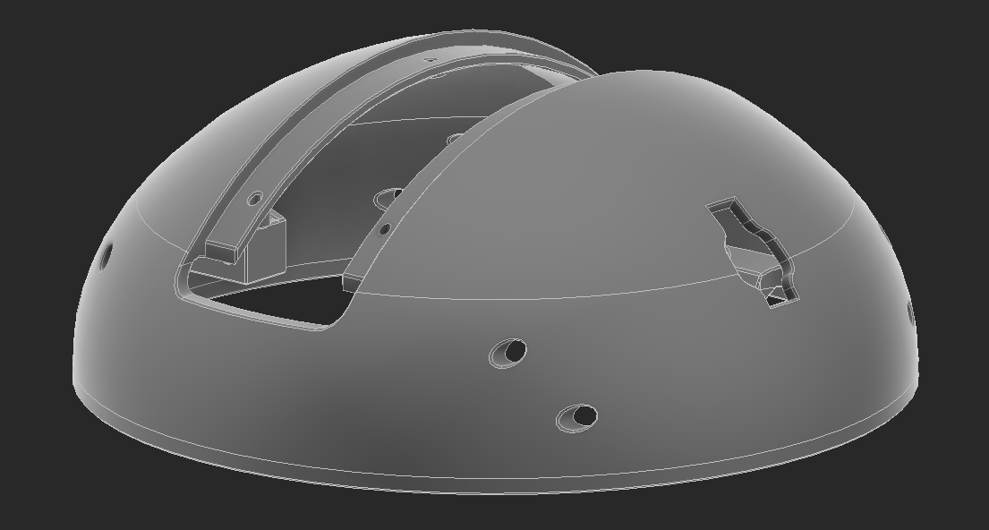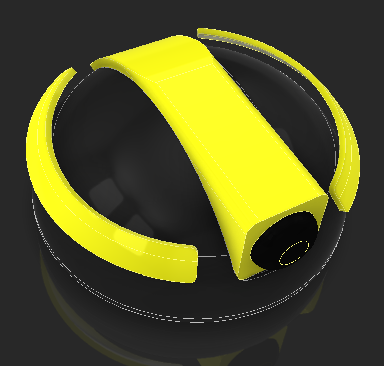 I CADed the bowl and added some decoration around it. I have the eye around a ball joint I'm going to 3D print and a cover around the eye. I also made "eyebrows" that are going to move in and out to give the robot more expression. I tried adding a top part that is colored, but the robot looks like it has a receding hairline, so I won't be going forward with that.