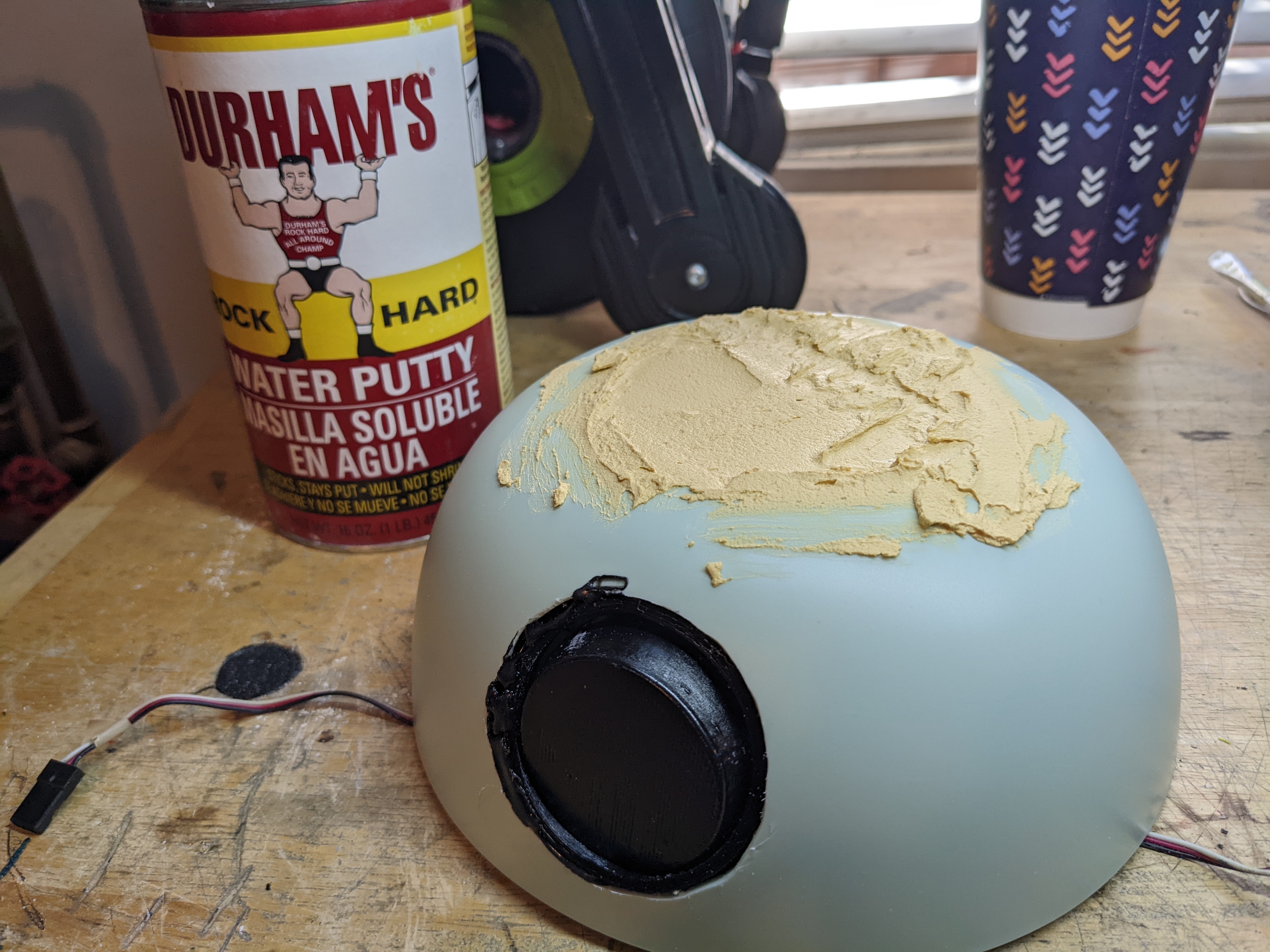 To fill the crevice in the bottom of the bowl, I used durhams putty. This is a very cheap powder, which is ~$3, and the powder gets added to water. I can control the viscosity of it by changing the ratio of powder to water, and then I can fill in the area with this. It's very sandable, and does cure to be "rock hard".