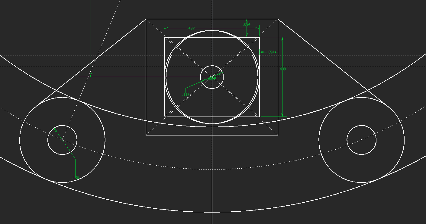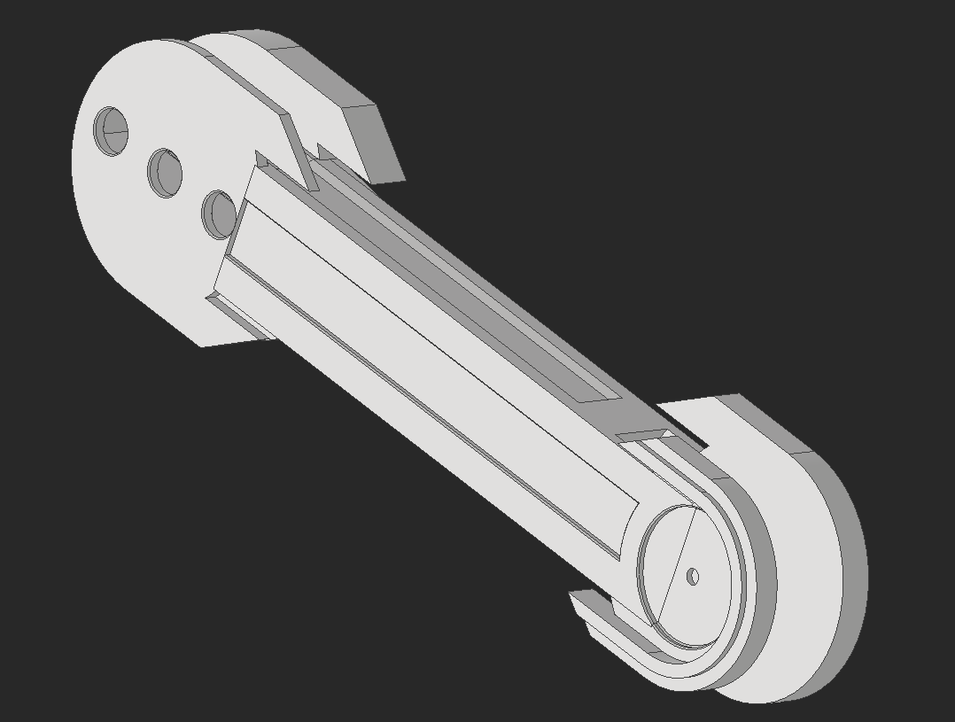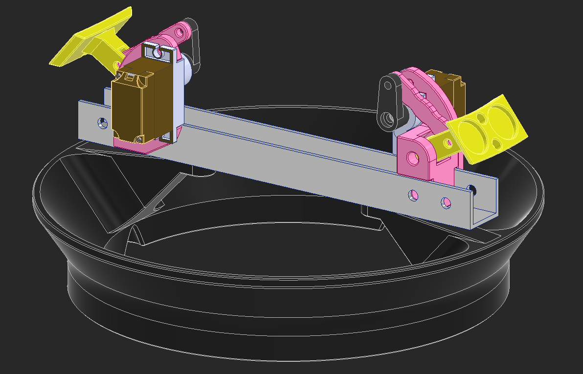 A cantilevered mechanism like the head on D-O felt wrong to me, so I wanted to design it to be not cantilevered. I made some geometry for the linkage and copied it to both sides. I also angled the linkages in because it looked way too wide when it was straight up. I'm doing the linkage the same way it's done on D-O, where one is a crankshaft and one directly powers the linkage, to give control over tilt and height.