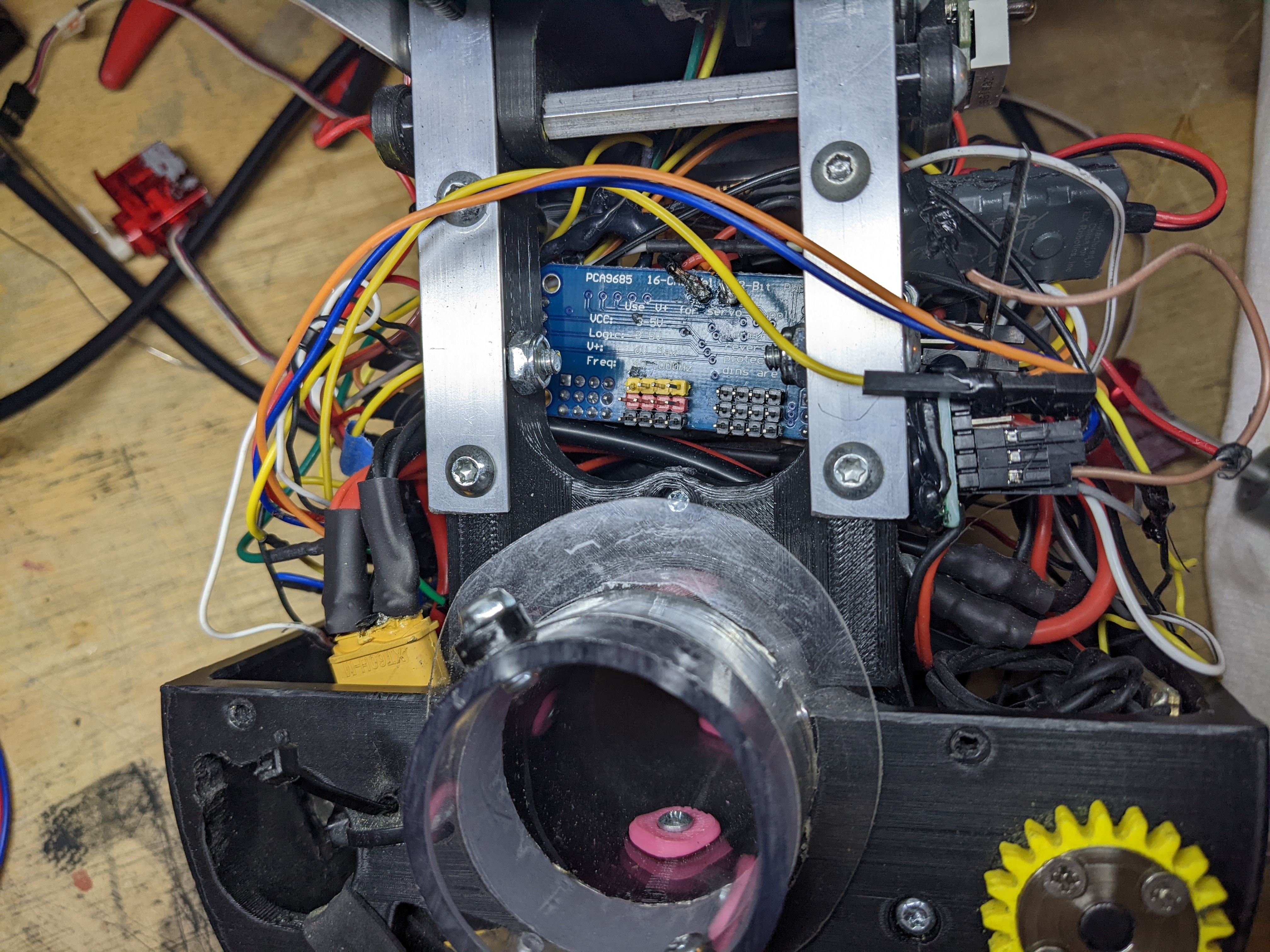 I fit a pca9685 servo board, a teensy, and an x8r receiver inside.