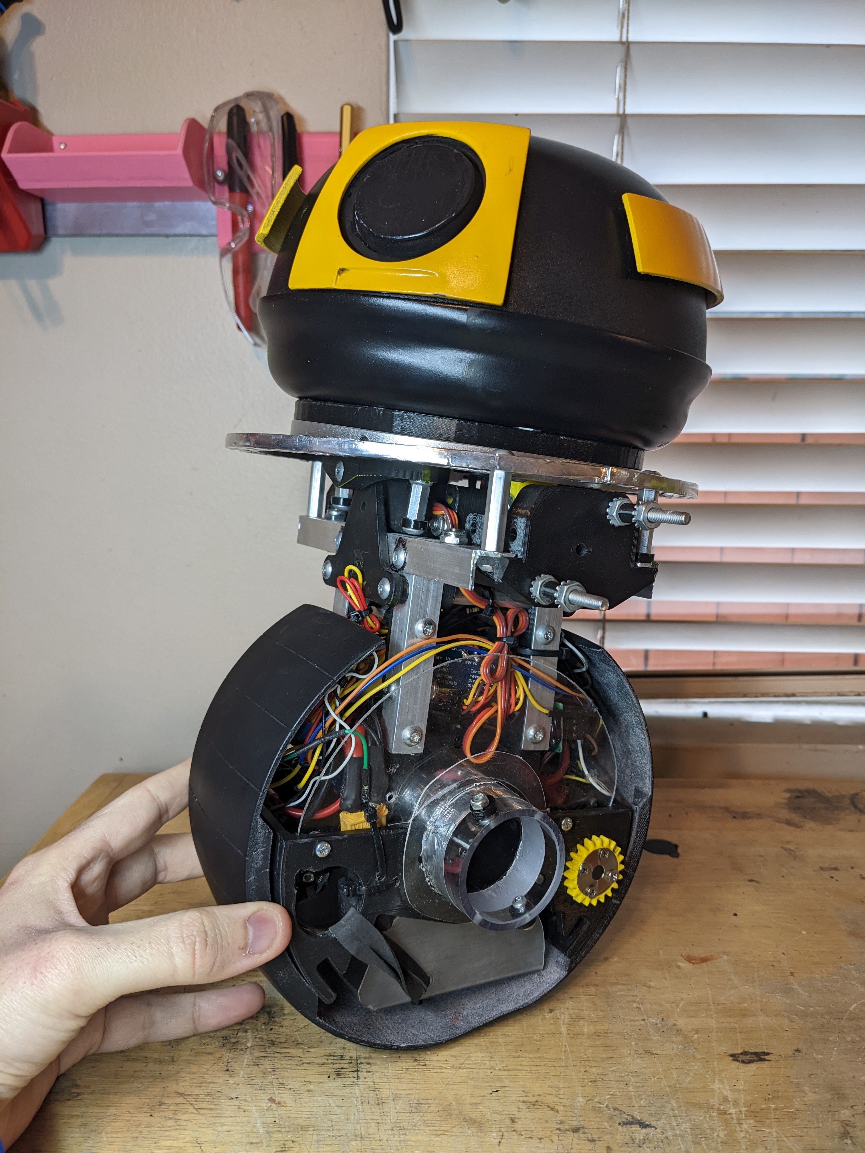 The eyebrows are connected to a linkage to move them in and out slightly, and the eye has an X and Y servo that will move it in both axes.