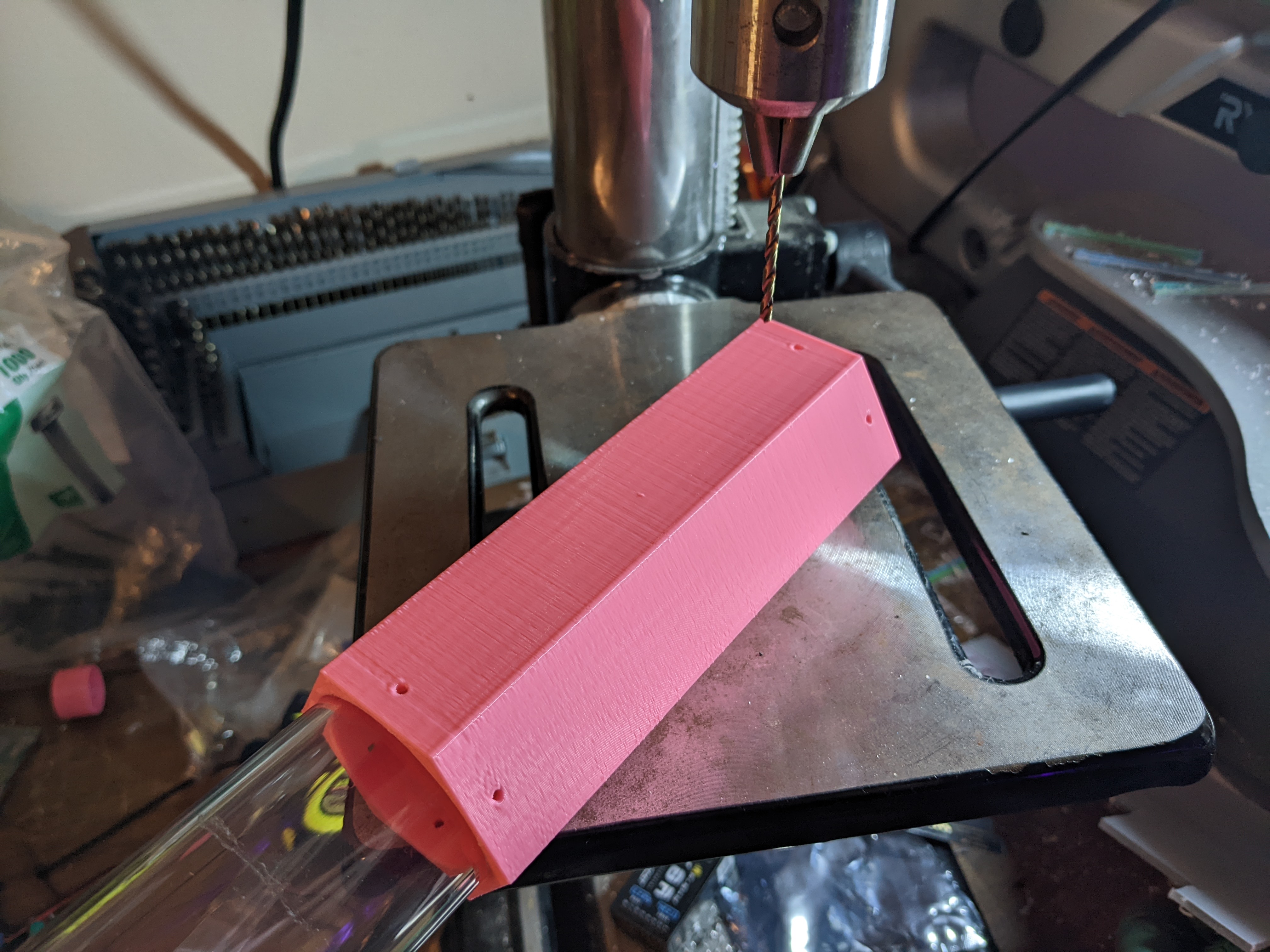I designed the linkage for real and made the piece that clamps onto the aluminum rod. The hole that needs to be drilled is only 1/2".