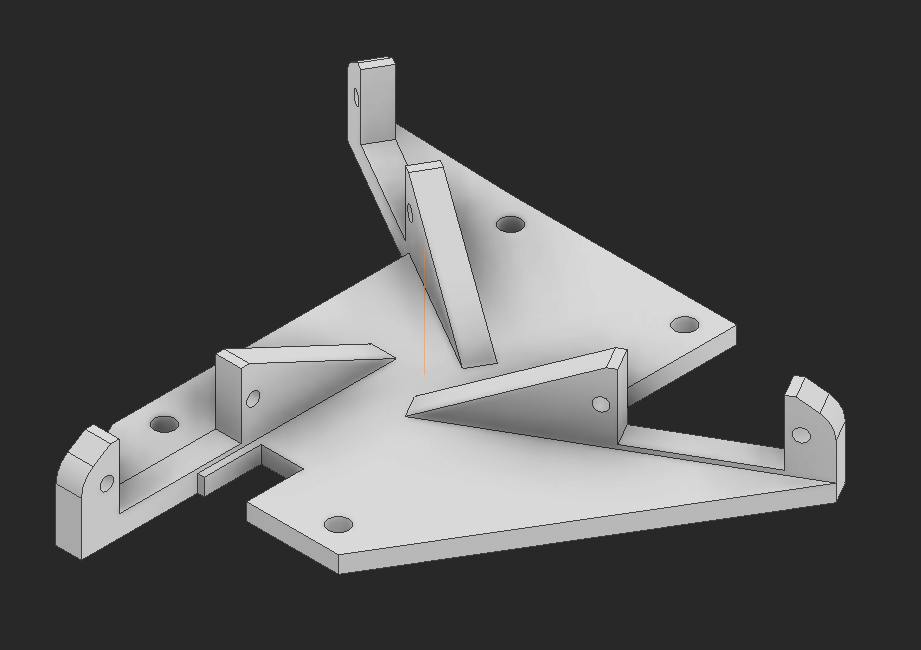 The legs needed to get mounted diagonally and needed a mount at the end of this T structure. How this piece is designed changes how the T exactly gets made so I decided to design this first. This has captive nuts and sits inside of the 1/2" angle. I also needed to make sure there was space at the corners for the body to sit, which distances the length of the arms on the T.