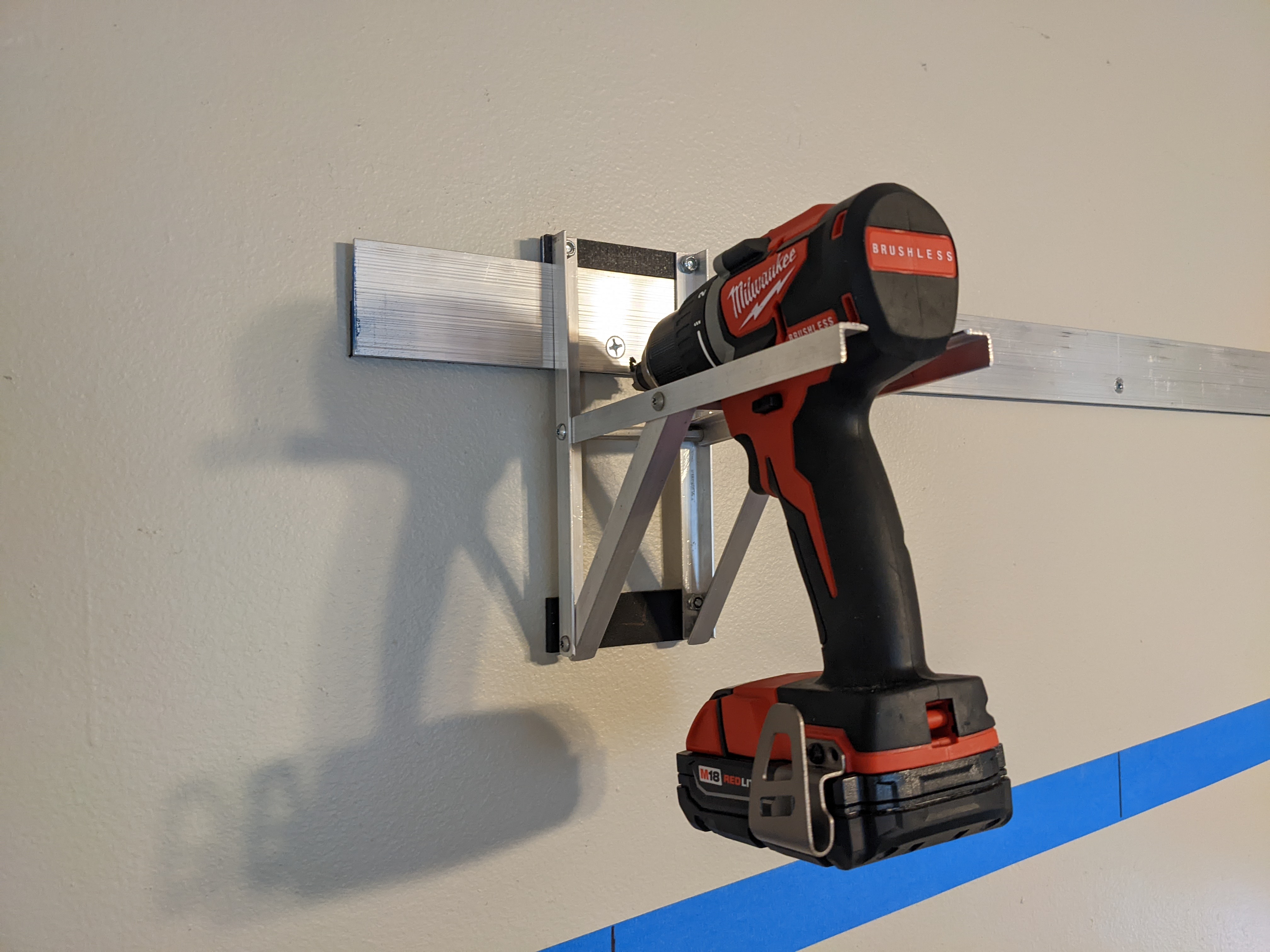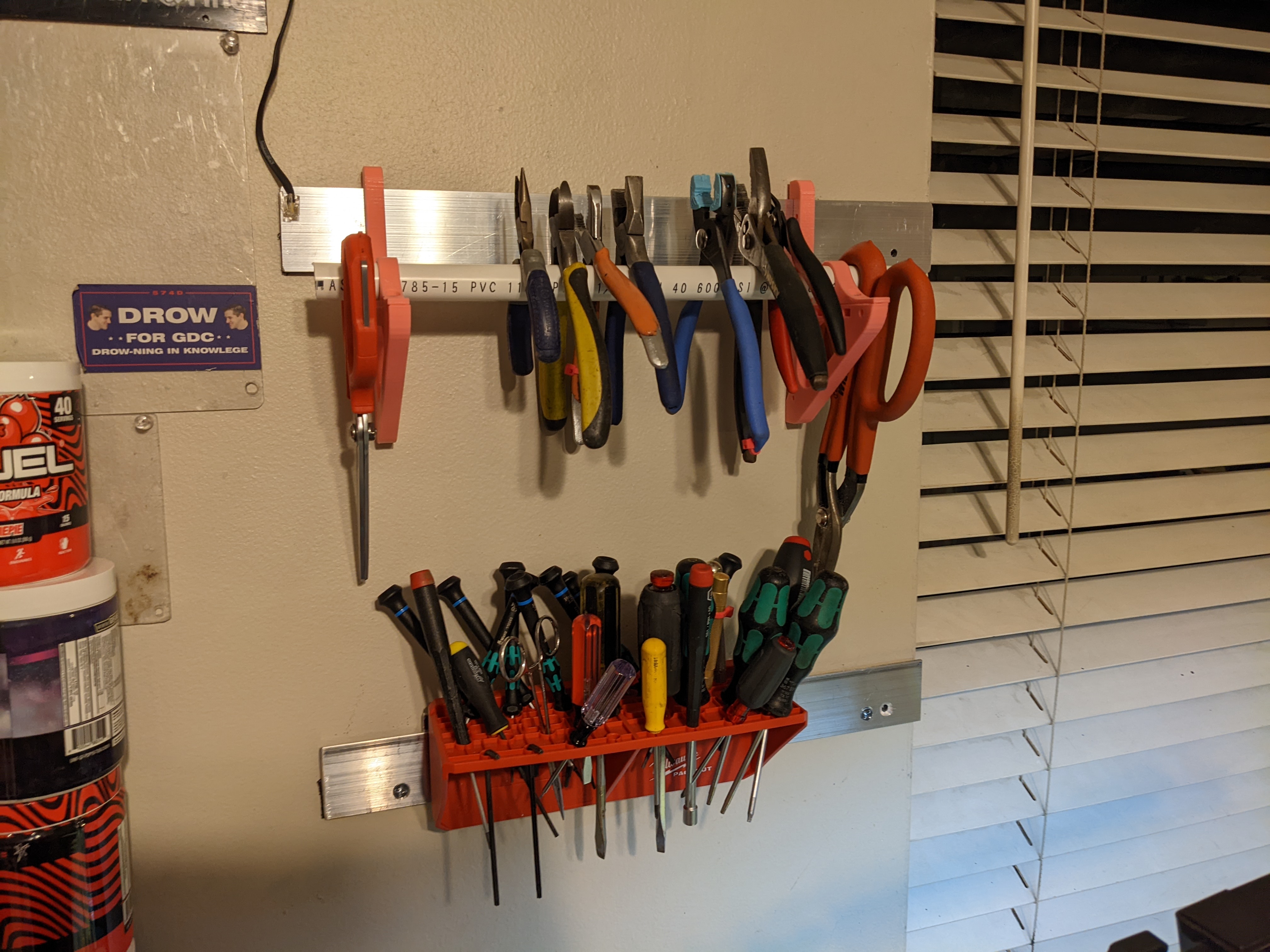 I mounted more aluminum to my wall near my workbench and have homes for tools I use often there. I bought a Milwaukee screwdriver holder for their pack-out system, but just drilled holes in it and mounted a bit of aluminum to go around the French cleat. I used one of the generic hooks to hold pliers and snips.