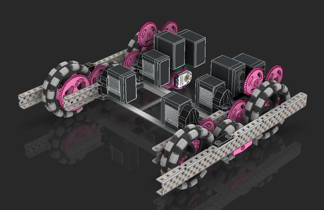 After this testing, we felt we were ready to move on and start making the robot. This drive goes 90"/s, we used other drive trains that were 86"/s and felt that was a good ballpark to get to. I couldn't make it the same because this drive train uses a different-sized wheel for the center. The larger 4.125" wheels spin at ~420rpm and the smaller 2.75" wheel spins at ~630rpm. I wanted this chassis to fit within 15" but I wanted to use 4.125" wheels to get over the low zone barrier easier, and this required using multiple sizes of wheel. I included space behind the back motors to fit tracking wheels. The cross bars on this robot are 1/2" 6061 aluminum angle that I got from McMaster.