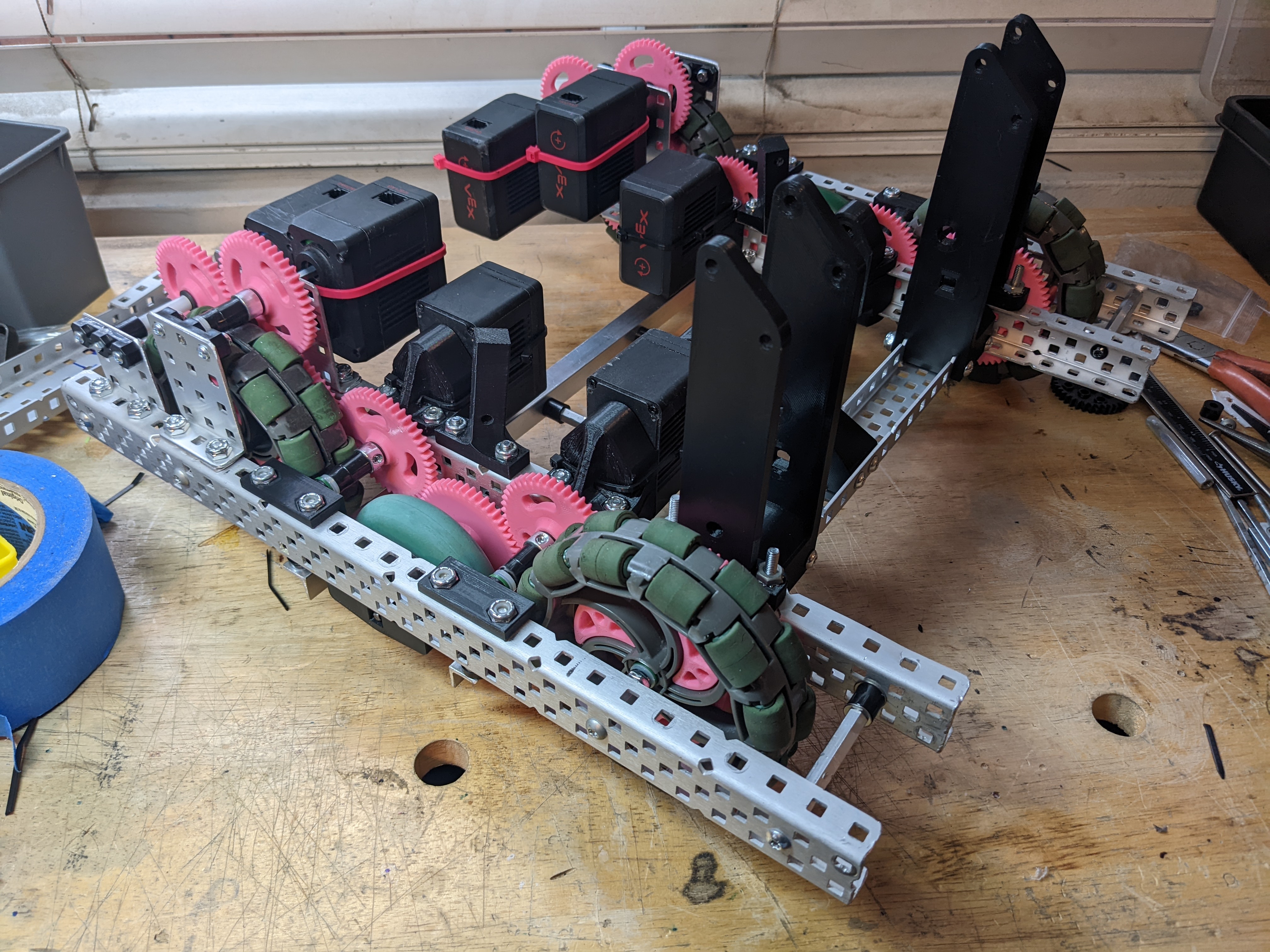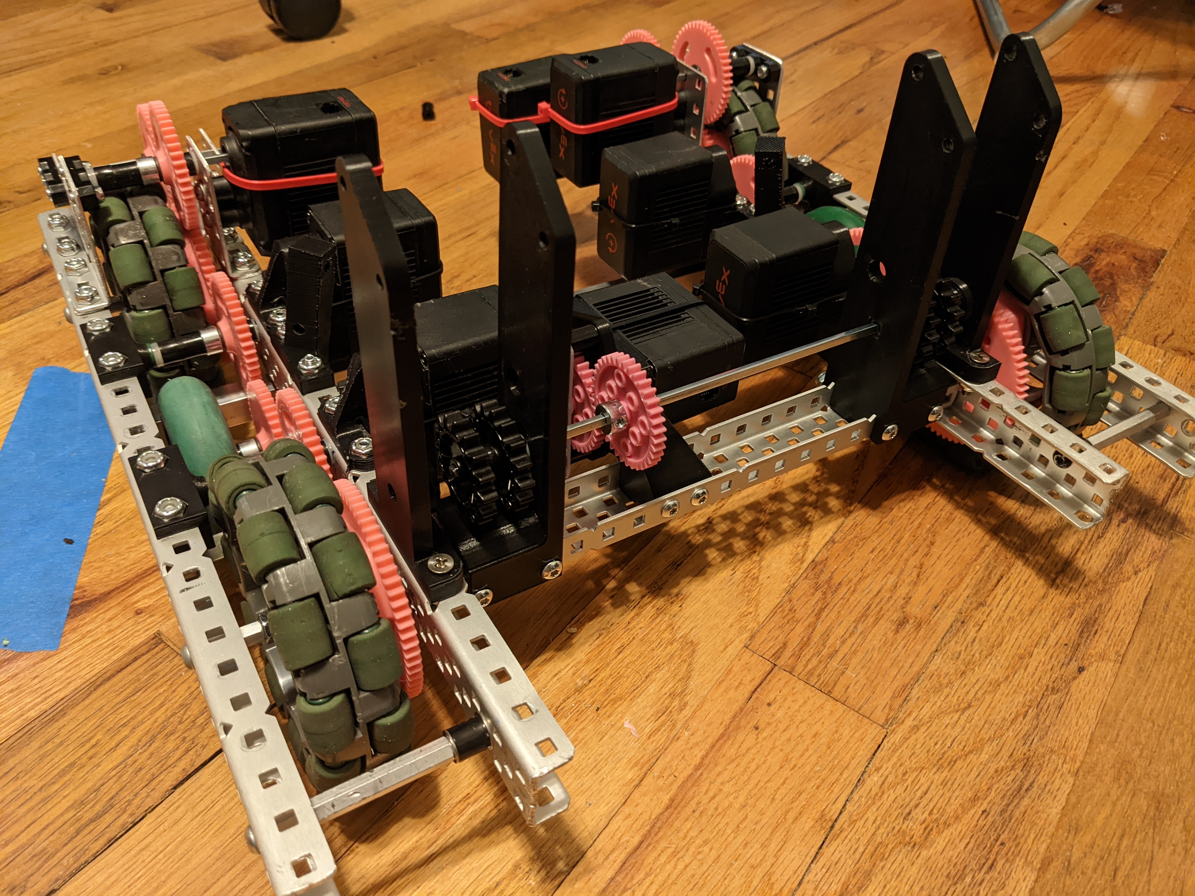We kept the same wheel spacing as before, but the 7:3 gear ratio we were using previously with VEX gears wasn't very nice. The wheel spacing just barely doesn't work with 4 gears total and we would have had to go to 6. I designed custom gears that have the same 7:3 ratio which let us use just 4 gears.