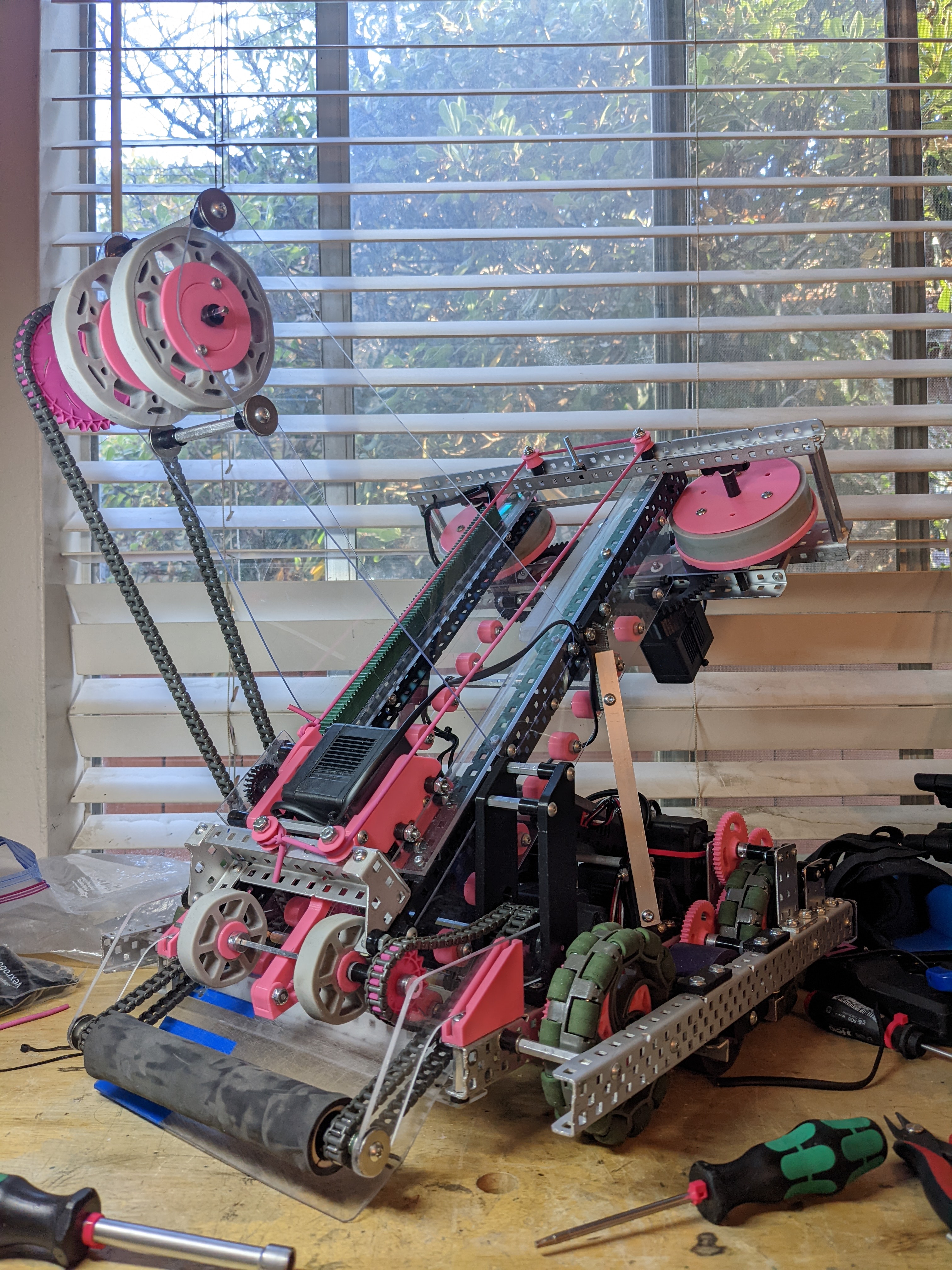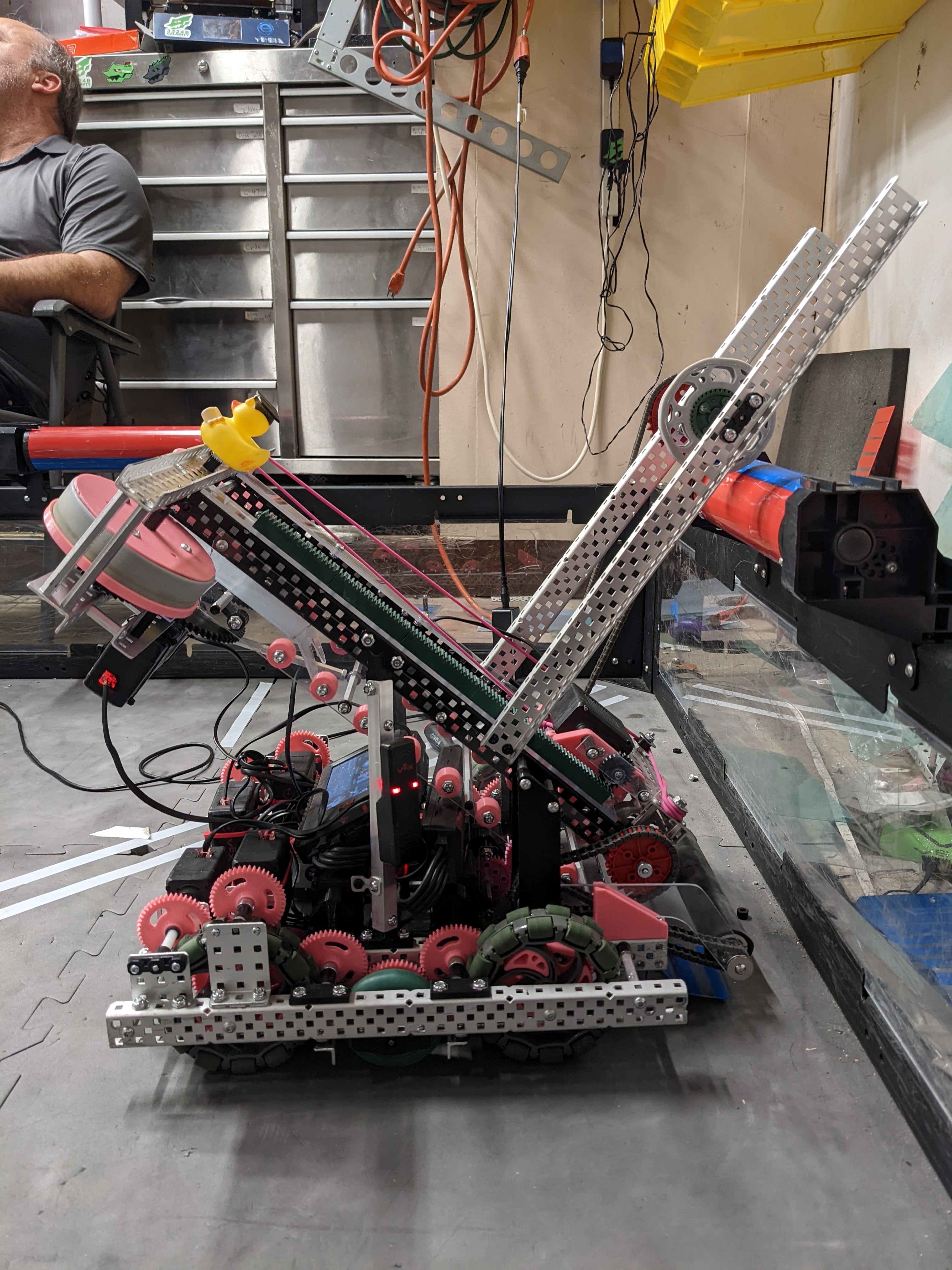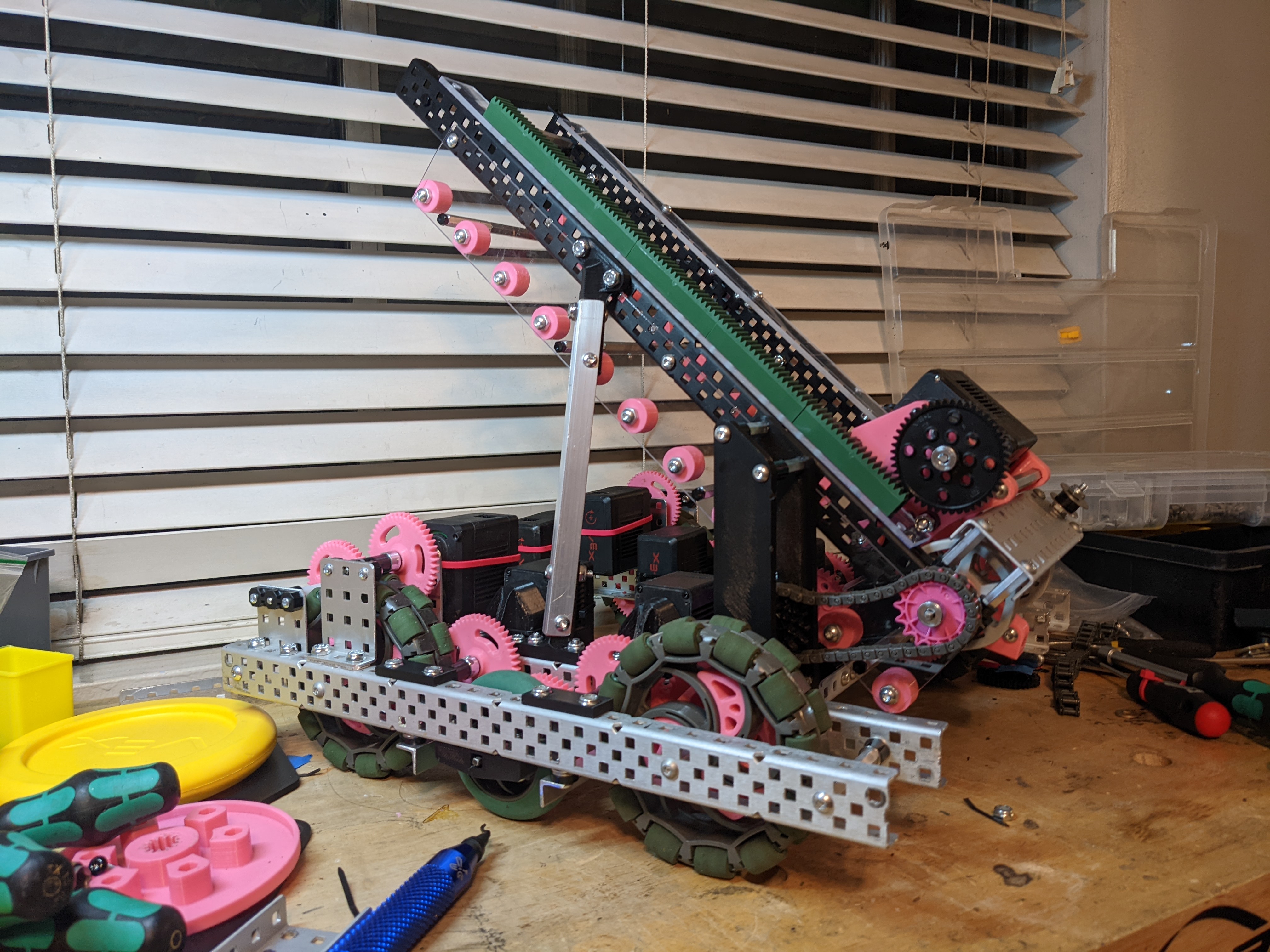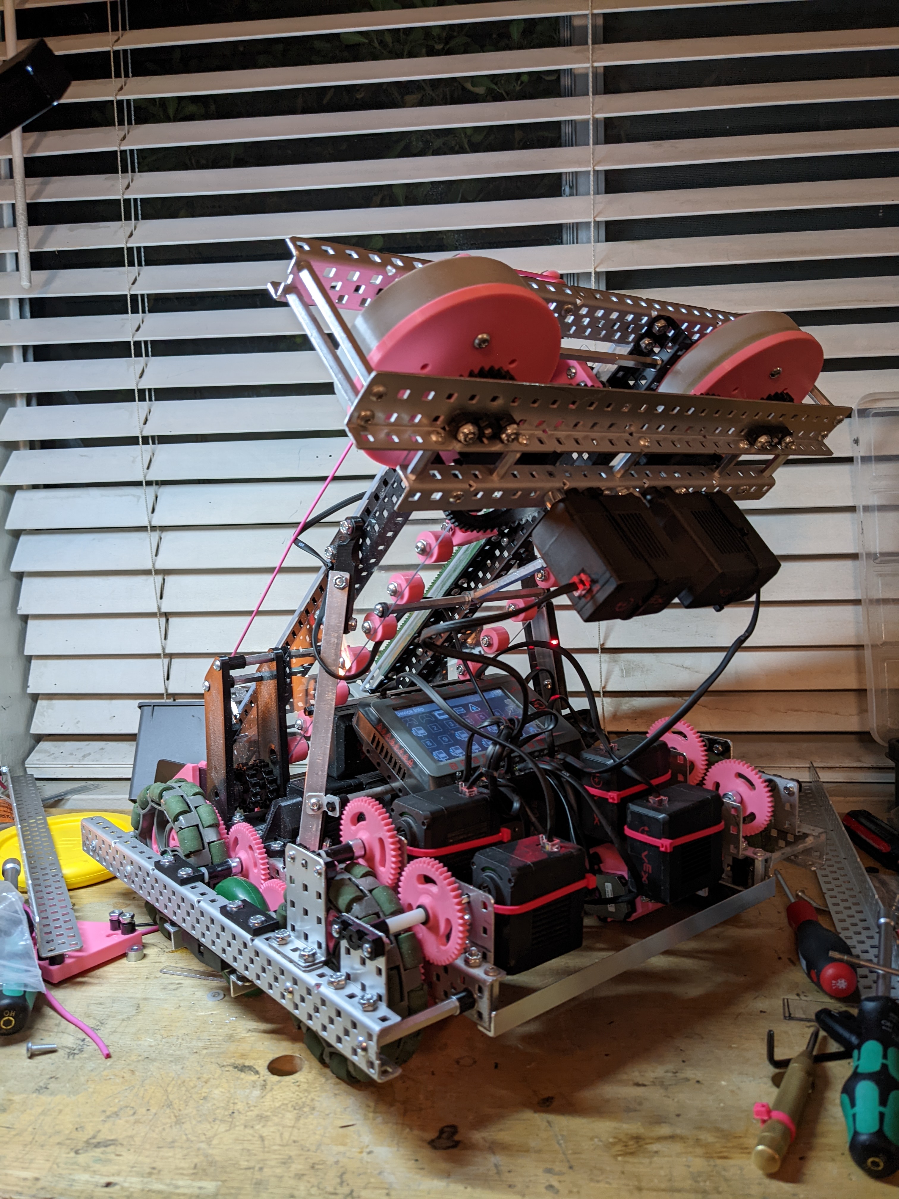 Using 13186A as a base point, Lucas and I designed and iterated the system to get discs from storage to the flywheels. The design we ended with was a linear slide that pushed the discs through, removing all the slip that the chain had. I made software that automates the linear slide for the driver, regulates flywheel velocity using PID, jam detection on the intake, and pure pursuit for autonomous. This robot uses custom molded traction wheels with 20A polyurethane and a custom-made gear ratio that gives 417rpm on 4.125" wheels.