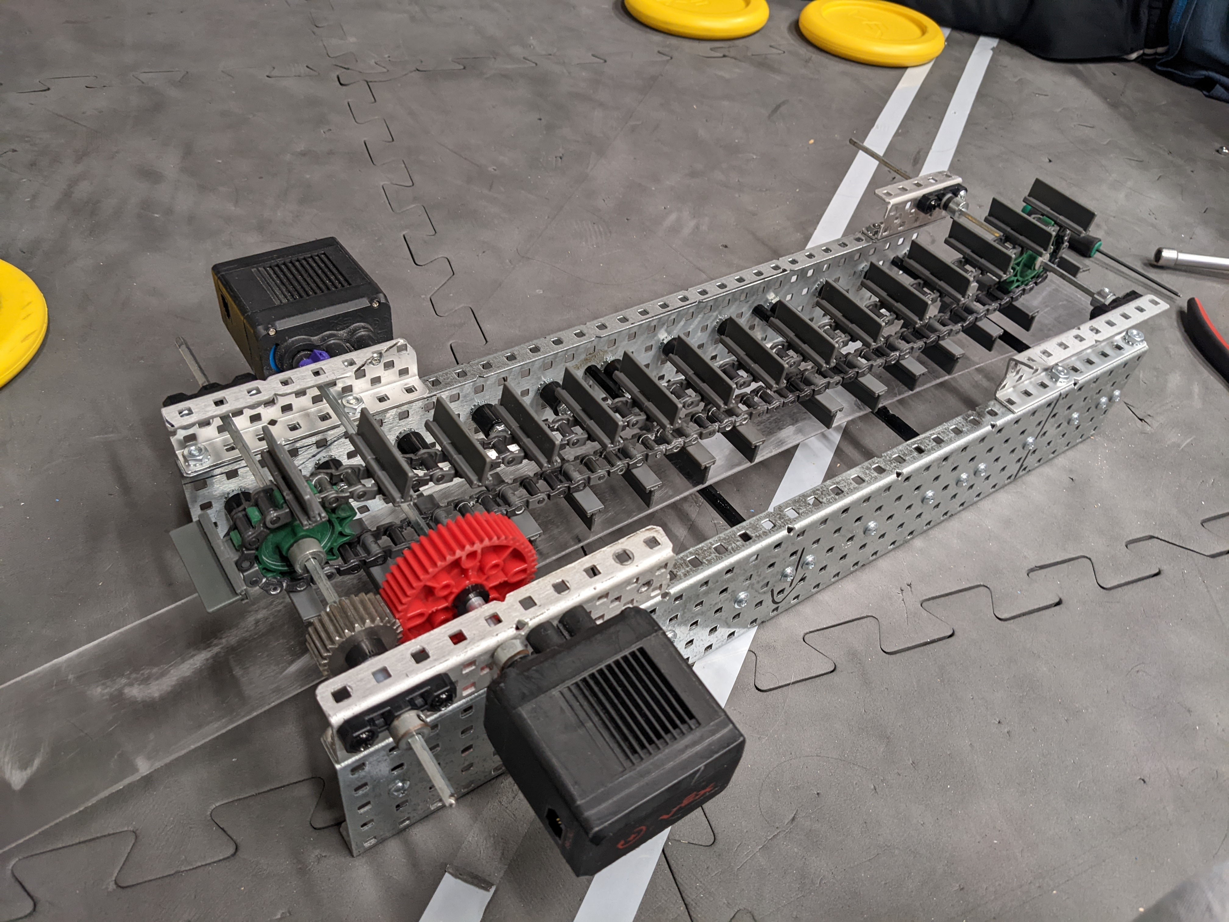 This robot needs a way to intake discs without them being launched through the flywheel. We first wanted to test how far we could push the speed of the design that team 13186A used, so we built something similar. This structure has rollers underneath the disc so the disc has low friction traveling through. We started with what we believe 13186A used and built the conveyor to move at 600rpm. This worked, but would need another mechanism to stop the discs from reaching the flywheel until we wanted them to.