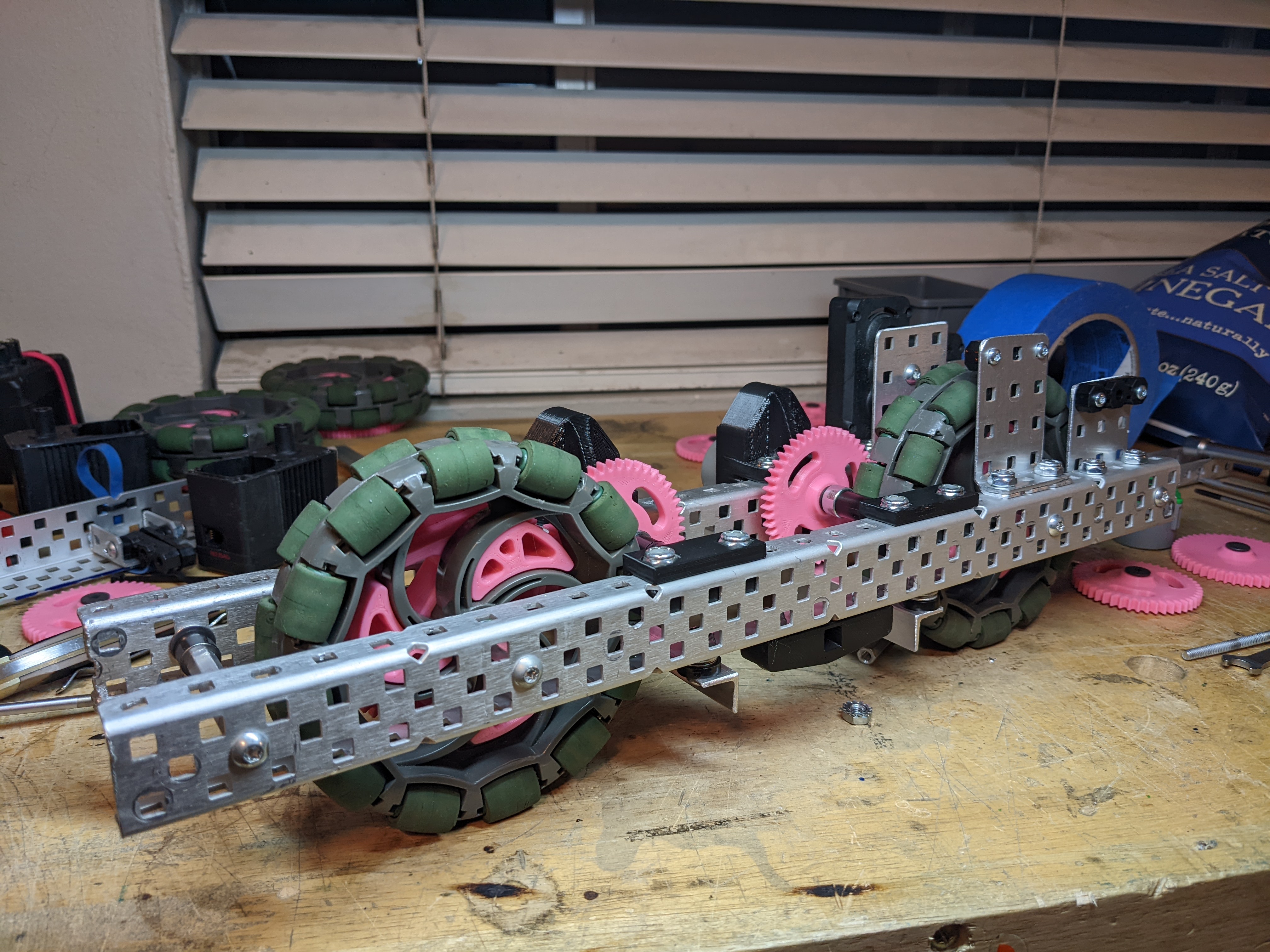 The chassis needed some holes opened or widened to allow clearance for everything. The gears that I designed don't align with the hole pattern on c-channels sadly. The gears I designed for the wheels go into the spokes to give a better mechanical connection between the two.