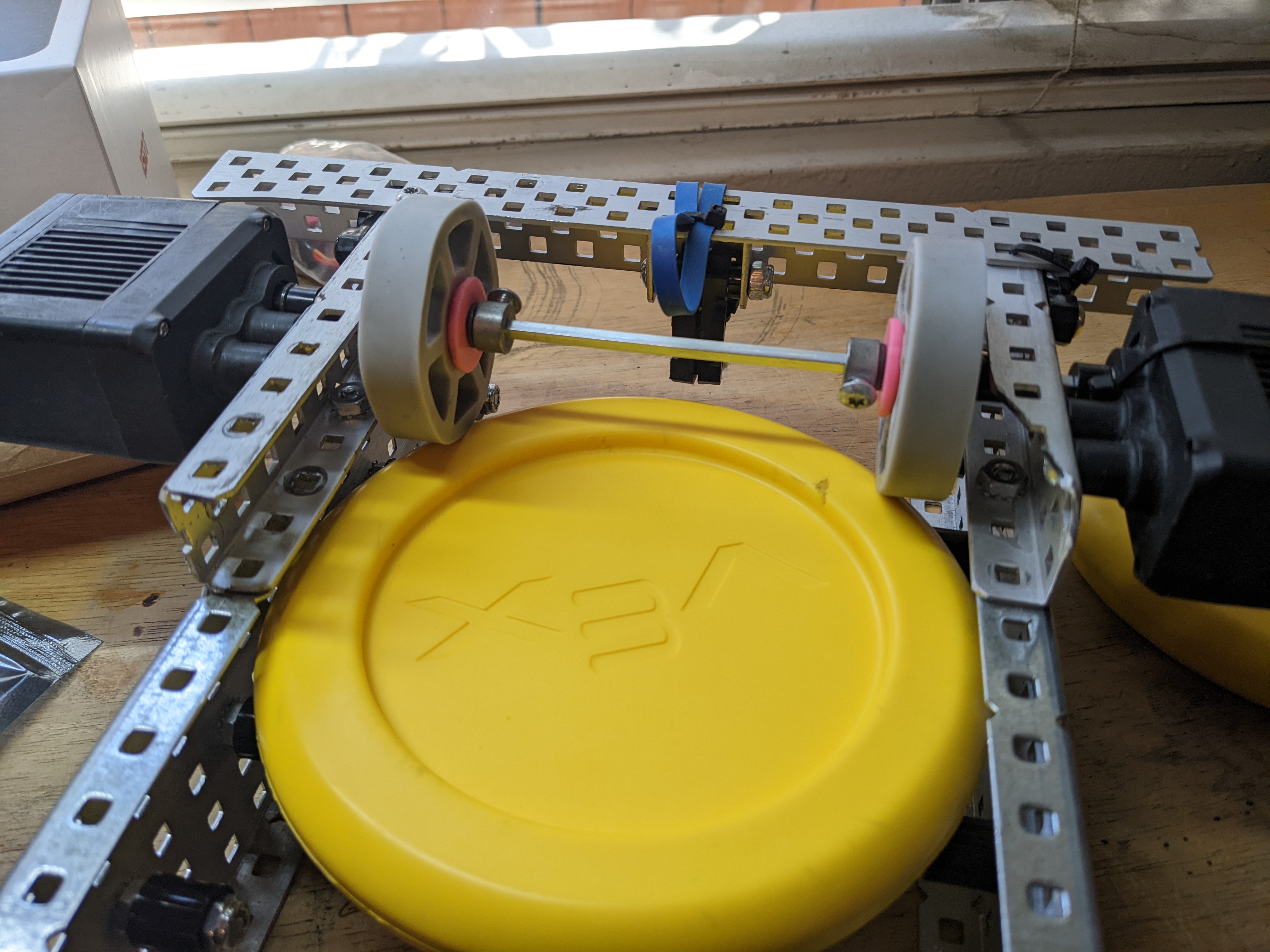 Lucas and I built the flywheel assembly using the same gear ratio as well, 7:3 with the motors using 600rpm cartridges. The results were really good. We tried moving the compression in more and it quickly became too much compression, and if they were any farther apart there would be none. We kept this flywheel distance.