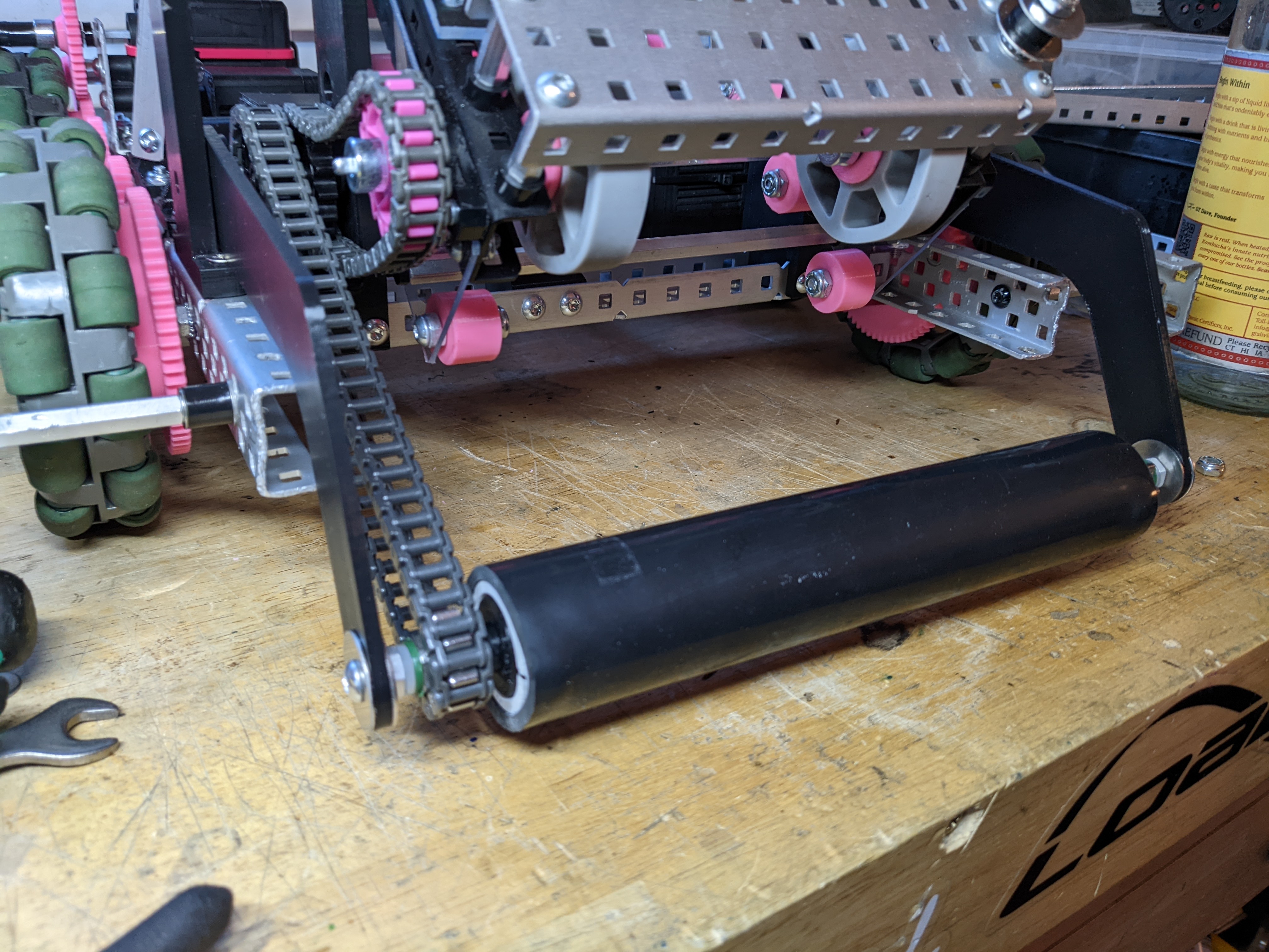 For the actual intake, there is a sprocket on the axle that runs across both towers. A chain will run from that sprocket to the metal sprocket in the video below. The 3D-printed cylinder will be mounted to a piece of PVC that has rubber over it. The intake arm pivots around an extruded cylinder from the tower mounts.