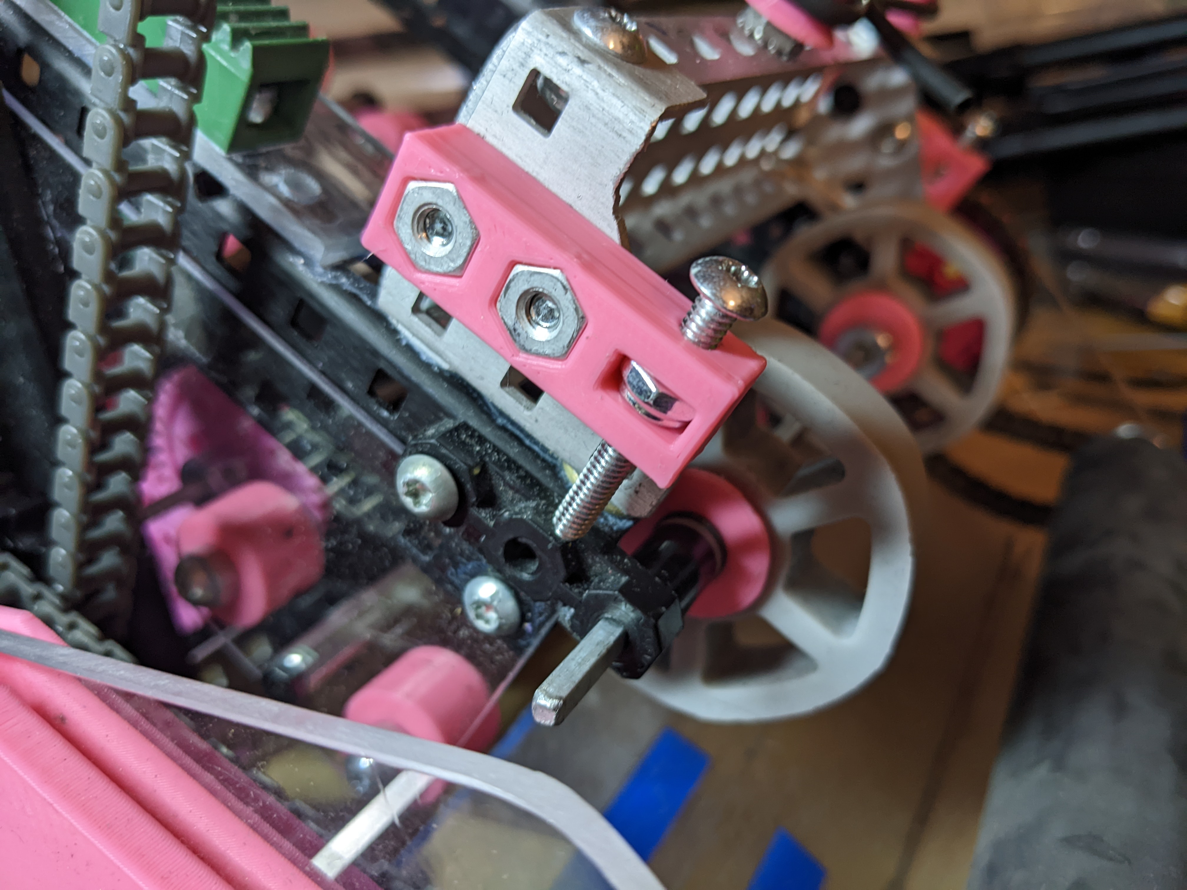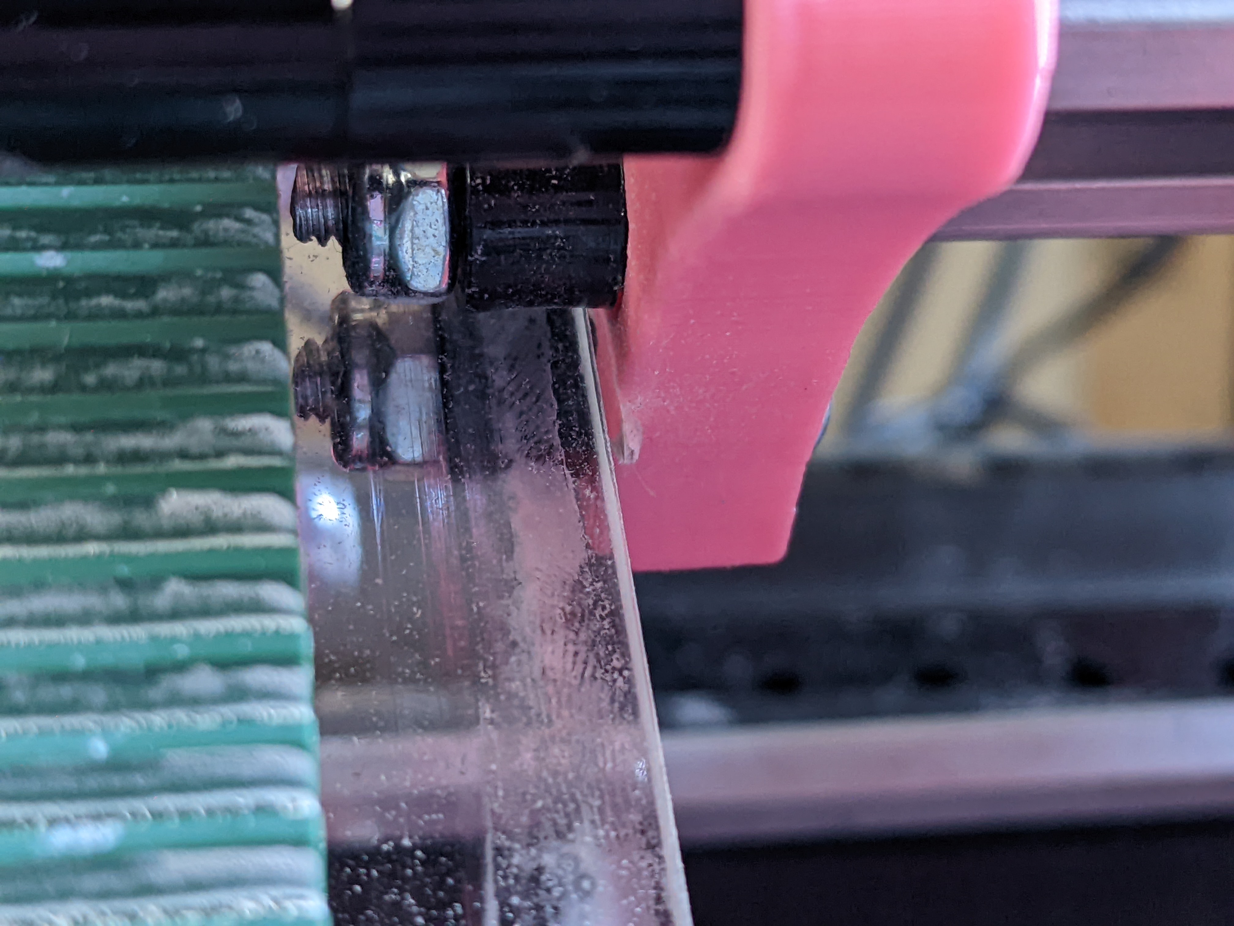 Using various washers and wheels, I designed this piece of polycarbonate to hold the roller in the same place as the image above.
