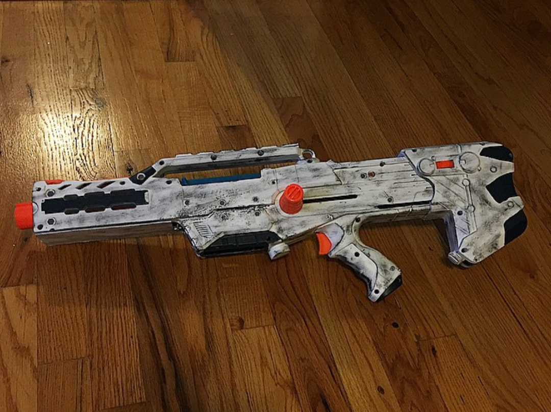 This was a Nerf Longshot that I did minimal modifications to on the exterior functionally. I used a Dremel to cut a portion of the front off to look more streamlined.