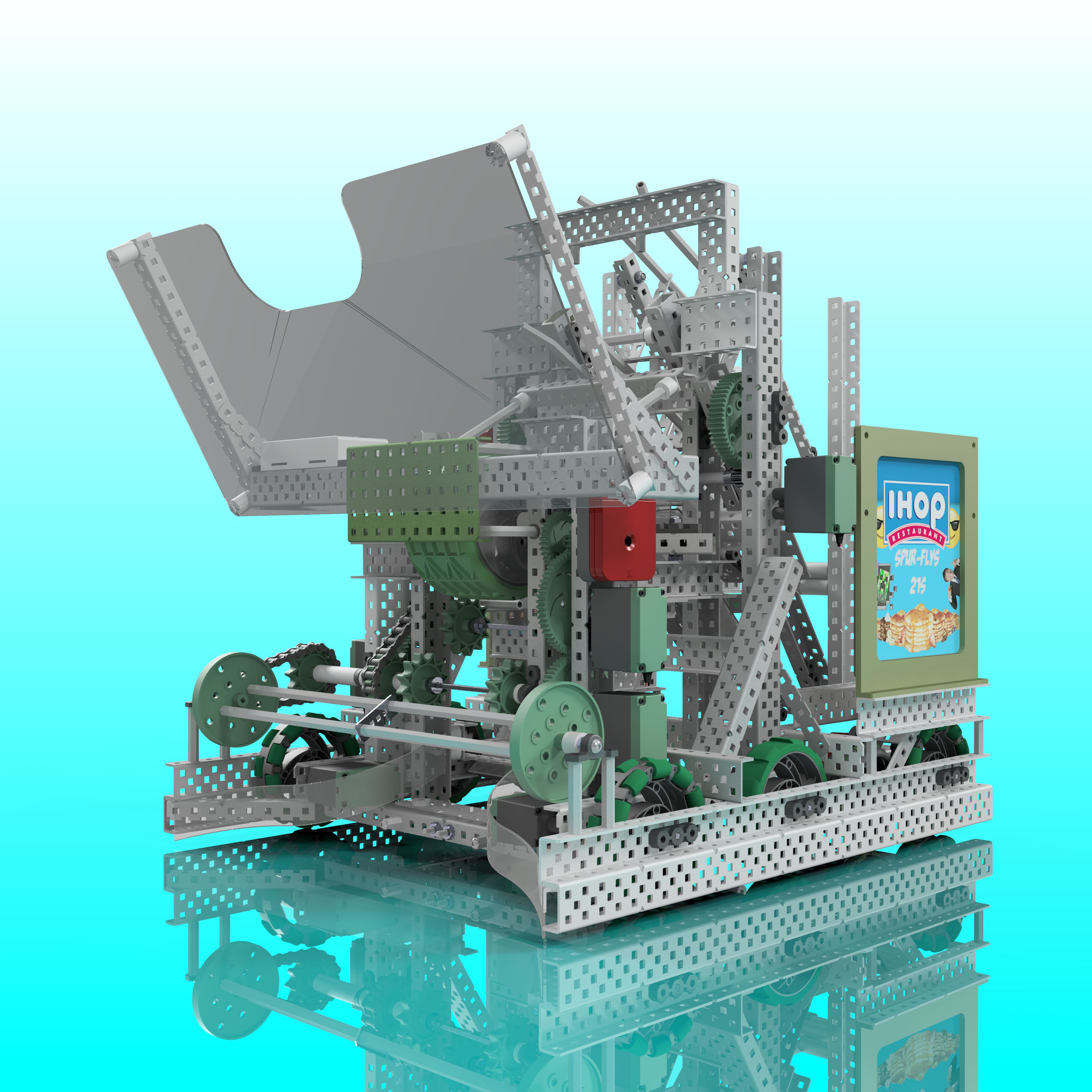 Pancake was my team's first competitive robot of the VRC season Turning Point, my senior year of high school. This robot used a flywheel to shoot hard plastic balls at flags and could pick up and rotate caps to score them on poles.