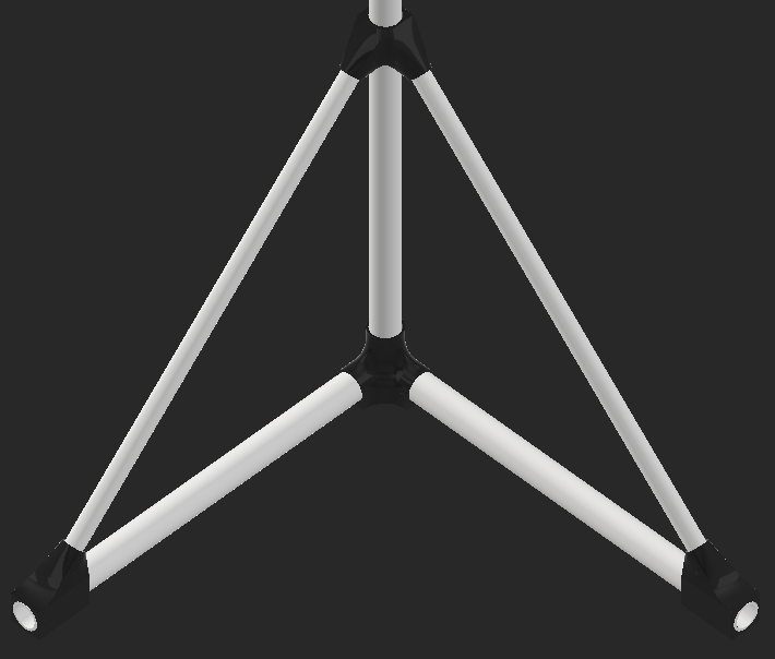 The most complex part of this is the gusset that meets up with the triangle braces. This has to be similar to the base mount shown above, but the "legs" (triangle supports) are all at 45-degree angles to the main pole. This part ties the structure together.