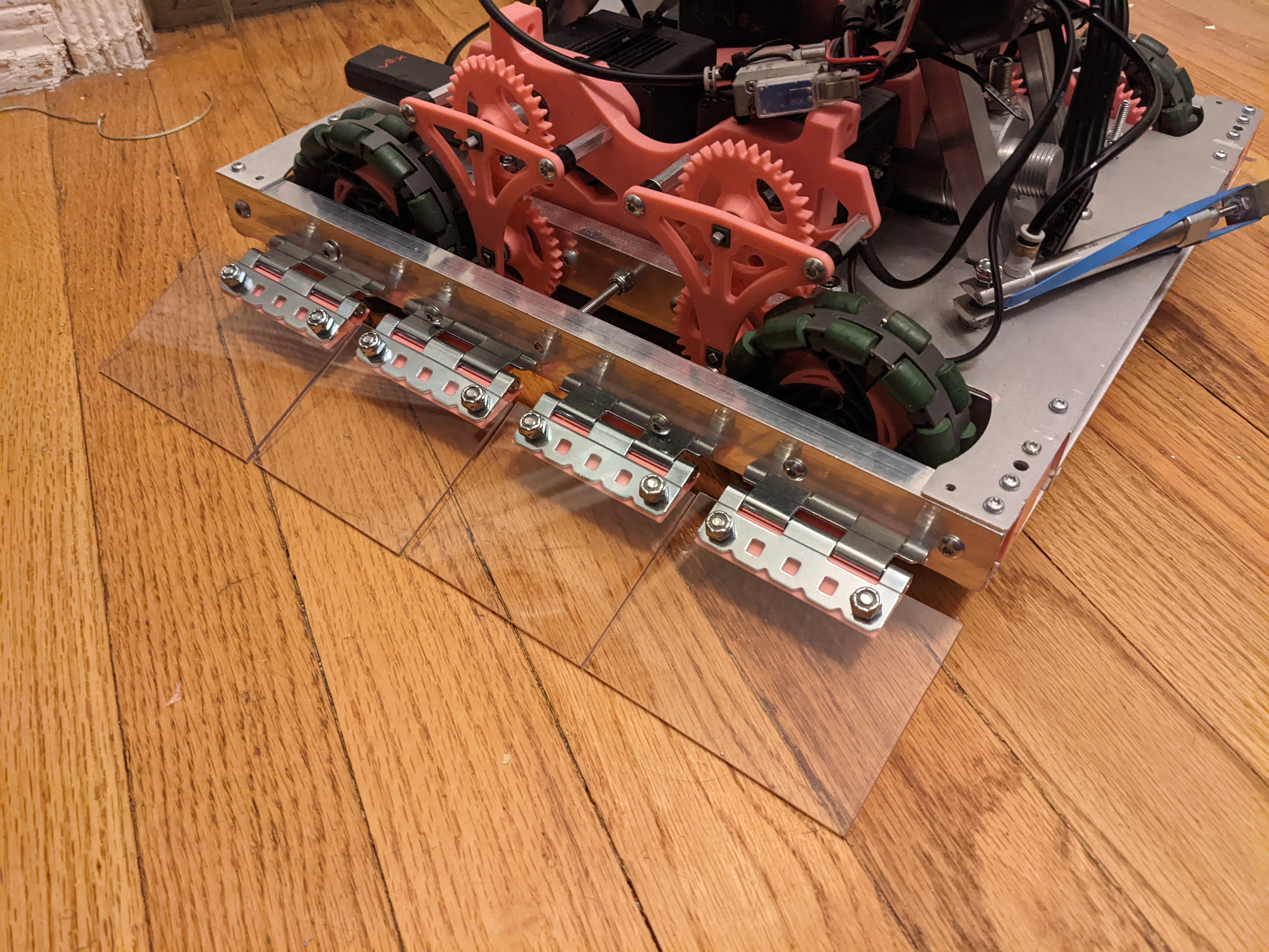 Because pushing discs with a flat surface isn't possession, I made the front of the robot able to turn into an angle. This is still a flat surface, and when I drive along the center line all of the discs will come to my side of the field.