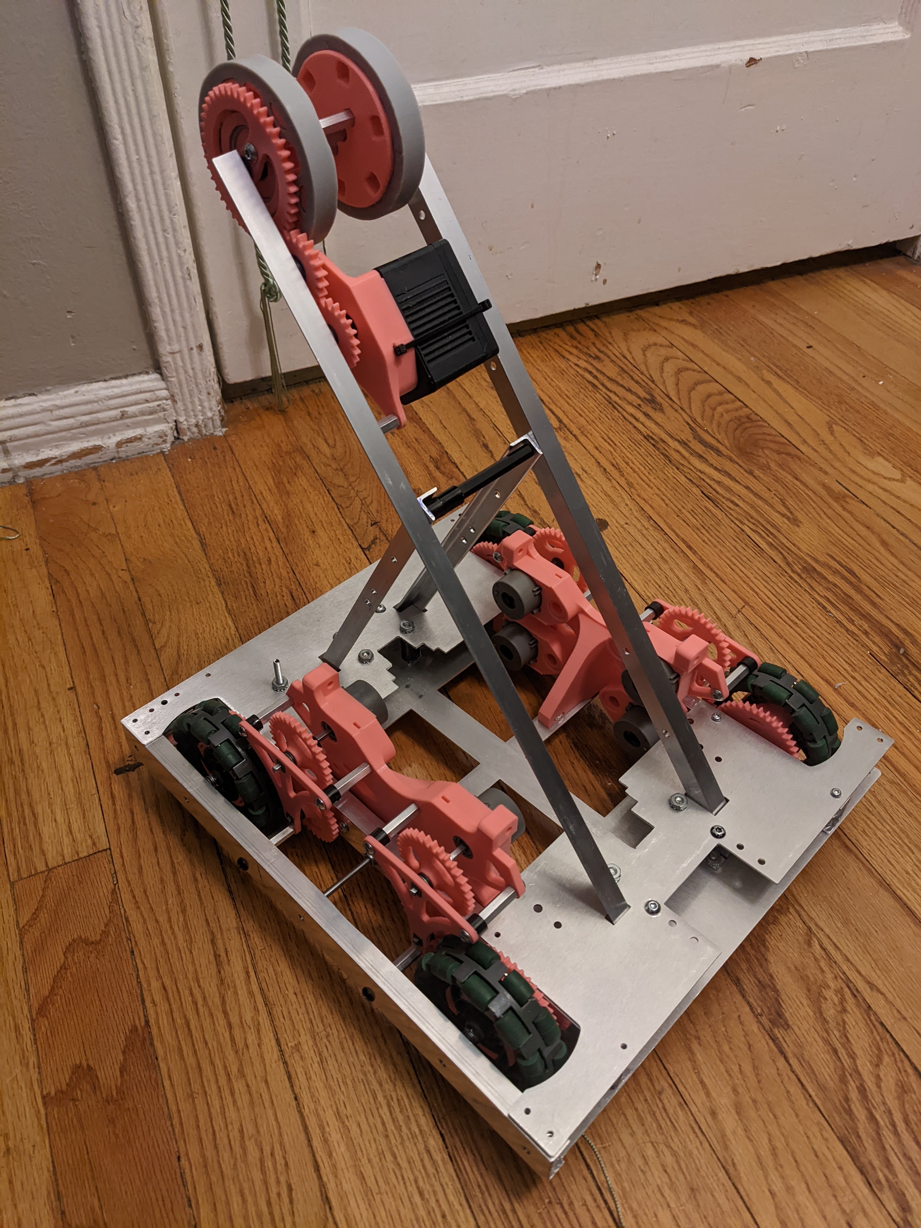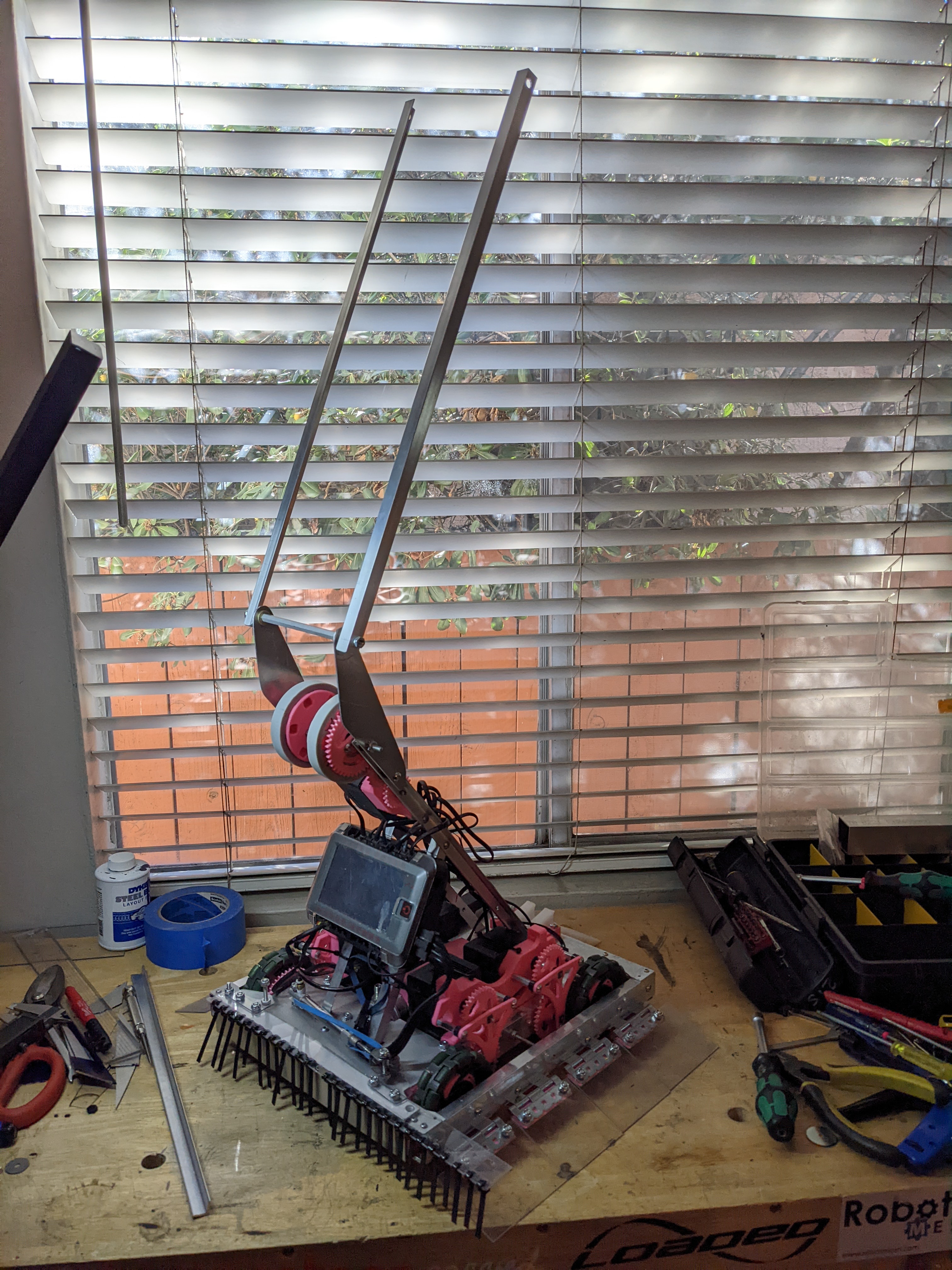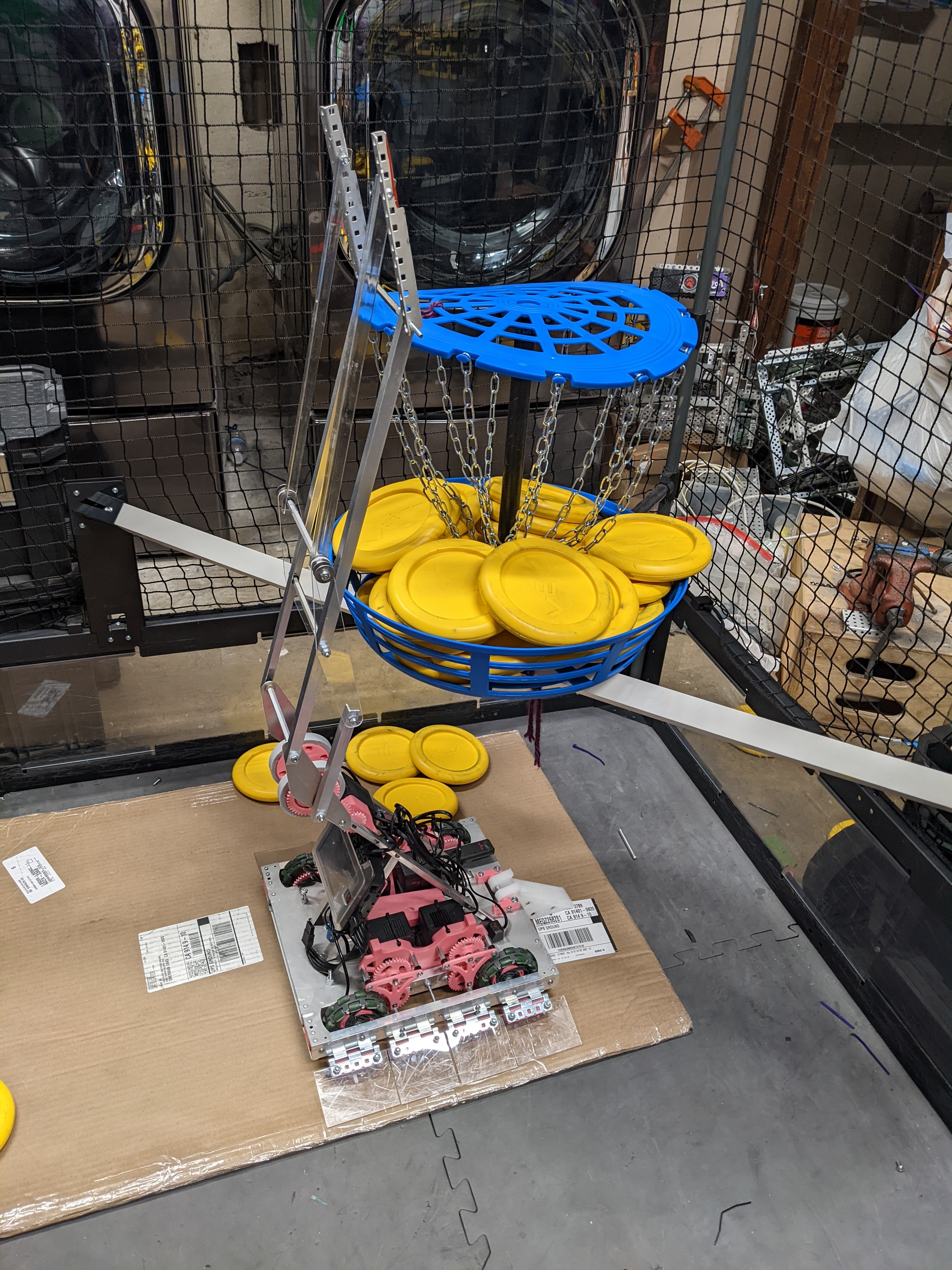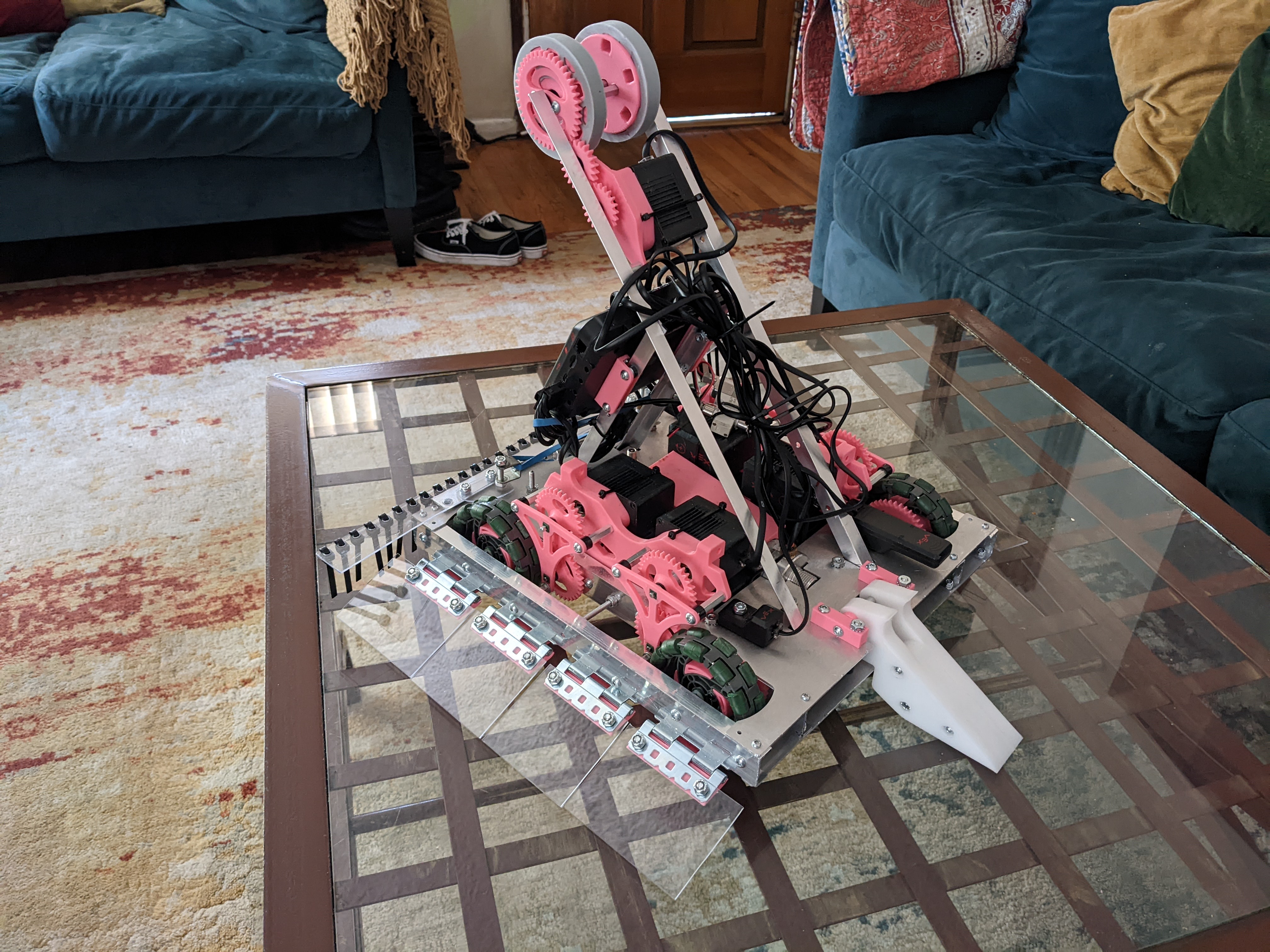 The goal of this robot was to make a robot without a shooter to be as competitive as possible for the VRC game Spin Up. Students liked the idea of this, so they helped create a list of constraints that my robot needed to have:
