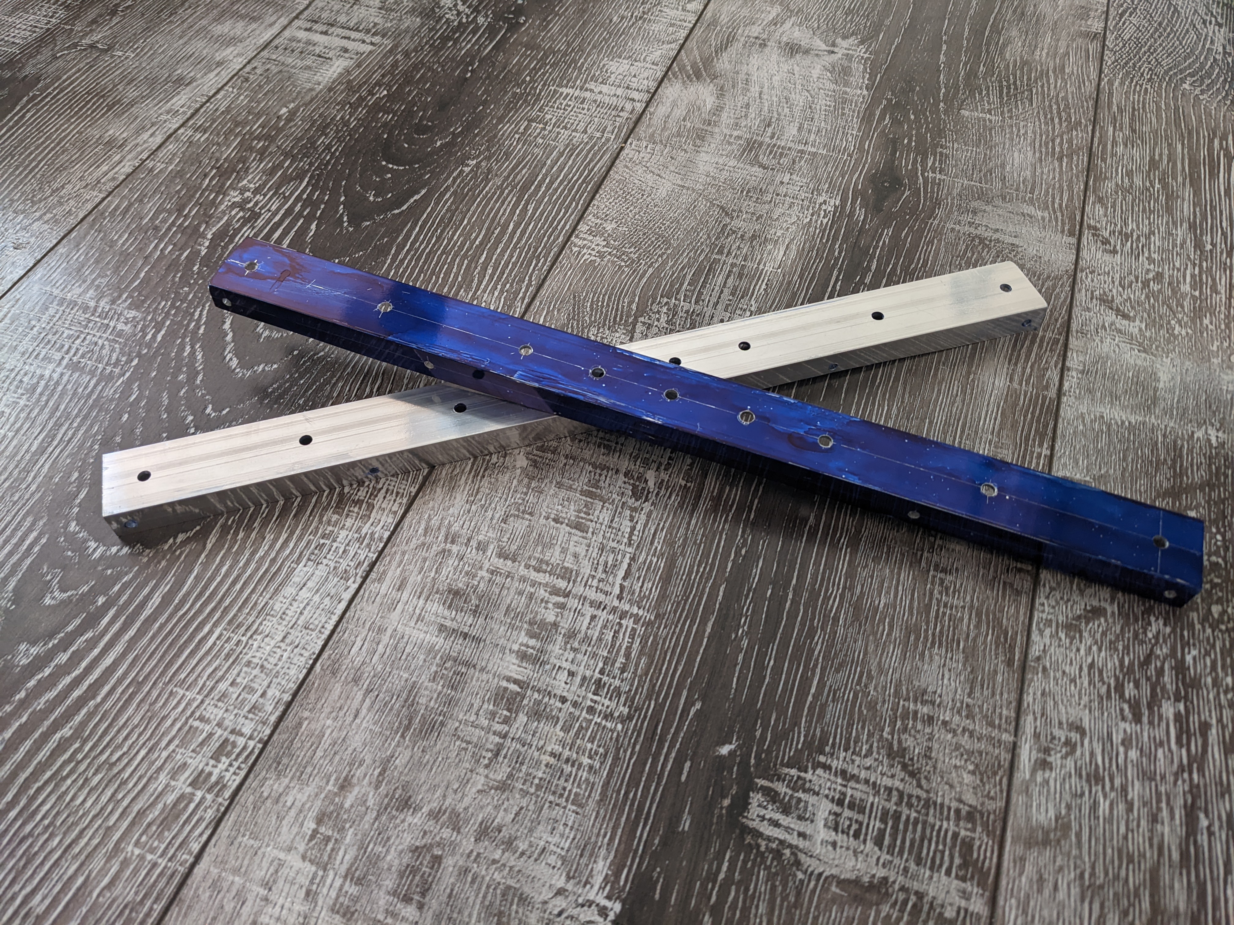I used (too much) Dykem blue to drill the holes in the angles and c-channel. I used calipers (not my nice pair) to scribe lines into the metal, and center punched hole by hole and made new lines based on those holes. This was my first time doing this and it all went really well, the accuracy on everything is more than enough for what this is. This process was repeated for all of the metal on the robot.