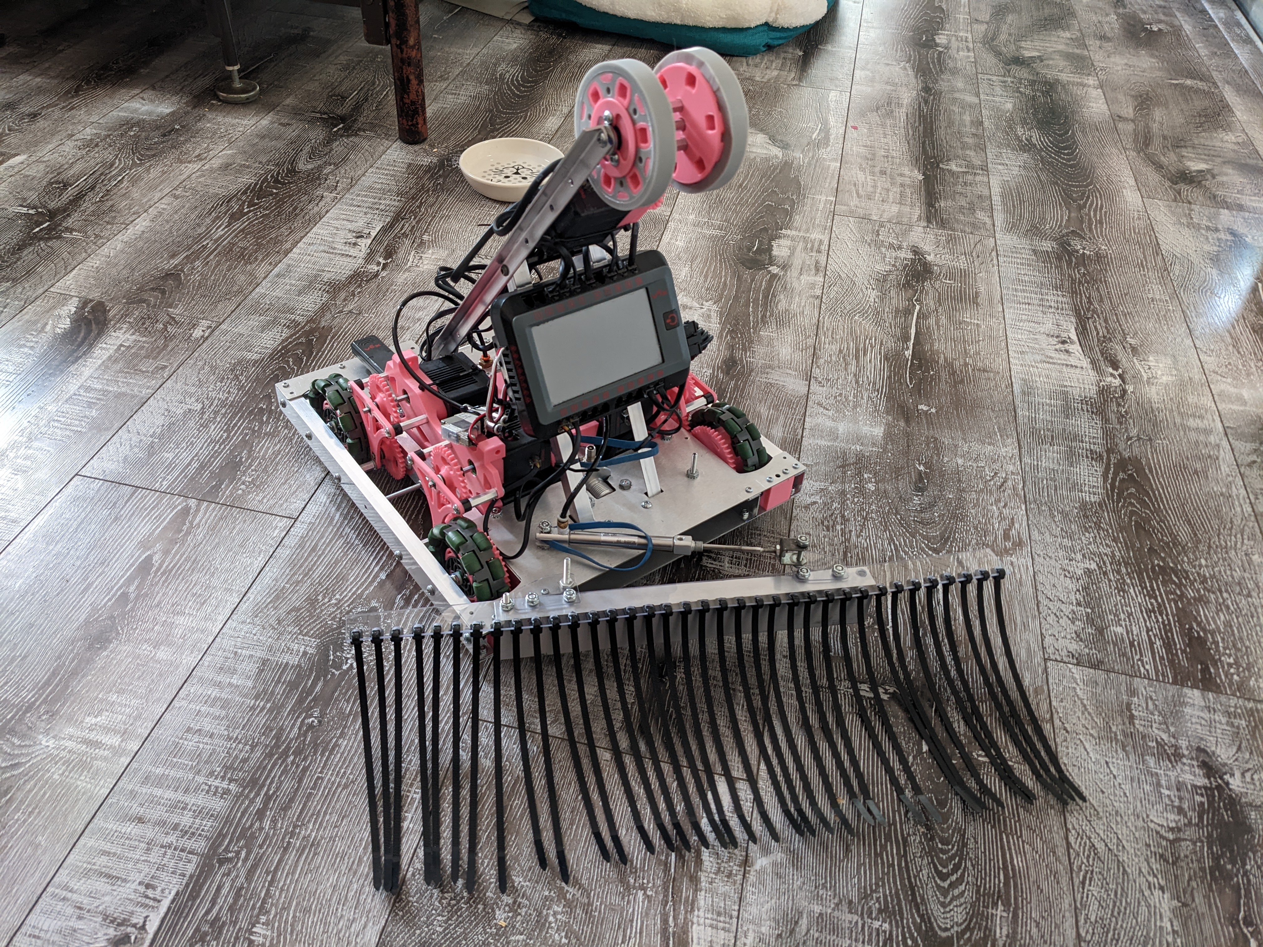 The plow uses zip ties to push discs, these were eventually cut to not touch the floor. I used zip ties because this needed to be stiff enough to push a disc but flexible enough to allow the robot to go over a ~1" barrier, and zip ties accomplished that simply for me.