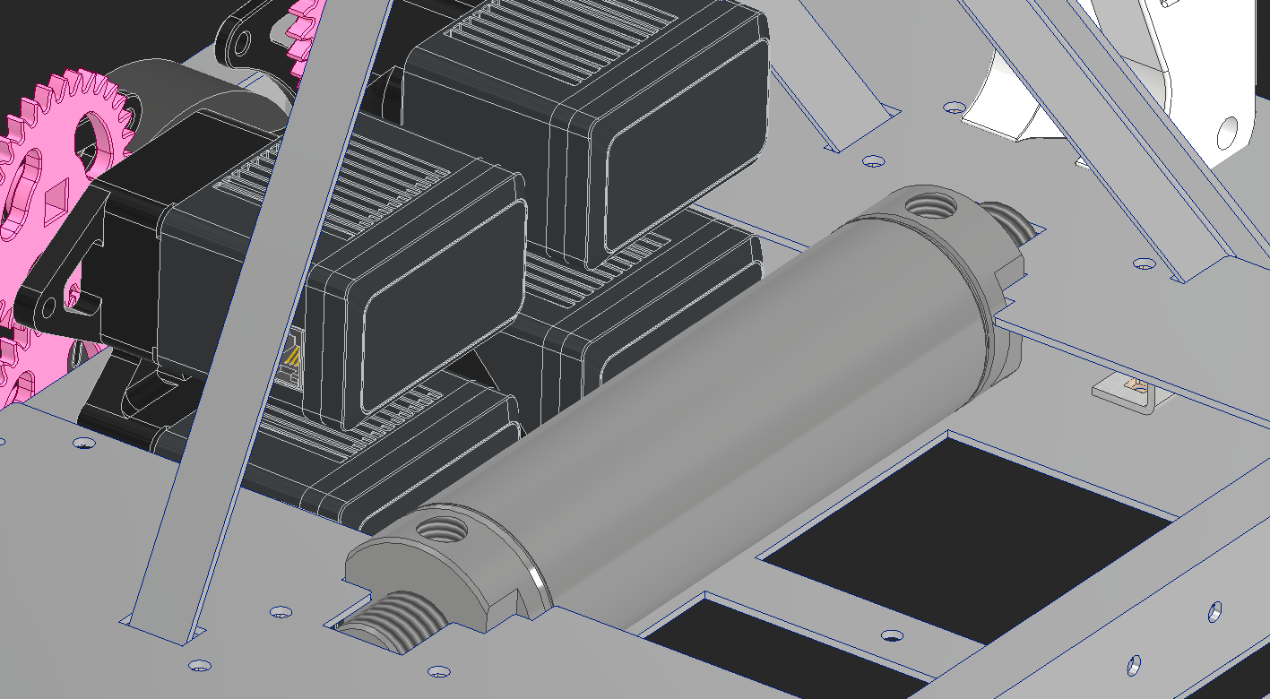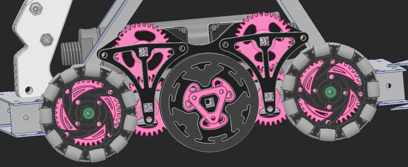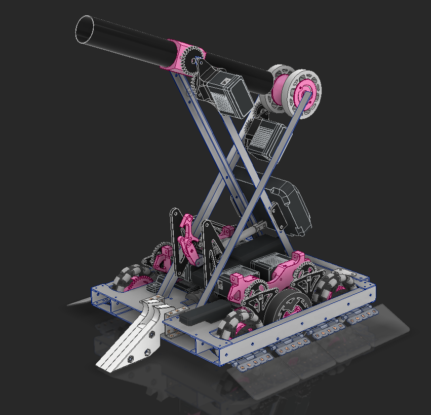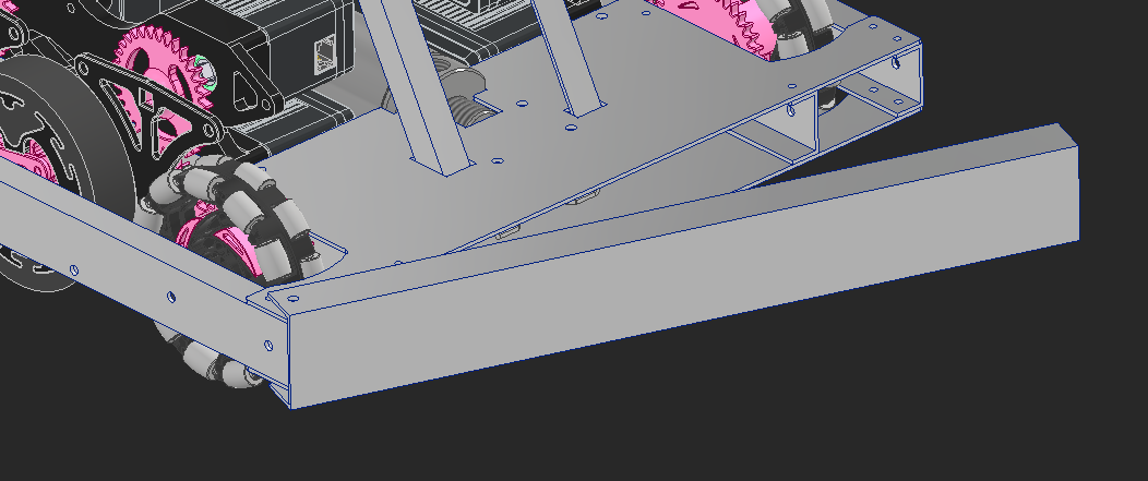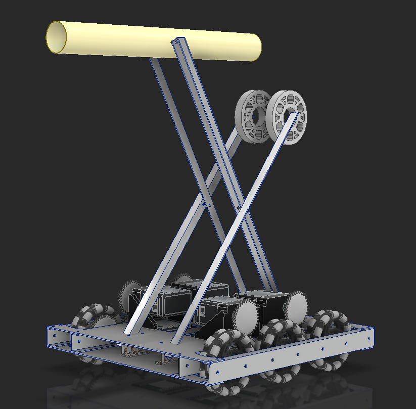 To block shots, we had an idea that we were calling a windmill. This beautiful image made by "CAD" was made to showcase how the structure will work on this robot. With two intersecting diagonals, the structure for a roller and the windmill support each other. This all requires a sturdy enough drive train.