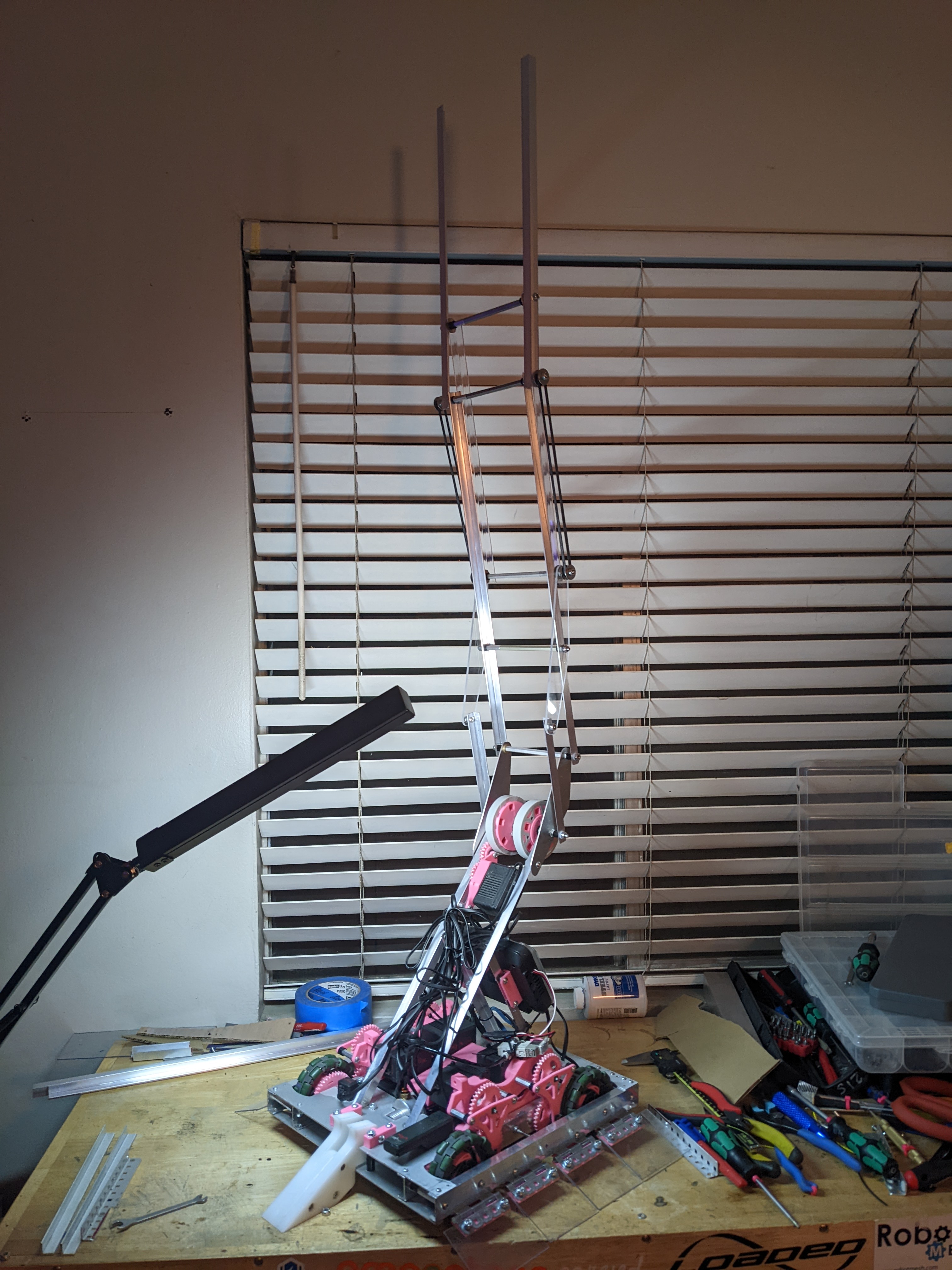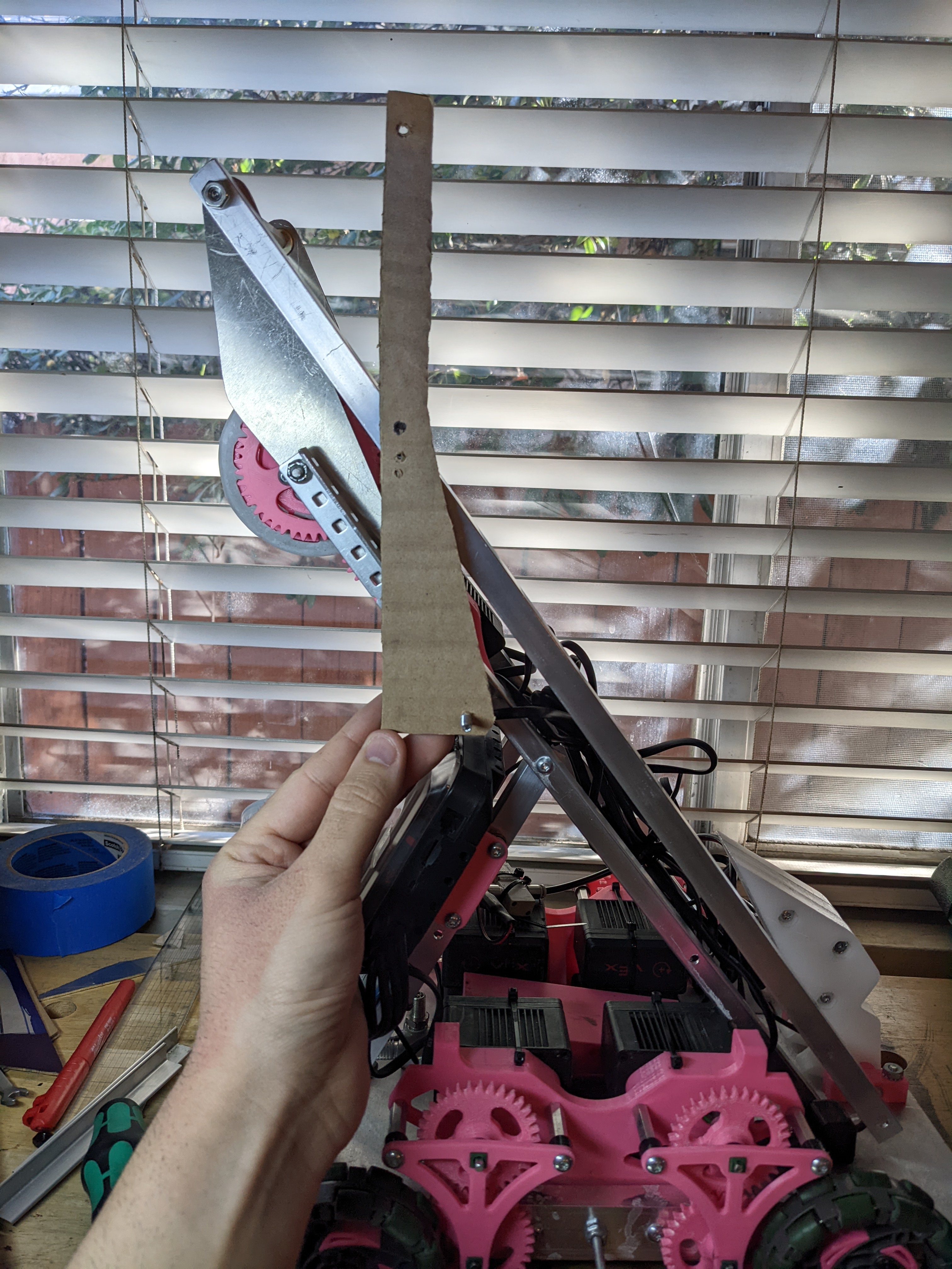I made the top linkage out of some 1/16" polycarbonate angle I had, and this lift was pretty light and able to lift high enough to block the entire goal (which is illegal, but I can do it!). This is still using a prototype final linkage though.