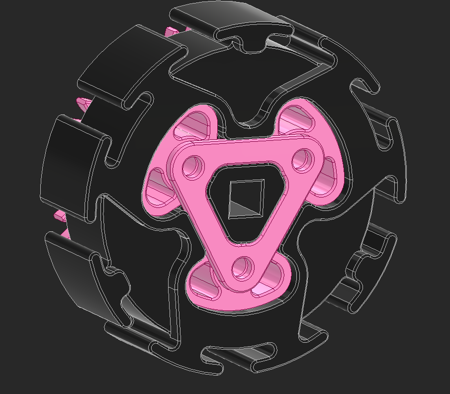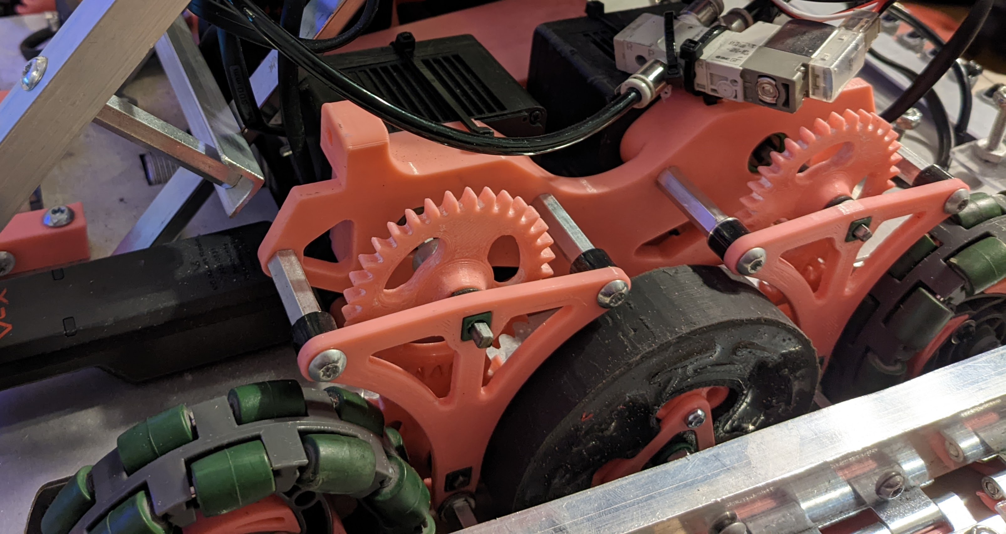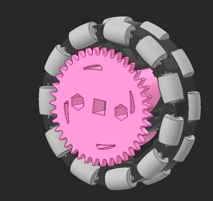 This robot will be doing a lot of pushing and I need to make sure nothing on the drive breaks. For the gears on the omni wheels, I copied the spoke pattern in VEX's 3.25" wheel so this gear interlocks with the wheel. All of the force will get distributed across the print, and screws will be used just to keep it from falling out.