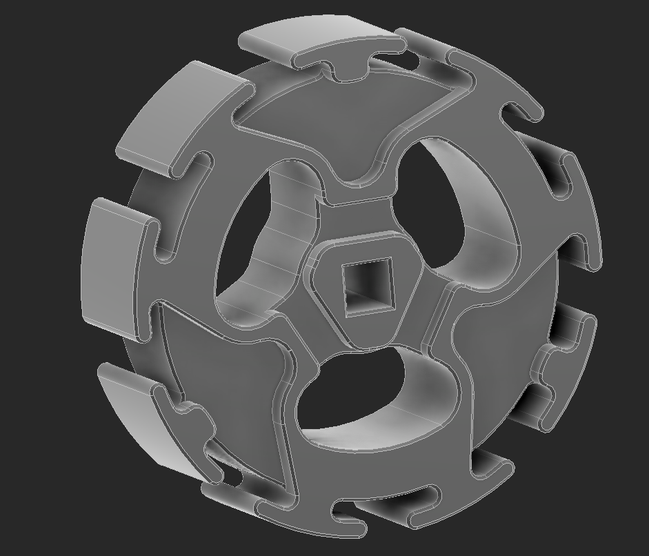 The molded traction wheel gets little T's around it so the rubber will have a harder time falling off. There are also pools of open space around some of the T's to hopefully stop the rubber from peeling off. This is similar to how I've made molded wheels before, so I feel confident this will have no problems.
